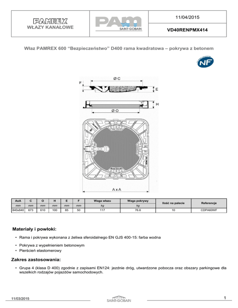 11/04/2015 WŁAZY KANAŁOWE VD40RENPMX414 Właz PAMREX 600 “Bezpieczeństwo” D400 rama kwadratowa – pokrywa z betonem AxA C O H E F Waga włazu Waga pokrywy mm mm mm mm mm mm kg kg 840x840 673 610 100 85 50 117 76.6 Ilość na palecie Referencje 10 CDPA60WF Materiały i powłoki: • Rama i pokrywa wykonana z żeliwa sferoidalnego EN GJS 400-15: farba wodna • Pokrywa z wypełnieniem betonowym • Pierścień elastomerowy Zakres zastosowania: • Grupa 4 (klasa D 400) zgodnie z zapisami EN124: jezdnie dróg, utwardzone pobocza oraz obszary parkingowe dla wszelkich rodzajów pojazdów samochodowych. 11/03/2015 1 11/04/2015 WŁAZY KANAŁOWE VD40RENPMX414 Bardzo intensywne natężenie ruchu, częste inspekcje Główne cechy: • Przegub kulisty oraz ergonomiczna skrzynka manewrowa • • • • • • Blokada otwarcia 90⁰, maksymalne otwarcie 130⁰ Wymienność pokryw Pokrywa z wypełnieniem betonowym Zoptymalizowana rama Identyfikacja modelu Klucz manewrowy C24 Bezpieczeństwo: • Zabezpieczenie antykradzieżowe 11/03/2015 2