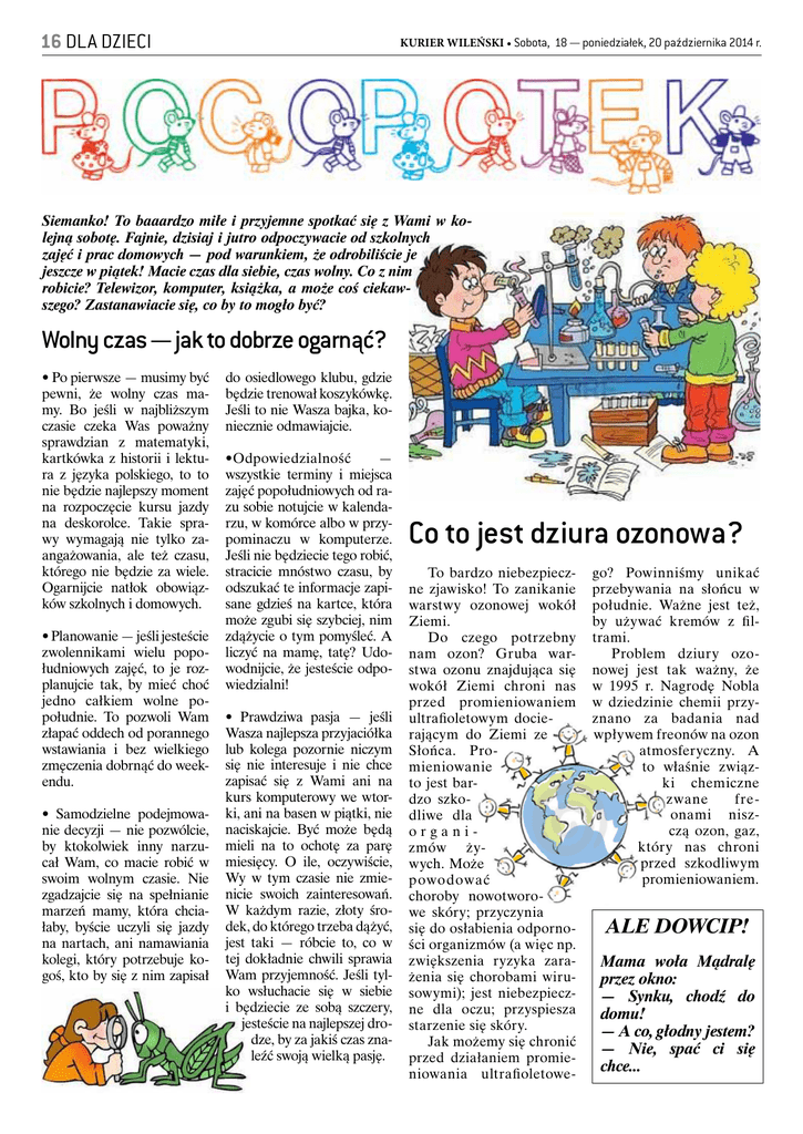 16 DLA DZIECI KURIER WILEŃSKI • Sobota, 18 — poniedziałek, 20 października 2014 r. Siemanko! To baaardzo miłe i przyjemne spotkać się z Wami w kolejną sobotę. Fajnie, dzisiaj i jutro odpoczywacie od szkolnych zajęć i prac domowych — pod warunkiem, że odrobiliście je jeszcze w piątek! Macie czas dla siebie, czas wolny. Co z nim robicie? Telewizor, komputer, książka, a może coś ciekawszego? Zastanawiacie się, co by to mogło być? Wolny czas — jak to dobrze ogarnąć? • Po pierwsze — musimy być pewni, że wolny czas mamy. Bo jeśli w najbliższym czasie czeka Was poważny sprawdzian z matematyki, kartkówka z historii i lektura z języka polskiego, to to nie będzie najlepszy moment na rozpoczęcie kursu jazdy na deskorolce. Takie sprawy wymagają nie tylko zaangażowania, ale też czasu, którego nie będzie za wiele. Ogarnijcie natłok obowiązków szkolnych i domowych. • Planowanie — jeśli jesteście zwolennikami wielu popołudniowych zajęć, to je rozplanujcie tak, by mieć choć jedno całkiem wolne popołudnie. To pozwoli Wam złapać oddech od porannego wstawiania i bez wielkiego zmęczenia dobrnąć do weekendu. • Samodzielne podejmowanie decyzji — nie pozwólcie, by ktokolwiek inny narzucał Wam, co macie robić w swoim wolnym czasie. Nie zgadzajcie się na spełnianie marzeń mamy, która chciałaby, byście uczyli się jazdy na nartach, ani namawiania kolegi, który potrzebuje kogoś, kto by się z nim zapisał do osiedlowego klubu, gdzie będzie trenował koszykówkę. Jeśli to nie Wasza bajka, koniecznie odmawiajcie. •Odpowiedzialność — wszystkie terminy i miejsca zajęć popołudniowych od razu sobie notujcie w kalendarzu, w komórce albo w przypominaczu w komputerze. Jeśli nie będziecie tego robić, stracicie mnóstwo czasu, by odszukać te informacje zapisane gdzieś na kartce, która może zgubi się szybciej, nim zdążycie o tym pomyśleć. A liczyć na mamę, tatę? Udowodnijcie, że jesteście odpowiedzialni! • Prawdziwa pasja — jeśli Wasza najlepsza przyjaciółka lub kolega pozornie niczym się nie interesuje i nie chce zapisać się z Wami ani na kurs komputerowy we wtorki, ani na basen w piątki, nie naciskajcie. Być może będą mieli na to ochotę za parę miesięcy. O ile, oczywiście, Wy w tym czasie nie zmienicie swoich zainteresowań. W każdym razie, złoty środek, do którego trzeba dążyć, jest taki — róbcie to, co w tej dokładnie chwili sprawia Wam przyjemność. Jeśli tylko wsłuchacie się w siebie i będziecie ze sobą szczery, jesteście na najlepszej drodze, by za jakiś czas znaleźć swoją wielką pasję. Co to jest dziura ozonowa? To bardzo niebezpieczne zjawisko! To zanikanie warstwy ozonowej wokół Ziemi. Do czego potrzebny nam ozon? Gruba warstwa ozonu znajdująca się wokół Ziemi chroni nas przed promieniowaniem ultrafioletowym docierającym do Ziemi ze Słońca. Promieniowanie to jest bardzo szkodliwe dla organizmów żywych. Może powodować choroby nowotworowe skóry; przyczynia się do osłabienia odporności organizmów (a więc np. zwiększenia ryzyka zarażenia się chorobami wirusowymi); jest niebezpieczne dla oczu; przyspiesza starzenie się skóry. Jak możemy się chronić przed działaniem promieniowania ultrafioletowe- go? Powinniśmy unikać przebywania na słońcu w południe. Ważne jest też, by używać kremów z filtrami. Problem dziury ozonowej jest tak ważny, że w 1995 r. Nagrodę Nobla w dziedzinie chemii przyznano za badania nad wpływem freonów na ozon atmosferyczny. A to właśnie związki chemiczne zwane freonami niszczą ozon, gaz, który nas chroni przed szkodliwym promieniowaniem. ALE DOWCIP! Mama woła Mądralę przez okno: — Synku, chodź do domu! — A co, głodny jestem? — Nie, spać ci się chce... KURIER WILEŃSKI • Sobota, 18 — poniedziałek, 20 października 2014 r. Rozwiąż test: jakim uczniem jesteś? Poniższy test pomoże Wam odpowiedzieć na pytanie, czy jesteście dobrym uczniem. Rozwiążcie go i pamiętajcie, aby na pytania odpowiadać szczerze! DLA DZIECI 17 Pomóż myszce dotarć do sera i nie wpaść w łapy kotów 1. Czy zawsze notujecie pracę domową, albo zapamiętujecie ją? 2. Czy zawsze macie odrobioną pracę domową? 3. Czy czytacie lektury obowiązkowe? 4. Czy prosicie nauczycieli o wyjaśnienie tematów, których nie rozumiecie? 5. Czy rozwiązujecie zadania dodatkowe, nadobowiązkowe? 6. Czy uczycie się regularnie? 7. Czy pamiętacie o robieniu krótkich przerw w nauce? 8. Czy staracie się zdrowo odżywiać, bo wiecie, jak ważne jest to dla Waszego samopoczucia podczas nauki? 9. Czy pijecie duże ilości wody podczas nauki? 10. Czy wieczorem pakujecie plecak do szkoły, by niczego nie zapomnieć? 11. Czy pamiętacie o zabraniu ze sobą stroju na lekcje w-fu? 12. Czy przekazujecie rodzicom wszystkie informacje, o które proszą nauczyciele? 13. Czy sumiennie wykonujecie polecenia nauczycieli? 14. Czy jesteście pomocni swoim kolegom i koleżankom? 15. Czy zawsze macie ze sobą potrzebne przybory, książki i zeszyty? 16. Czy chętnie bierzecie udział w lekcjach — odpowiadacie na pytania nauczyciela, zgłaszacie się do odpowiedzi, szanujecie odpowiedzi kolegów i koleżanek? Rozwiązanie • Jeśli twierdząco odpowiedzieliście na więcej niż 12 pytań — jesteście bardzo dobrym uczniem, staracie się zawsze być przygotowani do lekcji i chętnie w nich uczestniczycie. Tak trzymać! • Jeśli twierdząco odpowiedzieliście na 8-12 pytań, znaczy to, że jesteście dobrym uczniem. Musicie jednak popracować nad sposobami uczenia i bardziej aktywnym udziałem w lekcjach. • Jeśli odpowiedzieliście twierdząco na mniej niż 8 pytań — przed Wami duuuuużo pracy! Rozkojarzenie i wszelkie inne prace na bok! A po za tym, więcej wiary w siebie! Co robić, by fajnie wyglądać, być zdrowym i dobrze się czuć? Ma na to wpływ to, co jecie! 10 zasad zdrowego żywienia Zasada 5 — jedzcie codzienni