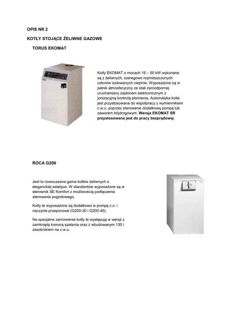 OPIS NR 2 KOTŁY STOJĄCE ŻELIWNE GAZOWE TORUS EKOMAT Kotły EKOMAT o mocach 16 – 50 kW wykonane są z żeliwnych, szeregowo rozmieszczonych członów izolowanych cieplnie. Wyposażone są w palnik atmosferyczny ze stali żaroodpornej uruchamiany zapłonem elektronicznym z jonizacyjną kontrolą płomienia. Automatyka kotła jest przystosowana do współpracy z wymiennikiem c.w.u. poprzez sterowanie dodatkową pompą lub zaworem trójdrogowym. Wersja EKOMAT SR przystosowana jest do pracy bezprądowej. ROCA G200 Jest to nowoczesna gama kotłów żeliwnych o eleganckiej estetyce. W standardzie wyposażone są w sterownik SE Komfort z możliwością podłączenia sterowania pogodowego. Kotły te wyposażone są dodatkowo w pompę c.o. i naczynie przeponowe (G200-30 i G200-40). Na specjalne zamówienie kotły te występują w wersji z zamkniętą komorą spalania oraz z wbudowanym 130 l zasobnikiem na c.w.u. ROCA G1000 Kotły G1000 zbudowane są z wieloczłonowego żeliwnego korpusu. Palnik gazowy atmosferyczny posiada dwa stopnie mocy (60/100%) i elektroniczny zapłon (z jonizacyjną kontrolą płomienia) poprzez palnik pilotowy działający impulsywnie. Ponadto kotły te wyposażone są w przerywacz ciągu i tablicę kontrolną CC-170 w wersji podstawowej (sterowanie ręczne) – bez programatora tygodniowego (z możliwością rozbudowy automatyki m.in. poprzez moduły pogodowy i kaskadowy). Wysoka sprawność kotłów wynosi 94%. Kotły te przeznaczone są do obwodów grzewczych o temperaturze wody 105 0C i ciśnieniu do 5 bar.