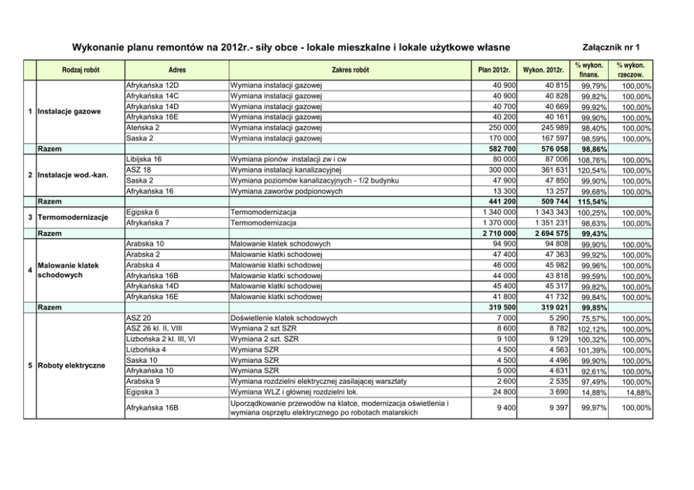 Wykonanie planu remontów na 2012r.- siły obce - lokale mieszkalne i lokale użytkowe własne Rodzaj robót 1 Instalacje gazowe Adres Zakres robót Afrykańska 12D Afrykańska 14C Afrykańska 14D Afrykańska 16E Ateńska 2 Saska 2 Wymiana instalacji gazowej Wymiana instalacji gazowej Wymiana instalacji gazowej Wymiana instalacji gazowej Wymiana instalacji gazowej Wymiana instalacji gazowej Libijska 16 ASZ 18 Saska 2 Afrykańska 16 Wymiana pionów instalacji zw i cw Wymiana instalacji kanalizacyjnej Wymiana poziomów kanalizacyjnych - 1/2 budynku Wymiana zaworów podpionowych Egipska 6 Afrykańska 7 Termomodernizacja Termomodernizacja Arabska 10 Arabska 2 Arabska 4 Afrykańska 16B Afrykańska 14D Afrykańska 16E Malowanie klatek schodowych Malowanie klatki schodowej Malowanie klatki schodowej Malowanie klatki schodowej Malowanie klatki schodowej Malowanie klatki schodowej ASZ 20 ASZ 26 kl. II, VIII Lizbońska 2 kl. III, VI Lizbońska 4 Saska 10 Afrykańska 10 Arabska 9 Egipska 3 Doświetlenie klatek schodowych Wymiana 2 szt SZR Wymiana 2 szt. SZR Wymiana SZR Wymiana SZR Wymiana SZR Wymiana rozdzielni elektrycznej zasilającej warsztaty Wymiana WLZ i głównej rozdzielni lok. Afrykańska 16B Uporządkowanie przewodów na klatce, modernizacja oświetlenia i wymiana osprzętu elektrycznego po robotach malarskich Razem 2 Instalacje wod.-kan. Razem 3 Termomodernizacje Razem 4 Malowanie klatek schodowych Razem 5 Roboty elektryczne Plan 2012r. Załącznik nr 1 Wykon. 2012r. % wykon. finans. % wykon. rzeczow. 40 900 40 900 40 700 40 200 250 000 170 000 582 700 80 000 300 000 47 900 13 300 441 200 1 340 000 1 370 000 2 710 000 94 900 47 400 46 000 44 000 45 400 41 800 319 500 7 000 8 600 9 100 4 500 4 500 5 000 2 600 24 800 40 815 40 828 40 669 40 161 245 989 167 597 576 058 87 006 361 631 47 850 13 257 509 744 1 343 343 1 351 231 2 694 575 94 808 47 363 45 982 43 818 45 317 41 732 319 021 5 290 8 782 9 129 4 563 4 496 4 631 2 535 3 690 99,79% 99,82% 99,92% 99,90% 98,40% 98,59% 98,86% 108,76% 120,54% 99,90% 99,68% 115,54% 100,25% 98,63% 99,43% 99,90% 99,92% 99,96% 99,59% 99,82% 99,84% 99,85% 75,57% 102,12% 100,32% 101,39% 99,90% 92,61% 97,49% 14,88% 100,00% 100,00% 100,00% 100,00% 100,00% 100,00% 9 400 9 397 99,97% 100,00% 100,00% 100,00% 100,00% 100,00% 100,00% 100,00% 100,00% 100,00% 100,00% 100,00% 100,00% 100,00% 100,00% 100,00% 100,00% 100,00% 100,00% 100,00% 100,00% 14,88% Arabska 2 Uporządkowanie przewodów na klatce, modernizacja oświetlenia i wymiana osprzętu elektrycznego po robotach malarskich 8 300 8 278 99,74% 100,00% Arabska 4 Uporządkowanie przewodów na klatce, modernizacja oświetlenia i wymiana osprzętu elektrycznego po robotach malarskich 8 600 8 600 100,00% 100,00% Arabska 10 Uporządkowanie przewodów na klatce i wymiana osprzętu elektrycznego po robotach malarskich 7 100 7 060 99,44% 100,00% 10 000 10 000 3 000 1 500 1 500 1 500 1 500 800 800 800 1 600 1 600 1 600 1 600 1 600 1 600 1 600 1 600 1 600 1 600 1 600 1 600 7 380 4 967 2 913 1 436 1 436 1 436 1 467 784 784 752 1 580 1 580 1 580 1 580 1 595 1 588 1 588 1 595 1 673 1 599 1 599 1 599 73,80% 49,67% 97,09% 95,72% 95,72% 95,72% 97,81% 98,00% 98,00% 94,01% 98,74% 98,74% 98,74% 98,74% 99,71% 99,26% 99,26% 99,71% 104,55% 99,91% 99,91% 99,91% 73,80% 49,67% 100,00% 100,00% 100,00% 100,00% 100,00% 100,00% 100,00% 100,00% 100,00% 100,00% 100,00% 100,00% 100,00% 100,00% 100,00% 100,00% 100,00% 100,00% 100,00% 100,00% 7 500 7 435 99,13% 100,00% 9 700 9 697 99,97% 100,00% 9 000 8 563 95,14% 100,00% 3 600 3 582 99,49% 100,00% Budynki Osiedla Teren Osiedla Arabska 6, Arabska 8 Nubijska 6 Nubijska 8 Egipska 3 Afrykańska 5A Afrykańska 5 Arabska 8A Arabska 8B Afrykańska 12A 5 Roboty elektryczne c.d. Afrykańska 12B Afrykańska 12C Afrykańska 12D Afrykańska 12E Afrykańska 14B Afrykańska 14C Afrykańska 14E Afrykańska 14F Afrykańska 16A Afrykańska 16C Afrykańska 16D Roboty elektryczne - awaryjne, dewastacje i inne drobne Oświetlenie - roboty awaryjne, dewastacje i inne drobne Reorganizacja oświetlenia i wymiana opraw nocnych na kl. schodowej Reorganizacja oświetlenia i wymiana opraw nocnych na kl. schodowej Reorganizacja oświetlenia i wymiana opraw nocnych na kl. schodowej Reorganizacja oświetlenia i wymiana opraw nocnych na kl. schodowej Reorganizacja oświetlenia i wymiana opraw nocnych na kl. schodowej Wymiana opraw oświetlenia nocnego kl. schod. Wymiana opraw oświetlenia nocnego kl. schod. Modernizacja oświetlenia klatki schodowej Reorganizacja oświetlenia i wymiana opraw nocnych na kl. schodowej Reorganizacja oświetlenia i wymiana opraw nocnych na kl. schodowej Reorganizacja oświetlenia i wymiana opraw nocnych na kl. schodowej Reorganizacja oświetlenia i wymiana opraw nocnych na kl. schodowej Reorganizacja oświetlenia i wymiana opraw nocnych na kl. schodowej Reorganizacja oświetlenia i wymiana opraw nocnych na kl. schodowej Reorganizacja oświetlenia i wymiana opraw nocnych na kl. schodowej Reorganizacja oświetlenia i wymiana opraw nocnych na kl. schodowej Reorganizacja oświetlenia i wymiana opraw nocnych na kl. schodowej Reorganizacja oświetlenia i wymiana opraw nocnych na kl. schodowej Reorganizacja oświetlenia i wymiana opraw nocnych na kl. schodowej Reorganizacja oświetlenia i wymiana opraw nocnych na kl. schodowej Reorganizacja oświetlenia, wymiana osprzętu, montaż kanałów Afrykańska 14D instalacyjnych dla przewodów teletechn. Reorganizacja oświetlenia, wymiana osprzętu, montaż kanałów Afrykańska 16E instalacyjnych dla przewodów teletechn. Rejon ulic Egipska, Afryk., Wymiana 27 tabliczek bezpiecznikowych oraz remont drzwiczek w Ateńska, Arabska słupach oświetlenia zewnętrznego Przystosowanie instalacji zasilającej oświetlenie osiedlowe do zasilania Teren pomiędzy Afryk. 12 i 16 instalacji kamer monitoringu Afrykańska 12A,16B, Saska 2 5 Roboty elektryczne c.d. Egipska 5 Libijska 16 Arabska 9 Razem 6 Dokumentacja Razem Inne remonty Projekty techniczne i audyty energetyczne