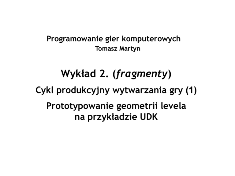 Programowanie gier komputerowych Tomasz Martyn Wykład 2. (fragmenty) Cykl produkcyjny wytwarzania gry (1) Prototypowanie geometrii levela na przykładzie UDK Prototypowanie geometrii levela w UDK Edytor leveli Prototypowanie geometrii levela w UDK Builder Brush i BSP Brush • Builder Brush służy do tworzenia BSP Brush'y o kształcie określonym Builder Brushem. • Jest jeden Builder Brush i (zwykle) wiele BSP Brushy. • Każdy z BSP Brushy reprezentuje sobą jedną z dwóch operacji CSG (Constructive Solid Geometry), której zakres działania wyznacza geometria BSP Brusha. Są to operacje Add i Substract. Prototypowanie geometrii levela w UDK CSG: Add i Substract • W przypadku operacji Add, BSP Brush generuje geometrię BSP o kształcie określonym tym Brushem. • Operacja Substract usuwa geometrię istniejącą w objętości wyznaczonej zakresem Brusha substraktywnego. Prototypowanie geometrii levela w UDK CSG: Kolejność operacji • Na wynikową geometrię BSP ma wpływ kolejność wykonywanych operacji CSG. • W UDK pożądaną kolejność działania poszczególnych BSP Brushy można określić przy użyciu opcji Order I To First i Order I To Last. Prototypowanie geometrii levela w UDK CSG: Intersect i Deintersect • Do dyspozycji są jeszcze operacje Intersect i Deintersect. • W odróżnieniu od operacji Add i Substract, służą one do modyfikowania geometrii Builder Brusha na podstawie geometrii BSP generowanej przez BSP Brushe. • Intersect usuwa z Builder Brusha część nie należącą do przecięcia z geometrą CSG. • Deintersect usuwa z Builder Brusha część należącą do przecięcia z geometrą CSG. Uwaga: Działanie tych operatorów bywa nieokreślone dla geometrii BSP nie zawierającej geometrii addytywnej i ich użycie w takim przypadku może powodować niestabilne funkcjonowanie edytora. Problem taki może również wystąpić w przypadku przypisania tych operacji BSP Brush’om . Prototypowanie geometrii levela w UDK Transformacje Poszczególne Brushe można poddawać standardowym transformacjom przestrzennym przy użyciu odpowiednich widgetów transformacji: • translacji, • obrotów, • skalowania jednorodnego, • skalowanie niejednorodnego. Prototypowanie geometrii levela w UDK Edytowanie geometrii Brusha • Edytowanie geometrii Brusha odbywa się w trybie Geometry Mode. • Tryb ten oferuje różne narzędzia edytowania. • Edycji może podlegać zarówno Builder Brush jak i BSP Brush. • W zależności używanego narzędzia, edycja może odbywać się na poziomie wierzchołków, krawędzi lub ścian. Prototypowanie geometrii levela w UDK Geometry Tools - Edit Translacja wierzchołka Split Weld Narzędzie Edit umożliwia m.in. : • dokonywanie transformacji wybranych wierzchołków, krawędzi lub ścian, • usuwanie wybranych wierzchołków, krawędzi lub ścian (Delete), • dodanie zamkniętego cyklu nowych wierzchołków począwszy od wybranej krawędzi (Split); • scalanie wybranych wierzchołków w jeden (Weld), • dokonanie triangulacji Brusha lub jego wybranej części (Triangulate), • dokonanie optymalizacji geometrii (Optimize), • zmianę zwrotu wektora normalnego ściany (Flip). Narzędzie może być zastosowane zarówno do Builder Brusha i BSP Brusha. Prototypowanie geometrii levela w UDK Geometry Tools - Extrude • Narzędzie Extrude umożliwia tworzenie nowych „modułów geometrycznych” w Brushu poprzez wybranie jednej ze ścian i następnie jej translację. • Narzędzie może być zastosowane zarówno do Builder Brusha i BSP Brusha. Prototypowanie geometrii levela w UDK Geometry Tools - Pen • Narzędzie Pen służy do tworzenia Builder Brusha na podstawie wielokąta 2D „narysowanego” w jednym z widoków ortogonalnych. • Tworzenie Builder Brusha na podstawie wielokąta może nastąpić w jednym z dwóch trybów: 1. Auto Extrude – Builder Brush tworzony jest poprzez przesunięcie wielokąta w osi prostopadłej o liczbę jednostek Extrude Depth; 2. Create Brush Shape – wielokąt posłuży do utworzenia Builder Brusha przy wykorzystaniu narzędzia Lathe. Prototypowanie geometrii levela w UDK Geometry Tools - Lathe • Narzędzie Lathe służy do utworzenia Builder Brusha poprzez obrót wielokąta (nazywanego w tym kontekście: Brush Shape) utworzonego przy wykorzystaniu narzędzia Pen. • Obrót dokonywany jest w lokalnym układzie współrzędnych Brush Shape’a, wokół środka tego układu (Pivot) i wybranej osi. • Początek lokalnego układu współrzędnych można dowolnie ustalać. • Wynikowy Builder Brush składa się z segmentów, których liczbę określa parametr Segments. • Dla zadanej liczby Segments, wykonywany kąt obrotu wynikający z ustawienia parametru Total Segments, który określa liczbę segmentów przypadającą na 360 stopni. Prototypowanie geometrii levela w UDK Geometry Tools – Brush Clip • Narzędzie Brush Clip służy do dokonania przecięcia Builder Brusha lub BSP Brusha przy użyciu płaszczyzny „narysowanej” w jednym z widoków ortogonalnych. • W zależności od statusu opcji Split, narzędzie działa w jednym z dwóch trybów: 1. (nieaktywna) Jedna z dwóch części Brusha jest usuwana - która z części pozostaje zależy od zwrotu normalnej płaszczyzny (zwrot można zmieniać przy użyciu opcji Flip Normal); 2. (aktywna) BSP Brush rozdzielany jest na dwa BSP Brushe. (W przypadku przecinania Builder Brusha działa tak samo jak Split nieaktywny).