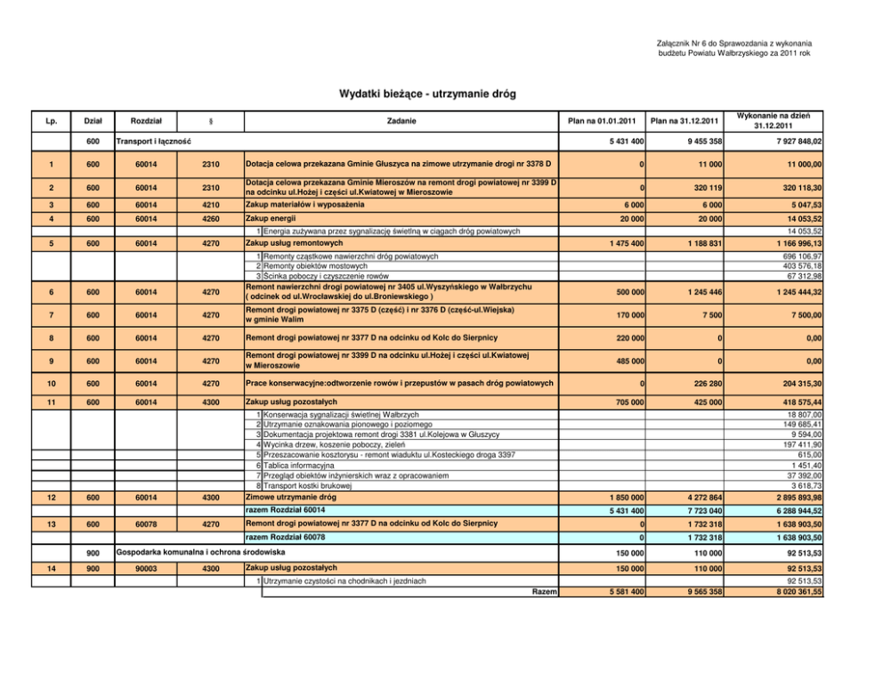 Załącznik Nr 6 do Sprawozdania z wykonania budżetu Powiatu Wałbrzyskiego za 2011 rok Wydatki bieżące - utrzymanie dróg Lp. Dział 600 Rozdział Zadanie § Plan na 31.12.2011 Plan na 01.01.2011 Transport i łączność Wykonanie na dzień 31.12.2011 5 431 400 9 455 358 7 927 848,02 1 600 60014 2310 Dotacja celowa przekazana Gminie Głuszyca na zimowe utrzymanie drogi nr 3378 D 0 11 000 11 000,00 2 600 60014 2310 Dotacja celowa przekazana Gminie Mieroszów na remont drogi powiatowej nr 3399 D na odcinku ul.Hożej i części ul.Kwiatowej w Mieroszowie 0 320 119 320 118,30 3 600 60014 4210 Zakup materiałów i wyposażenia 4 600 60014 4260 Zakup energii 5 600 60014 4270 Zakup usług remontowych 6 000 6 000 5 047,53 20 000 20 000 14 053,52 1 475 400 1 188 831 1 166 996,13 1 Energia zużywana przez sygnalizację świetlną w ciągach dróg powiatowych 6 600 60014 4270 7 600 60014 4270 8 600 60014 9 600 10 11 12 13 1 Remonty cząstkowe nawierzchni dróg powiatowych 2 Remonty obiektów mostowych 3 Ścinka poboczy i czyszczenie rowów Remont nawierzchni drogi powiatowej nr 3405 ul.Wyszyńskiego w Wałbrzychu ( odcinek od ul.Wrocławskiej do ul.Broniewskiego ) 696 106,97 403 576,18 67 312,98 500 000 1 245 446 1 245 444,32 Remont drogi powiatowej nr 3375 D (część) i nr 3376 D (część-ul.Wiejska) w gminie Walim 170 000 7 500 7 500,00 4270 Remont drogi powiatowej nr 3377 D na odcinku od Kolc do Sierpnicy 220 000 0 0,00 60014 4270 Remont drogi powiatowej nr 3399 D na odcinku ul.Hożej i części ul.Kwiatowej w Mieroszowie 485 000 0 0,00 600 60014 4270 Prace konserwacyjne:odtworzenie rowów i przepustów w pasach dróg powiatowych 0 226 280 204 315,30 600 60014 4300 Zakup usług pozostałych 705 000 425 000 418 575,44 4300 1 Konserwacja sygnalizacji świetlnej Wałbrzych 2 Utrzymanie oznakowania pionowego i poziomego 3 Dokumentacja projektowa remont drogi 3381 ul.Kolejowa w Głuszycy 4 Wycinka drzew, koszenie poboczy, zieleń 5 Przeszacowanie kosztorysu - remont wiaduktu ul.Kosteckiego droga 3397 6 Tablica informacyjna 7 Przegląd obiektów inżynierskich wraz z opracowaniem 8 Transport kostki brukowej Zimowe utrzymanie dróg 1 850 000 4 272 864 2 895 893,98 razem Rozdział 60014 5 431 400 7 723 040 6 288 944,52 Remont drogi powiatowej nr 3377 D na odcinku od Kolc do Sierpnicy 0 1 732 318 1 638 903,50 razem Rozdział 60078 0 1 732 318 1 638 903,50 150 000 110 000 92 513,53 150 000 110 000 92 513,53 5 581 400 9 565 358 92 513,53 8 020 361,55 600 600 900 14 14 053,52 900 60014 60078 4270 18 807,00 149 685,41 9 594,00 197 411,90 615,00 1 451,40 37 392,00 3 618,73 Gospodarka komunalna i ochrona środowiska 90003 4300 Zakup usług pozostałych 1 Utrzymanie czystości na chodnikach i jezdniach Razem