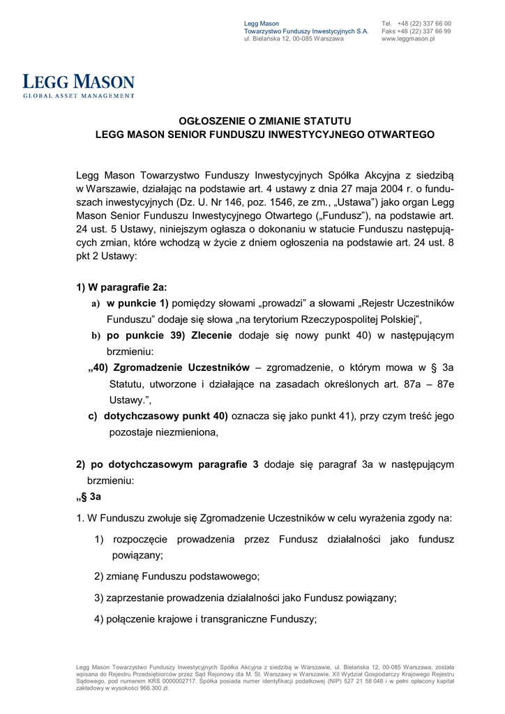 Legg Mason Towarzystwo Funduszy Inwestycyjnych S.A. ul. Bielańska 12, 00-085 Warszawa Tel. +48 (22) 337 66 00 Faks +48 (22) 337 66 99 www.leggmason.pl OGŁOSZENIE O ZMIANIE STATUTU LEGG MASON SENIOR FUNDUSZU INWESTYCYJNEGO OTWARTEGO Legg Mason Towarzystwo Funduszy Inwestycyjnych Spółka Akcyjna z siedzibą w Warszawie, działając na podstawie art. 4 ustawy z dnia 27 maja 2004 r. o funduszach inwestycyjnych (Dz. U. Nr 146, poz. 1546, ze zm., „Ustawa”) jako organ Legg Mason Senior Funduszu Inwestycyjnego Otwartego („Fundusz”), na podstawie art. 24 ust. 5 Ustawy, niniejszym ogłasza o dokonaniu w statucie Funduszu następujących zmian, które wchodzą w życie z dniem ogłoszenia na podstawie art. 24 ust. 8 pkt 2 Ustawy: 1) W paragrafie 2a: a) w punkcie 1) pomiędzy słowami „prowadzi” a słowami „Rejestr Uczestników Funduszu” dodaje się słowa „na terytorium Rzeczypospolitej Polskiej”, b) po punkcie 39) Zlecenie dodaje się nowy punkt 40) w następującym brzmieniu: „40) Zgromadzenie Uczestników – zgromadzenie, o którym mowa w § 3a Statutu, utworzone i działające na zasadach określonych art. 87a – 87e Ustawy.”, c) dotychczasowy punkt 40) oznacza się jako punkt 41), przy czym treść jego pozostaje niezmieniona, 2) po dotychczasowym paragrafie 3 dodaje się paragraf 3a w następującym brzmieniu: „§ 3a 1. W Funduszu zwołuje się Zgromadzenie Uczestników w celu wyrażenia zgody na: 1) rozpoczęcie prowadzenia przez Fundusz działalności jako fundusz powiązany; 2) zmianę Funduszu podstawowego; 3) zaprzestanie prowadzenia działalności jako Fundusz powiązany; 4) połączenie krajowe i transgraniczne Funduszy; Legg Mason Towarzystwo Funduszy Inwestycyjnych Spółka Akcyjna z siedzibą w Warszawie, ul. Bielańska 12, 00-085 Warszawa, została wpisana do Rejestru Przedsiębiorców przez Sąd Rejonowy dla M. St. Warszawy w Warszawie, XII Wydział Gospodarczy Krajowego Rejestru Sądowego, pod numerem KRS 0000002717. Spółka posiada numer identyfikacji podatkowej (NIP) 527 21 58 048 i w pełni opłacony kapitał zakładowy w wysokości 966.300 zł. 5) przejęcie zarządzania Funduszem przez inne towarzystwo; 6) przejęcie zarządzania Funduszem i prowadzenia jego spraw przez spółkę zarządzającą. 2. Zgromadzenie Uczestników odbywa się w Warszawie albo w innym miejscu na terytorium Rzeczypospolitej Polskiej. Towarzystwo zwołując Zgromadzenie Uczestników: 1) ogłasza o nim w sposób określony w § 59 ust. 1 Statutu z zastrzeżeniem, że ogłoszenie następuje przed przekazaniem Uczestnikom zawiadomienia o którym mowa w pkt 2) poniżej; 2) zawiadamia o Zgromadzeniu Uczestników każdego Uczestnika indywidualnie przesyłką poleconą lub innym trwałym nośniku informacji, co najmniej na 21 dni przed planowanym terminem Zgromadzenia Uczestników; 3) udostępnia zawiadomienie o planowanym Zgromadzeniu Inwestorów przy zbywaniu Jednostek Uczestnictwa wraz z kluczowymi informacjami dla inwestorów dotyczącymi danego Funduszu od dnia ogłoszenia, o którym mowa w punkcie 1). 3. Zawiadomienie o zwołaniu Zgromadzenia Uczestników zawiera: 1) informację o miejscu i terminie Zgromadzenia Uczestników wskazanym przez Towarzystwo jako zwołującego, 2) wskazanie zdarzenia leżącego w kompetencjach Zgromadzenia Uczestników, o których mowa w art. 87a ust. 1 Ustawy o Funduszach Inwestycyjnych, co do którego Zgromadzenie ma wyrazić zgodę, 3) informację o zawieszeniu zbywania i odkupywania Jednostek Uczestnictwa Funduszu od dnia poprzedzającego dzień Zgromadzenia Uczestników do dnia Zgromadzenia Uczestników, 4) informację o dniu, na jaki jest ustalona lista Uczestników uprawnionych do udziału w Zgromadzeniu Uczestników. 4. Towarzystwo ponosi koszty odbycia Zgromadzenia Uczestników. Legg Mason Towarzystwo Funduszy Inwestycyjnych Spółka Akcyjna z siedzibą w Warszawie, ul. Bielańska 12, 00-085 Warszawa, została wpisana do Rejestru Przedsiębiorców przez Sąd Rejonowy dla M. St. Warszawy w Warszawie, XII Wydział Gospodarczy Krajowego Rejestru Sądowego, pod numerem KRS 0000002717. Spółka posiada numer identyfikacji podatkowej (NIP) 527 21 58 048 i w pełni opłacony kapitał zakładowy w wysokości 966.300 zł. 5. Uprawnieni do udziału w Zgromadzeniu Uczestników są Uczestnicy wpisani do Rejestru Uczestników według stanu na koniec drugiego dnia roboczego poprzedzającego dzień Zgromadzenia Uczestników. 6. Listę uczestników uprawnionych do udziału w Zgromadzeniu Uczestników sporządza Agent Transferowy i przekazuje ją Towarzystwu w dniu roboczym poprzedzającym dzień Zgromadzenia Uczestników. Lista jest sporządzana na podstawie danych zawartych w Rejestrze Uczestników Funduszu. Lista zawiera nazwiska i imiona albo firmy (nazwy) uprawnionych Uczestników, Pesel / Regon, ich adres, liczbę Jednostek Uczestnictwa oraz liczbę przysługujących im głosów. 7. Od dnia poprzedzającego dzień Zgromadzenia Uczestników do dnia Zgromadzenia Uczestników zawiesza się zbywanie i odkupywanie Jednostek Uczestnictwa Funduszu. 8. Tryb działania Zgromadzenia Uczestników oraz podejmowania uchwał określa Statut oraz regulamin przyjęty przez to Zgromadzenie. 9. Uczestnik może wziąć udział w Zgromadzeniu Uczestników osobiście lub przez pełnomocnika. Pełnomocnictwa udziela się w formie pisemnej pod rygorem nieważności. 10. Każda cała Jednostka Uczestnictwa upoważnia Uczestnika do oddania jednego głosu. Uchwała o wyrażeniu zgody na którekolwiek ze zdarzeń leżących w kompetencjach Zgromadzenia Uczestników (zgodnie z art. 87a ust. 1 Ustawy o Funduszach Inwestycyjnych), zapada większością 2/3 głosów Uczestników obecnych lub reprezentowanych na Zgromadzeniu Uczestników. 11. Zgromadzenie uczestników jest ważne, jeżeli wezmą w nim udział Uczestnicy posiadający co najmniej 50% jednostek Uczestnictwa Funduszu, według stanu na dwa dni robocze przed dniem Zgromadzenia Uczestników. 12. Przed podjęciem uch