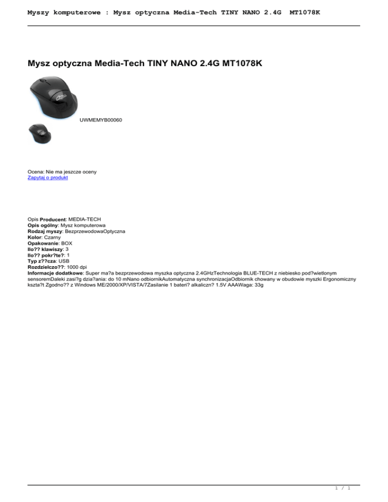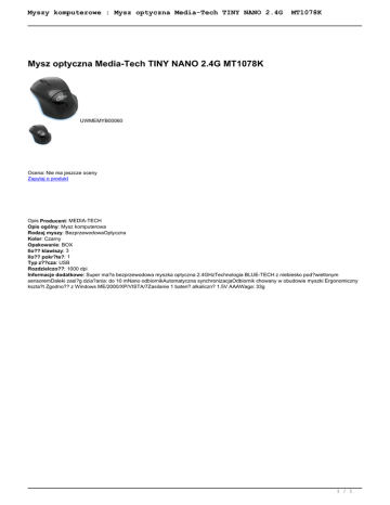 Myszy komputerowe : Mysz optyczna Media-Tech TINY NANO 2.4G MT1078K Mysz optyczna Media-Tech TINY NANO 2.4G MT1078K UWMEMYB00060 Ocena: Nie ma jeszcze oceny Zapytaj o produkt Opis Producent: MEDIA-TECH Opis ogólny: Mysz komputerowa Rodzaj myszy: BezprzewodowaOptyczna Kolor: Czarny Opakowanie: BOX Ilo?? klawiszy: 3 Ilo?? pokr?te?: 1 Typ z??cza: USB Rozdzielczo??: 1000 dpi Informacje dodatkowe: Super ma?a bezprzewodowa myszka optyczna 2.4GHzTechnologia BLUE-TECH z niebiesko pod?wietlonym sensoremDaleki zasi?g dzia?ania: do 10 mNano odbiornikAutomatyczna synchronizacjaOdbiornik chowany w obudowie myszki Ergonomiczny kszta?t Zgodno?? z Windows ME/2000/XP/VISTA/7Zasilanie 1 bateri? alkaliczn? 1.5V AAAWaga: 33g 1 / 1 Powered by TCPDF (www.tcpdf.org)