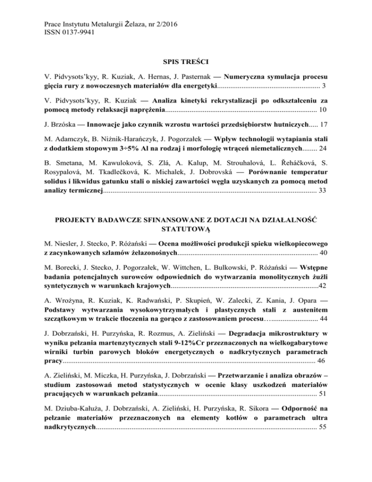 Prace Instytutu Metalurgii Żelaza, nr 2/2016 ISSN 0137-9941 SPIS TREŚCI V. Pidvysots’kyy, R. Kuziak, A. Hernas, J. Pasternak — Numeryczna symulacja procesu gięcia rury z nowoczesnych materiałów dla energetyki....................................................... 3 V. Pidvysots’kyy, R. Kuziak — Analiza kinetyki rekrystalizacji po odkształceniu za pomocą metody relaksacji naprężenia................................................................................. 10 J. Brzóska — Innowacje jako czynnik wzrostu wartości przedsiębiorstw hutniczych..... 17 M. Adamczyk, B. Niżnik-Harańczyk, J. Pogorzałek — Wpływ technologii wytapiania stali z dodatkiem stopowym 3÷5% Al na rodzaj i morfologię wtrąceń niemetalicznych........ 24 B. Smetana, M. Kawuloková, S. Zlá, A. Kalup, M. Strouhalová, L. Řeháčková, S. Rosypalová, M. Tkadlečková, K. Michalek, J. Dobrovská — Porównanie temperatur solidus i likwidus gatunku stali o niskiej zawartości węgla uzyskanych za pomocą metod analizy termicznej.................................................................................................................. 33 PROJEKTY BADAWCZE SFINANSOWANE Z DOTACJI NA DZIAŁALNOŚĆ STATUTOWĄ M. Niesler, J. Stecko, P. Różański — Ocena możliwości produkcji spieku wielkopiecowego z zacynkowanych szlamów żelazonośnych........................................................................... 40 M. Borecki, J. Stecko, J. Pogorzałek, W. Wittchen, L. Bulkowski, P. Różański — Wstępne badania potencjalnych surowców odpowiednich do wytwarzania monolitycznych żużli syntetycznych w warunkach krajowych...............................................................................42 A. Wrożyna, R. Kuziak, K. Radwański, P. Skupień, W. Zalecki, Z. Kania, J. Opara — Podstawy wytwarzania wysokowytrzymałych i plastycznych stali z austenitem szczątkowym w trakcie tłoczenia na gorąco z zastosowaniem procesu…......................... 44 J. Dobrzański, H. Purzyńska, R. Rozmus, A. Zieliński — Degradacja mikrostruktury w wyniku pełzania martenzytycznych stali 9-12%Cr przeznaczonych na wielkogabarytowe wirniki turbin parowych bloków energetycznych o nadkrytycznych parametrach pracy....................................................................................................................................... 46 A. Zieliński, M. Miczka, H. Purzyńska, J. Dobrzański — Przetwarzanie i analiza obrazów – studium zastosowań metod statystycznych w ocenie klasy uszkodzeń materiałów pracujących w warunkach pełzania..................................................................................... 51 M. Dziuba-Kałuża, J. Dobrzański, A. Zieliński, H. Purzyńska, R. Sikora — Odporność na pełzanie materiałów przeznaczonych na elementy kotłów o parametrach ultra nadkrytycznych...................................................................................................................... 55 Prace Instytutu Metalurgii Żelaza, nr 2/2016 ISSN 0137-9941 W. Burian, J. Marcisz, B. Walnik — Zwiększenie odporności ultrawytrzymałej stali bainityczno-austenitycznej na wysokoenergetyczne wielokrotne obciążenia udarowe metodą optymalizacji składu chemicznego i parametrów wytwarzania........................... 57 D. Woźniak, H. Kania, P. Skupień, R. Palus, M. Adamczyk, B. Walnik — Badania nad powłokami ograniczającymi utlenianie wlewków stalowych w procesie ciągłego odlewania i przeróbki plastycznej........................................................................................ 60 J. Stępień, M. Burdek, J. Marcisz, B. Walnik — Zbadanie możliwości zastosowania stali o wyższej wytrzymałości niż stosowany obecnie gatunek 15CrMoV6-10-3 na korpusy kalibru 122 mm i opracowanie wstępnej technologii wykonania korpusu kalibru 300 mm........................................................................................................................................... 62 D. Woźniak, R. Palus, M. Adamczyk — Opracowanie metodą modelowania fizycznego w module B – LPS zależności matematycznej opisującej wpływ współczynnika przewodnictwa cieplnego na plastyczne płynięcie metalu w kierunku szerokości........... 64 J. Marcisz, A. Żak, W. Burian, B. Walnik — Opracowanie nowych rozwiązań technologicznych i materiałowych w zakresie zgrzewania wybuchowego blach ze stali o zróżnicowanych właściwościach w celu uzyskania materiału warstwowego o wysokiej odporności balistycznej.......................................................................................................... 67 Z. Kania, R. Kuziak, V. Pidvysots’kyy, K. Radwański — Opracowanie modelu numerycznego procesu obróbki cieplno-plastycznej prętów wykonanych ze stali bainitycznych z efektem TRIP.............................................................................................. 70 H. Krztoń, J. Stecko, Z. Kania — Opracowanie charakterystyk mineralogicznych spieków wielkopiecowych..................................................................................................................... 73 K. Radwański, R. Kuziak, P. Skupień, W. Zalecki, R. Rozmus, W. Kubosz — Ilościowa i jakościowa charakterystyka strukturalna przemian fazowych w taśmach ze stali DualPhase........................................................................................................................................ 75 J. Wiedermann, K. Radwański, R. Kuziak, W. Zalecki — Przeprowadzenie prób i badań laboratoryjnych pod kątem opracowania materiału wsadowego do produkcji specjalistycznych kontenerów i pojemników dla przemysłu samochodowego z wysokowytrzymałych, niskostopowych stali wielofazowych stanowiących materiał odpadowy walcowni blach..................................................................................................... 79 R. Swadźba — Badania mikrostrukturalne w skali mikro i nano procesów utle
