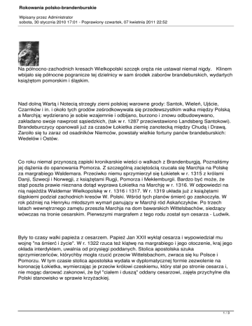Rokowania polsko-brandenburskie Wpisany przez Administrator sobota, 30 stycznia 2010 17:01 - Poprawiony czwartek, 07 kwietnia 2011 22:52 Na północno-zachodnich kresach Wielkopolski szczęk oręża nie ustawał niemal nigdy. Klinem wbijało się północne pogranicze tej dzielnicy w sam środek zaborów brandeburskich, wydartych książętom pomorskim i śląskim. Nad dolną Wartą i Notecią strzegły ziemi polskiej warowne grody: Santok, Wieleń, Ujście, Czarnków i in. i około tych grodów ześrodkowywała się przedewszystkim walka między Polską a Marchją: wydzierano je sobie wzajemnie i odbijano, burzono i znowu odbudowywano, zakładano swoje nawprost sąsiedzkich, (tak w r. 1287 przeciwstawiono Landsberg Santokowi). Brandeburczycy opanowali już za czasów Łokietka ziemię zanotecką między Chudą i Drawą. Zaroiło się tu zaraz od osadników Niemców, powstały wielkie fortuny panów brandeburskich: Wedelów i Ostów. Co roku niemal przynoszą zapiski kronikarskie wieści o walkach z Brandenburgją. Poznaliśmy jej dążenia do opanowania Pomorza. Z szczególną zaciętością rzucała się Marchja na Polskę za margrabiego Waldemara. Przeciwko niemu sprzymierzył się Łokietek w r. 1315 z królami Danji, Szwecji i Norwegji, z książętami Rugji, Pomorza i Meklemburgii. Bardzo być może, że stąd poszła prawie nieznana dotąd wyprawa Łokietka na Marchję w r. 1316. W odpowiedzi na nią najeżdża Waldemar Wielkopolskę w r. 1316 i 1317. W r. 1319 układa już z ksiąźętami śląskiemi podział zachodnich kresów W. Polski. Wśród tych planów śmierć go zaskoczyła. W rok później na Henryku młodszym wymarł panujący w Marchji ród Askańczyków. Po trzech latach wewnętrznego zamętu przeszła Marchja na dom bawarskich Wittelsbachów, siedzący wówczas na tronie cesarskim. Pierwszymi margrafem z tego rodu został syn cesarza - Ludwik. Były to czasy walki papieża z cesarzem. Papież Jan XXII wyklął cesarza i wypowiedział mu wojnę "na śmierć i życie". W r. 1322 rzuca też klątwę na margrabiego i jego otoczenie, kraj jego okłada interdyktem, uwalnia od przysięgi poddanych. Stolica apostolska szuka sprzymierzeńców, którychby mogła rzucić przeciw Wittelsbachom, zwraca się ku Polsce i Pomorzu. W tym czasie stolica apostolska wydała w dyplomatycznej formie zezwolenie na koronację Łokietka, wymierzając je przeciw królowi czeskiemu, który stał po stronie cesarza i, nie mogąc darować zakonowi, że był "ciałem i duszą" oddany cesarzowi, zajęła przychylne dla Polski stanowisko w sprawie krzyżackiej. 1/3 Rokowania polsko-brandenburskie Wpisany przez Administrator sobota, 30 stycznia 2010 17:01 - Poprawiony czwartek, 07 kwietnia 2011 22:52 Za to Łokietek daje się użyć jako narzędzie polityki papieskiej przeciw Marchji, która, zawichrzona podówczas wojnami ościennemi i buntami wewnętrznemi, zajęła chwilowo wobec Polski stanowisko raczej odporne niż zaczepne. Zamiast skierować wszystkie siły przeciwko Krzyżakom, nie ważącym sobie za nic wyroku kurji rzymskiej, Łokietek wraz z Litwinami roznosi w r. 1326 straszne spustoszenia po Marchji. Cesarz nie posiada się z gniewu. Zaraz w następnym roku za jego i margrabiego poduszczeniem uderzają Krzyżacy na Polskę, równocześnie podejmuje wyprawę przeciw Police i drugi sprzymierzeniec cesarza, Jan czeski. W r. 1328 wydaje cesarz dwa dokumenty, któremi z wysokości swej - fikcyjnej nad całym światem władzy - składa z tronu Łokietka, a Polskę przekazuje swemu synowi, margrabiemu brandenburskiemu. Na wiosnę 1329 r. znowu wre wojna. W granice Polski wpadają Krzyżacy i Czesi. Zagrożony zewsząd Łokietek zrywa z polityką rzymską. Równocześnie w Marchji, której pomoc cesarska nie zabezpieczyła od ciosów, pod któremi uginać się poczęła jej potęga, dokonała się zmiana w ukształtowaniu stronnictw a polityka z cesarskiej stała się brandeburską. W takich stosunkach w r. 1329 przychodzi do pokoju Polski z Marchją, zawartego w Landsbergu na 3 lata. Ażeby ocenić ten pokój wejrzeć trzeba w stosunki prywatne, panujące na pograniczu. Pokój landsberski jest dziełem stojącej u steru rządów w Marchji arystokracji brandeburskiej tych Wedelów, którzy jako udzielni i wyłączni panowie obszarów zanoteckich bezpośrednio i prywatnie byli zainteresowani w przerwaniu wojny, niszczącej ich posiadłości, groźnej dla ich fortuny i potęgi. Wedelowie znajdują oddźwięk wspólności interesów w wielkopolskich Nalęczach. Naprzeciw Wedelszczyzny leżą włości Nałęczów, odwet ze strony Marchji spustoszyłby ich dobra. Panów brandeburskioh i wielkopolskich łączą blizkie stosunki, zachodzą między niemi związki pokrewieństwa. Jak Wedelowie w Marchji, tak Nałęczowie w W. Polsce są u steru rządów. Nałęcz, Wincenty z Szamotuł, w imieniu królewskim układa warunki pokoju w Landsbergu. Interes prywatny panów przenikał się i jednoczył tym razem z interesem publicznym. I Marchja, wycieńczona walkami, i Polska, która potrzebowała skupienia sil dla walki z Zakonem, spragnione były pokoju. Jaką jednak rolę w tym pokoju i wogóle w życiu politycznym owych czasów gra możnowładztwo, pokazuje akt dodatkowy pokoju landsberskiego. 2/3 Rokowania polsko-brandenburskie Wpisany przez Administrator sobota, 30 stycznia 2010 17:01 - Poprawiony czwartek, 07 kwietnia 2011 22:52 Wojewoda wielkopolski, posiadacz granicznych grodów Czarnkowa i Wielenia, Wincenty z Szamotuł, występuje w nim jak gwarant, stający "na straży pokoju" i zobowiązuje się nie wpuszczać przez swe grody króla polskiego do Marchji, ani go z niej wypuszczać, gdyby pierwszy usiłował pokój złamać i dzierźawy margrabiego najechać - a nawet, gdyby król polski innemi drogami wpadł do Marchji., Wincenty wpuści jednocześnie przez Wieleń i Czarnków do Polski Brandeburczyków. Naodwrót - wojewoda tak samo postąpi wobec margrabiego, gdyby chciał wpaść do Polski, wy