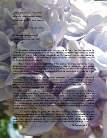 „Panie, przenikasz i znasz mnie. Ty wiesz, kiedy siadam i wstaję. Z daleka przenikasz moje zamysły, …. I wszystkie moje drogi są Ci znane. … Ty ogarniasz mnie zewsząd i kładziesz na mnie swą rękę.” (Psalm 139) Powołanie zakonne jest wielką łaska daną darmo od Boga. Pan Bóg powołując do służby Bożej, wybiera najlepszy czas. Ja mając 24 lata wstąpiłam do Zgromadzenia Sióstr Służebniczek Maryi. Była to moja odpowiedź na Chrystusowe zaproszenie: „Pójdź za Mną, zostaw wszystko – dom rodzinny.” To była decyzja na całe życie, całkowite oddanie się Jezusowi do Jego dyspozycji. Pracowałam w urzędzie pocztowym 5 lat, lubiłam tę pracę, czułam się w niej dobrze. Po ukończeniu liceum zawodowego pragnęłam pójść do zakonu, decyzję tę jednak odkładałam. Na podjęcie decyzji miał wpływ mój kontakt z Siostrami Służebniczkami z Gostynia. Rodzina, znajomi byli zaskoczeni, jednak ja postawiłam wszystko na jedną kartę – na Jezusa Chrystusa. Maryja w moim życiu ma ogromne znaczenie. To Ją prosiłam o wszystkie potrzebne łaski. Pragnęłam służyć Jezusowi na Jej wzór, dlatego wybrałam Zgromadzenie Sióstr Służebniczek Niepokalanego Poczęcia Najświętszej Maryi Panny. Mimo, że się lękałam, zastanawiałam się nad tym czy sobie poradzę, i tak jak Maryja – pokorna Służebnica, zaufałam bez reszty Panu Bogu. Pierwsze dni w zakonie wspominam bardzo dobrze. Pamiętam życzliwość i dobroć Sióstr, każde dobro słowo, uśmiech, zatroskanie. Jestem wdzięczna Panu Bogu za wszystkie osoby, które zostały postawione na mojej drodze życia. Nie mogę tutaj pominąć szczególnie jednej osoby – siostry Jadwigi, która od samego początku bardzo mi pomagała. Jej postawa, powołanie, pokój pomagały mi w pierwszych krokach stawianych w Zgromadzeniu. To siostra Jadwiga napisała do mnie zaproszenie, abym przyjechała i mogła poznać Zakon. To właśnie Ona była pierwszą opiekunką i wychowawczynią, zawsze nad nami czuwała. „Nie bój się, wypłyń na głębię.” Św. Jan Paweł II zachęca, abyśmy nie bali się pójść za Jezusem i odpowiedzieli na Jego wezwanie „Pójdź za Mną.” To On obdarzy Cię mocą i siłą. Jemu należy zaufać i zawierzyć całe swoje życie. Pan Bóg stawia różne zadania przed nami, wtedy często wracam do słów Św. Pawła: „WYSTARCZY CI MOJEJ ŁASKI.” Jezusowi oddaję wszystkie moje radości i smutki. Jemu zawierzam całe moje życie. s. M. Bogusława sł. M.