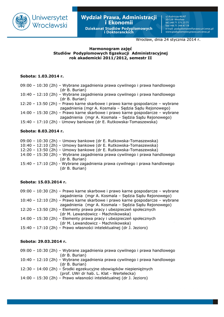 Wrocław, dnia 24 stycznia 2014 r. Harmonogram zajęć Studiów