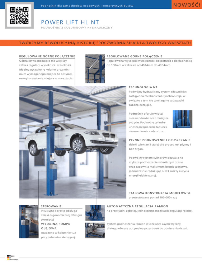 Po dnoś ni k dl a s a m ochodów os o b o wy c h i ko me rc y jn y c h b u s ó w NOWOŚĆ! P OW E R L IF T H L NT P O D N O Ś N I K 2 KO LU M N OW Y H Y D R AU L I C Z N Y T WOR Z YM Y REWOLUCYJNĄ HISTO R I Ę “PO C Z WÓ R N A S I Ł A DL A T WOJ E G O WA R S Z TAT U R EG U LO WA N E G Ó R N E P O Ł ĄC Z EN I E R E G U LO WA N E G Ó R N E P O Ł ĄC Z EN I E Górna listwa mocująca ma większy Regulowana wysokość w zależności od potrzeb z dokładnością zakres regulacji wysokości i szerokości. do 100mm w zakresie od 4104mm do 4904mm. Idealne ustawienie kolumn oraz minimum wymaganego miejsca to optymalne wykorzystanie miejsca w warsztacie. T EC H N O LO G I A N T Podwójny hydrauliczny system siłowników, zastąpiona mechaniczna synchronizcja, w związku z tym nie wymagane są zapadki zabezpieczające. Podnośnik oferuje więcej niezawodności oraz mniejsze zużycie. Podwójne cylindry unoszą bezpiecznie ładunek równomiernie z obu stron. P ŁY N N E P O D N O S Z EN I E I O P U S ZC Z A N I E dzięki większej i stałej sile proces jest płynny i bez drgań. Podwójny system cylindrów pozwala na szybsze podnoszenie w krótszym czasie oraz zapewnia maksimum bezpieczeństwa, jednocześnie redukując o 1/3 koszty zużycia energii elektrycznej. S TA LO WA KO N S T R U KC J A M O D ELÓW S L przetestowana ponad 100.000 razy S T EROWA N I E AU TO M AT YC Z N A R E G U L AC J A R A M I O N Intuicyjna i prosta obsługa na przekładni zębatej, jednoczesna możliwość regulacji ręcznej. dzięki ergonomicznej dźwigni sterującej W Y DA J N A P O M PA System podnoszenia ramion jest zawsze asymetryczny, O L E J OWA dlatego oferuje optymalną przestrzeń do otwierania drzwi. osadzona w kolumnie tuż przy jednostce sterującej. P O W E R L I F T H L 2 . 3 0 & 2 . 4 0 N T – P O C Z W Ó R N A S I Ł A D L A T W OJ E G O WA R S Z TAT U P O W ER L I F T H L 2 . 3 0 N T P OW ER L I F T H L 2 . 3 0 N T DT P O W ER L I F T H L 2 . 4 0 N T •podnośnik dla pojazdów od VW T5 do •krótkie podwójne teleskopowe i •podnośnik dla samochodów oso- •pojazdów z krótkim rozstawem osi MINI MA X LIFTING ARMS regulowane ramiona, zapewniają bowych i komercjalnych busów, do większy zakres i różnorodność pod- uniwersalnych zastosowań noszenia szerokich i wąskich pojazdów . •Wzmocniona stal oraz wysuwane Łatwy i wygodny system do podnoszenia •krótkie podwójne teleskopowe rami- ramiona, do podnoszenia pojazdów pojazdów niskopodwoziowych oraz z ona posiadają zakres regulacji od 480 takich jak długi Mercedes Sprinter oraz listwami progowymi: – 870mm pick up-y z alternatywnymi punktami •regulowana wysokość 75–185mm podparcia. wielopoziomowa szybka regulacja P OW ER L I F T H L Udźwig (kg) Czas podnoszenia/opuszczania* (sec) Wysokość podnoszenia (mm) Zakres regulacji wys. punktu podparcia (mm) Wysokość kolumn (mm) Maksymalna wysokość (mm) Maksymalna szerokość (mm) 2.30 NT 2 . 3 0 N T DT 2.40 NT 3000 3000 4000 18 / 14 18 / 14 26 / 14 1995 1995 2050 95–140 95–140 115–190 3939 3939 3939 4040– 4904* 4040– 4904* 4040– 4904* 3000–3200 3100–3300 3350 3000 3100 3350 Szerokość przejazdowa (mm) 2213–2413 2313–2513 2523 Odległość między kolumnami (mm) 2460–2660 2560–2760 2762 Zakres długich ramion (mm) 940–1495 940–1495 1130–1840 Zakres krótkich ramion (mm) 590–900 480–870 570–1160 400/50/16 400/50/16 400/50/16 Zalecany rozstaw (mm) Zasilanie (V/Hz) Silnik (kW) Wymagana wysokość sufitu (mm) Rysunki 3 3 3 min. 4200 min. 4200 min. 4040 7345 7362 7346 Akcesoria: •Zestaw zasilający, gniazdo 230V oraz gniazdo sprężonego powietrza , zintegrowane w kolumnie •Zestaw przedłużający •Różnorodność wysokości adapterów * orientacyjny czas F U N KC J O N A L N O Ś Ć I B E Z P I E C Z EŃ S T W O : T E C H N O LO G I A N T •Krzyżowy system cylindrów – system zapewnia doskonałą synchronizację podczas podnoszenia jak i opuszczania bez lin synchronizujących •Pojazd jest bezpieczny na każdej wysokości podnoszenia bez mechanicznych zabezpieczeń •Cały hydrauliczny system nie wymaga elektrycznych i pneumatycznych podzespołów •Brak dolnego sztywnego połączenia między kolumnami •Samo wentylujący się system hydrauliczny •Zintegrowana zanurzona w oleju hydraulicznym pompa zapewnia cichą i stabilną Schemat technologia NT pracę www.nussbaum-group.de/powerlift-hl