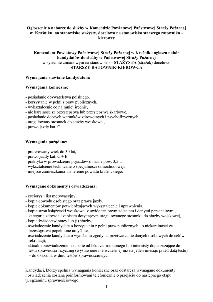 Komendant Powiatowy Państwowej StraŜy PoŜarnej w Kraśniku ogłasza nabór