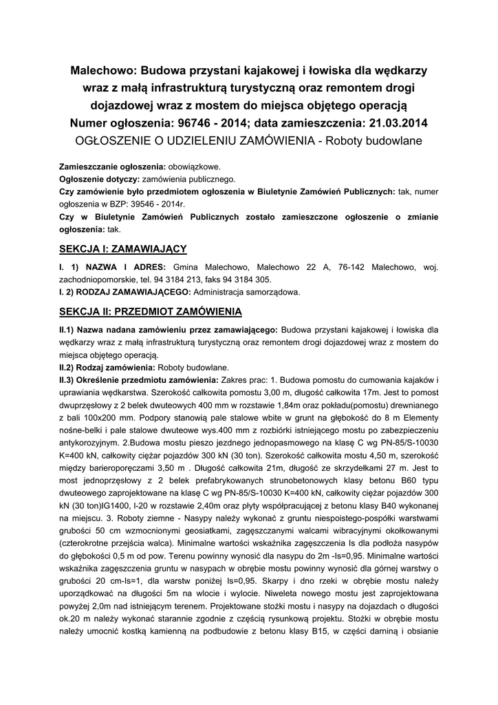Malechowo: Budowa przystani kajakowej i łowiska dla wędkarzy wraz z małą infrastrukturą turystyczną oraz remontem drogi dojazdowej wraz z mostem do miejsca objętego operacją Numer ogłoszenia: 96746 - 2014; data zamieszczenia: 21.03.2014 OGŁOSZENIE O UDZIELENIU ZAMÓWIENIA - Roboty budowlane Zamieszczanie ogłoszenia: obowiązkowe. Ogłoszenie dotyczy: zamówienia publicznego. Czy zamówienie było przedmiotem ogłoszenia w Biuletynie Zamówień Publicznych: tak, numer ogłoszenia w BZP: 39546 - 2014r. Czy w Biuletynie Zamówień Publicznych zostało zamieszczone ogłoszenie o zmianie ogłoszenia: tak. SEKCJA I: ZAMAWIAJĄCY I. 1) NAZWA I ADRES: Gmina Malechowo, Malechowo 22 A, 76-142 Malechowo, woj. zachodniopomorskie, tel. 94 3184 213, faks 94 3184 305. I. 2) RODZAJ ZAMAWIAJĄCEGO: Administracja samorządowa. SEKCJA II: PRZEDMIOT ZAMÓWIENIA II.1) Nazwa nadana zamówieniu przez zamawiającego: Budowa przystani kajakowej i łowiska dla wędkarzy wraz z małą infrastrukturą turystyczną oraz remontem drogi dojazdowej wraz z mostem do miejsca objętego operacją. II.2) Rodzaj zamówienia: Roboty budowlane. II.3) Określenie przedmiotu zamówienia: Zakres prac: 1. Budowa pomostu do cumowania kajaków i uprawiania wędkarstwa. Szerokość całkowita pomostu 3,00 m, długość całkowita 17m. Jest to pomost dwuprzęsłowy z 2 belek dwuteowych 400 mm w rozstawie 1,84m oraz pokładu(pomostu) drewnianego z bali 100x200 mm. Podpory stanowią pale stalowe wbite w grunt na głębokość do 8 m Elementy nośne-belki i pale stalowe dwuteowe wys.400 mm z rozbiórki istniejącego mostu po zabezpieczeniu antykorozyjnym. 2.Budowa mostu pieszo jezdnego jednopasmowego na klasę C wg PN-85/S-10030 K=400 kN, całkowity ciężar pojazdów 300 kN (30 ton). Szerokość całkowita mostu 4,50 m, szerokość między barieroporęczami 3,50 m . Długość całkowita 21m, długość ze skrzydełkami 27 m. Jest to most jednoprzęsłowy z 2 belek prefabrykowanych strunobetonowych klasy betonu B60 typu dwuteowego zaprojektowane na klasę C wg PN-85/S-10030 K=400 kN, całkowity ciężar pojazdów 300 kN (30 ton)IG1400, l-20 w rozstawie 2,40m oraz płyty współpracującej z betonu klasy B40 wykonanej na miejscu. 3. Roboty ziemne - Nasypy należy wykonać z gruntu niespoistego-pospółki warstwami grubości 50 cm wzmocnionymi geosiatkami, zagęszczanymi walcami wibracyjnymi okołkowanymi (czterokrotne przejścia walca). Minimalne wartości wskaźnika zagęszczenia Is dla podłoża nasypów do głębokości 0,5 m od pow. Terenu powinny wynosić dla nasypu do 2m -Is=0,95. Minimalne wartości wskaźnika zagęszczenia gruntu w nasypach w obrębie mostu powinny wynosić dla górnej warstwy o grubości 20 cm-Is=1, dla warstw poniżej Is=0,95. Skarpy i dno rzeki w obrębie mostu należy uporządkować na długości 5m na wlocie i wylocie. Niweleta nowego mostu jest zaprojektowana powyżej 2,0m nad istniejącym terenem. Projektowane stożki mostu i nasypy na dojazdach o długości ok.20 m należy wykonać starannie zgodnie z częścią rysunkową projektu. Stożki w obrębie mostu należy umocnić kostką kamienną na podbudowie z betonu klasy B15, w części darniną i obsianie trawą. Roboty fundamentowe przyczółków należy wykonać w obudowie ze ścianek szczelnych stalowych traconych, pozostawionych w gruncie w celu niedopuszczenia do segregacji podłoża, naruszenia struktury podłoża pod fundamentami przyczółków. 4. Dojazdy do mostu w części poza obrębem mostu zostaną wyremontowane. W części jezdni na odcinku od drogi powiatowej Niemica Wiekowo w miejscowości Grabowo na długości około 654,44 m w kierunku mostu zostanie ułożona nowa warstwa ścieralna z betonu asfaltowego bez zmiany geometrii jezdni, na pozostałym odcinku 347,65m w kierunku mostu istniejąca jezdnia z płyt betonowych zostanie wyprofilowana bez zmiany geometrii jezdni. W celu wyrównania niwelety jezdni istniejące płyty zostaną ponownie ułożone na podsypce piaskowej. Część dojazdów w obrębie mostu na długości 51,25 od strony Grabowa, 53,63 m w kierunku Przystawy, 31,65 m w kierunku Gorzycy zostanie przebudowana, zostanie wykonany nasyp od istniejącego terenu w górę około 2m przy moście. Na nowo wykonanym nasypie zostanie ułożona nawierzchnia betonowa na długości około 136,53m. Nasyp w obrębie mostów zostanie zakończony stożkami ziemnymi umocnionymi kostką kamienną i darniną z obsianiem trawą 5. Mała infrastruktura turystyczna: zakup i montaż gotowych urządzeń i wyposażenia wykonanego z drewna ewentualnie połączenia drewna z metaloplastyką. Wszystkie urządzenia mają być bezpieczne dla użytkowników, posiadać certyfikaty i deklaracje zgodności z polską normą uprawniającą do oznakowania wyrobu znakiem bezpieczeństwa. Ognisko- wykonane na posadzce betonowej grubości 15 cm. obłożone kamieniem polnym . Tereny utwardzone - wykonać pod wiatą i w rejonie wiaty zgodnie z projektem zagospodarowania terenu z kostki betonowej typu polbruk gr. 6 cm. lub kamienia na zagęszczonej podsypce piaskowej gr. 30 cm. Obrzeża betonowe o wymiarach 100 x 20 x 6 na podsypce cementowo - piaskowej z wypełnieniem spoin zaprawą cementową Konstrukcję wiaty drewnianej o wym. 10x1,75 m H=3,0. Stopę fundamentową pod każdy słup o wymiarach 30x30cm wylany na głębokość 1,1 m z betonu B20. Ściany zewnętrzne - szkielet drewniany - słupy z drewna klasy C27 o przekroju 20x20 cm. mocowane do wylanego fundamentu 30*30cm za pomocą łączników do słupów drewnianych. Belki łączące drewniane - o przekroju 7x14 cm z drewna klasy C27 oraz 20x20cm. Belki łączyć z krokwiami za pomocą blach systemowych typu BMF. Dach o konstrukcji krokwiowej opartej na poprzecznej belce drewnianymi krokwiami z drewna sosnowego klasy C27 o wilgotności do 15 % rozstawionymi co 86 cm i nachylonymi do poziomu po kątem 5°-12°. Pokrycie stanowią strugane deski grubości 2,5 cm. układane na zakład. Ściana tylna wia