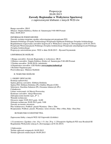 Propozycje 20.09.2015 Zawody Regionalne w Woltyżerce Sportowej z zaproszonymi klubami z innych WZJ-ów Ranga zawodów: ZR-E Miejsce: Stajnia Kalińscy, Kiekrz ul. Sanatoryjna 9 60-480 Poznań Data: 20.09.2015 INFORMACJE PODSTAWOWE Zawody zostaną rozegrane zgodne zobowiązującymi przepisami PZJ: Statutem Polskiego Związku Jeździeckiego Przepisami Ogólnymi Polskiego Związku Jeździeckiego Regulaminem rozgrywania zawodów krajowych w Woltyżerce (edycja 8, obowiązująca od 01.01.2015) Przepisami Weterynaryjnymi Polskiego Związku Jeździeckiego Przepisami antydopingowymi Polskiego Związku Jeździeckiego Propozycje zatwierdzone przez WZJ w dniu 28.08.2015 – Ryszard Szymoniak I.INFORMACJE OGÓLNE 1.Ranga zawodów: Zawody Regionalne w woltyżerce: ZR-E 2.Miejsce zawodów: Stajnia Kalińscy Kiekrz ul. Sanatoryjna 9 60-480 Poznań 3.Termin zawodów: 20.09.2015r. (niedziela) 4.Organizator zawodów: LKJ Kiekrz www.stajnia.kalinski.pl 5.Komitet Organizacyjny: Przewodniczący: Mateusz Kaliński II. WARUNKI OGÓLNE 1. OSOBY OFICJALNE: Komisja sędziowska: Sędzia główny zawodów: Elżbieta Dolińska Sędzia PZJ: Elżbieta Dolińska (PL) Dalibor Blazek (CZE) Sekretarze: Karolina Salamon (PL) Zuzanna Adamczyk (PL) Członkowie: Lekarz weterynarii: dr Maciej Przewoźny Komisarz zawodów: Alicja Borowska Zabezpieczeniu karetki typu „P” 2. Warunki techniczne: Otwarcie stajni 19.09.2015 godz. 16:00 Zebranie techniczne 20.09.2015 godz. 9:00 Zawody na terenie otwartym: Plac konkursowy: Podłoże: piasek Wymiary: 20m x 20m Rozprężania: Podłoże: piasek ;Wymiary: teren otwarty: 40m x 60m, Hala: 18mx36m III.WARUNKI UCZESTNICTWA Zaproszone kluby z innych WZJ: KJ Gajewniki (Łódzkie) 1.Uczestnictwo: Zgodnie z Art. 18 p. 1-5 i Art. 29 p. 1-2 Przepisów Ogólnych PZJ oraz Rozdział III Regulaminu Woltyżerki (edycja 8, obowiązująca od 01.02.2015) 2.Zgłoszenia: Termin zgłoszeń wstępnych: 04.09.2015 Termin zgłoszeń ostatecznych: 04.09.2015 Zgłoszenia prosimy wysyłać na adres: [email protected] Zgłoszenia muszą zawierać: imię nazwisko zawodnika, rok urodzenia, nr licencji PZJ, imię i nazwisko lonżującego, nr licencji PZJ,imię i nr paszportu konia, rodzaj konkursu i kategorii 3.Warunki finansowe: Opłata organizacyjna -wpisowe: 20zł(od zawodnika) Opłata organizacyjna -startowe: 20zł (za 1 konkurs) Opłata organizacyjna za boks: 50zł, organizator zapewnia słom i siano, boks dostępny od soboty 19.09.2015 r. 4. Zakwaterowanie: na własny koszt 5. Wyżywienie: na terenie stajni gastronomia, podstawowe wyżywienie zapewnione przez organizatora oraz możliwość zamówienia jedzenia w pobliskiej restauracji 6. Organizator nie ponosi odpowiedzialności za kradzieże, wypadki oraz inne szkody mogące mieć miejsce podczas zawodów i transportu IV. RÓŻNE: 1. Kolejność startów ustalona zostanie przez Organizatora, po wpłynięciu zgłoszeń ostatecznych. Sprawdzenie dokumentów zawodników, koni i lonżujących w dniu zawodów do godz. 9.00 2. Każdy szef ekipy musi przedstawić dokumenty zawodników, koni i lonżujących w biurze zawodów, uprawniające do startów w danych konkursach, dokumenty regulowane przepisami PZJ oraz Regulaminem rozgrywania zawodów krajowych w woltyżerce, obowiązującym od 01.01.2015, edycja 8. 3. Wraz z przesłaniem zgłoszenia wszyscy uczestnicy zawodów podporządkowują się niniejszym propozycjom oraz zarządzeniom Organizatora. 4.Zaleca się, aby konie oraz uczestnicy zawodów posiadali własne ubezpieczenie. 5.Organizator zastrzega sobie prawo zmian wynikających z przyczyn obiektywnych, w programie zawodów. 6.Ostateczny program zawodów i lista startowa rozesłane zostaną do 15.09.2015 7.Początek konkursów 20.09.2015, godz. 14:30 Przewidywanie zakończenie ok. 18:00. V.PROGRAM ZAWODÓW Konkurs nr. 1: Konkurs zespołowy Cz Program będzie wykonywany w jednej rundzie I runda: program obowiązkowy (galop w lewo)–test C, program dowolny(stęp w lewo) patrz. Rozdz. VII, par. 29, ust.6 Regulamin Krajowy Rozgrywania Zawodów w Woltyżerce Konkurs nr. 2: Konkurs zespołowy Dz Program będzie wykonywany w jednej rundzie I runda: program obowiązkowy (stęp w lewo)–test C,program dowolny (stęp w lewo) patrz. Rozdz. VII, par. 29, ust.6 Regulamin Krajowy Rozgrywania Zawodów w Woltyżerce Konkurs nr. 3: Konkurs indywidualny kobiet Ai-1* Program będzie wykonywany w jednej rundzie. I runda: program obowiązkowy(galop w lewo)–test 1, program dowolny(galop w lewo) patrz. Rozdz. VIII, par. 36, ust.6 Regulamin Krajowy Rozgrywania Zawodów w Woltyżerce Konkurs nr. 4: Konkurs indywidualny kobiet Ai-3* Program będzie wykonywany w dwóch rundach. I runda: program obowiązkowy (galop w lewo)–test 3, program dowolny(galop w lewo) II runda: program techniczny (galop w lewo) patrz. Rozdz. VIII, par. 36, ust.6 Regulamin Krajowy Rozgrywania Zawodów w Woltyżerce Konkurs nr. 5: Puchar Młodych Talentów Bi–1* Program będzie wykonywany w jednej rundzie. I runda: program obowiązkowy(galop w lewo)–test 1, program dowolny(galop w lewo) patrz. Rozdz. VIII, par. 36, ust.6 Regulamin Krajowy Rozgrywania Zawodów w Woltyżerce Konkurs nr. 6: Konkurs par Cp–1* Program będzie wykonywany w jednej rundzie. I runda: program obowiązkowy –test C(stęp w lewo), program dowolny (stęp w lewo)test 2 Konkurs nr. 7: Konkurs par Cp–2* Program będzie wykonywany w jednej rundzie. I runda: program obowiązkowy –test C(galop w lewo), program dowolny (stęp w lewo)test 2 Programy dowolne w I rundzie będą wykonywane bezpośrednio po programach obowiązkowych, w trakcie tego samego startu. Regulamin Krajowy Rozgrywania Zawodów w Woltyżerce , Rozdz. VII, par. 29, ust.6; Rozdz. VIII, par. 36, ust.6 NAGRODY • zawodnicy - nagrody rzeczowe i medale • wszyscy uczestnicy – dyplomy, medale oraz nagrody rzeczowe • konie – flots • lonżujący – medale KODEKS POSTĘPOWANIA Z KONIEM I. Polski Związek Jeździecki w ślad za Międzynarodową Federacją Jeździe