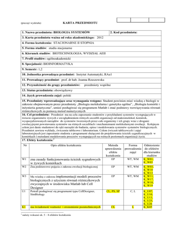 (pieczęć wydziału) KARTA PRZEDMIOTU 1. Nazwa przedmiotu: BIOLOGIA SYSTEMÓW 2. Kod przedmiotu: 3. Karta przedmiotu ważna od roku akademickiego: 2012 4. Forma kształcenia: STACJONARNE II STOPNIA 5. Forma studiów: studia stacjonarne 6. Kierunek studiów: BIOTECHNOLOGIA; WYDZIAŁ AEII 7. Profil studiów: ogólnoakademicki 8. Specjalność: BIOINFORMATYKA 9. Semestr: 1,2 10. Jednostka prowadząca przedmiot: Instytut Automatyki, RAu1 11. Prowadzący przedmiot: prof. dr hab. Joanna Rzeszowska 12. Przynależność do grupy przedmiotów: przedmioty wspólne 13. Status przedmiotu: obowiązkowy 14. Język prowadzenia zajęć: polski 15. Przedmioty wprowadzające oraz wymagania wstępne: Student powinien mieć wiedzę z biologii w zakresie obejmowanym przez przedmioty „Biologia molekularna i genetyka ogólna”, „Biologia komórki i inżynieria genetyczna”, umieć posługiwać się programem Matlab i znać podstawy rozwiązywania równań różniczkowych za pomocą metod numerycznych 16. Cel przedmiotu: Przedmiot ma na celu zapoznanie studentów z przykładami systemów występujących w świecie organizmów żywych z uwzględnieniem różnych szczebli organizacji od makromolekuł, komórek, wyspecjalizowanych narządów do systemów tworzonych przez całe organizmy i ich grupy wraz z drogami ewolucyjnymi powstawania systemów na różnych szczeblach i mechanizmami molekularnymi ewolucji. Kolejnym celem jest danie studentowi do ręki narzędzi do badania, opisu i modelowania systemów systemów biologicznych. Przedmiot zawiera wykłady, ćwiczenia tablicowe i laboratorium. Celem ćwiczeń tablicowych i zajęć laboratoryjnych jest zapoznanie studenta z programami służącymi do projektowania ścieżek sygnalizacyjnych w komórkach i metodami modelowania procesów występujących na rożnych poziomach organizacji życia. 17. Efekty kształcenia:1 Opis efektu kształcenia Metoda sprawdzenia efektu kształcenia W1 zna zasady funkcjonowania ścieżek sygnałowych w żywych komórkach EP WT, WM K_W01, K_W03 W2 Zna podstawowe pojęcia z zakresu ewolucji biologicznej EP WT, WM W3 Ma wiedzę z zakresu implementacji modeli procesów EP WT, WM K_W03, K_W10 K_W13 K_W11, K_W17, K_W18, K_W19 CL, PS, SP C, L CL L Nr Forma Odniesienie prowadzenia do efektów zajęć dla kierunku studiów biologicznych z użyciem równań różniczkowych zwyczajnych w środowisku Matlab lub Cell Designer 1 U1 Potrafi posługiwać się programami typu CellDesigner, SimBiology K1 ma świadomość ważności i zrozumienie pozatechnicznych należy wskazać ok. 5 – 8 efektów kształcenia K_U07, K_U10, K_U13, K_U25, K_U26 K_K05 aspektów i skutków działalności inżynierskiej, potrafi myśleć i działać w sposób kreatywny i przedsiębiorczy 18. Formy zajęć dydaktycznych i ich wymiar (liczba godzin) K2 W. : 30 Ćw. : 15 CL L K_K07 L.: 30 19. Treści kształcenia: Systemy biologiczne wszystkich szczebli charakteryzują się niezwykłym stopniem komplikacji. Celem biologii systemów jest próba integracji wiedzy z różnych dyscyplin i tworzenie modeli funkcjonalnych dających możliwość predykcji zdarzeń. Przedmiot przedstawia przykłady systemów występujących w świecie ożywionym i drogi ich ewolucji. Przedstawiane są mechanizmy regulacji w systemach biologicznych na poziomie organizmalnym (regulacja nerwowa, hormonalna i immunologiczna), narządowym/tkankowym i komórkowym w stanach fizjologicznych i patofizjologicznych. Podstawowym ogniwem wszystkich systemów wyższych szczebli są komórki. Ścieżki sygnałowe i procesy sygnalizacji wewnątrz- i międzykomórkowej są ważnym elementem i wykładu i ćwiczeń laboratoryjnych. Program wykładów Systemy biologiczne od cząsteczek do ekosystemu Powstawanie systemów – ewolucja wczesnych form życia Organizmy proste i złożone – formy życia na Ziemi Systemowa budowa organizmów żywych na przykładzie organizmu człowieka, organy, tkanki, komórki Mechanizmy ewolucji - przykłady ewolucji narządów System krwionośny i elementy homeostazy System nerwowy, budowa i funkcje Wyzwalacze reakcji i systemy odpowiedzi Mechanizmy sygnalizacji między- i wewntątrzkomórkowej Regulacja podziałów komórki - cykl komórkowy Sygnalizacja w warunkach stresu Ćwiczenia tablicowe i zajęcia laboratoryjne obejmują: Modelowanie ścieżek sygnałowych w środowisku CellDesigner Studenta zapoznaje się z jednym z najbardziej popularnych programów służących do projektowania ścieżek sygnalizacyjnych „Cell Designer”, CellDesigner jest darmowym narzędziem (edytorem) służącym do rysowania oraz modelowania sieci reakcji biochemicznych. Edytor obsługuje format SBML (Systems Biology Markup Language) oraz SBGN (Systems Biology Graphical Notation). Wyniki oraz projekt zapisywane są w xml. Za pomocą wbudowanych w CellDesigner’a solverów: SMML ODE solver oraz Copasi można symulować zachowanie się modelu matematycznego i skanować jego poszczególne parametry oraz przeglądać i modyfikować istniejące już modele łącząc się z bazami danych. Deterministyczne symulacje reakcji biochemicznych Student zostaje zaznajomiony z opisem reakcji biochemicznych katalizowanych enzymatycznie. Przedstawione zostają różne typy reakcji typu, w których biorą udział zarówno enzymy, jak i inhibitory: kinetyka MichaelisaMentena, inhibicja współzawodnicza, inhibicja niewspółzawodnicza, częściowa inhibicja, inhibicja substratem, równanie Hilla. Student implementuje równania (układy równań) w dowolnym środowisku, zmienia parametry, obserwuje zmiany stężenia poszczególnych reagentów i wyciąga wnioski odnośnie poszczególnych typów reakcji. Dyfuzja w procesach biologicznych Układy biologiczne i chemiczne są zazwyczaj niejednorodne przestrzennie- szybkość reakcji chemicznych czy prawdopodobieństwo spotkań między żywymi organizmami zależy od ich rozmieszczenia w przestrzeni. Warunki początkowe dla takich układów to funkcje opisujące rozmie