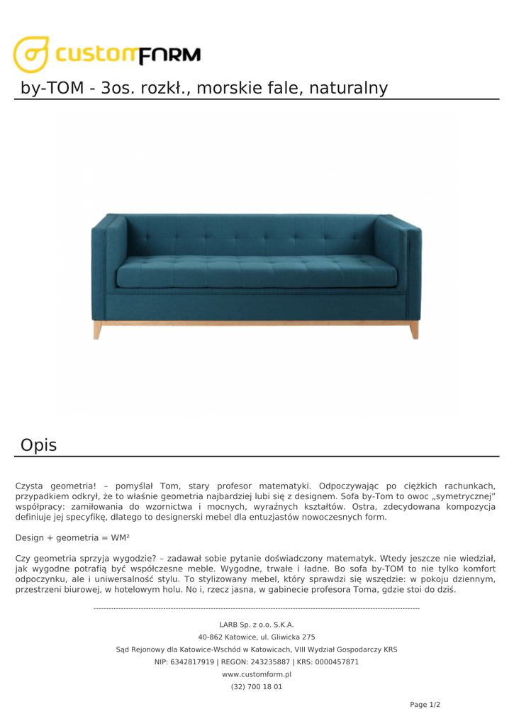 by-TOM - 3os. rozkł., morskie fale, naturalny Opis Czysta geometria! – pomyślał Tom, stary profesor matematyki. Odpoczywając po ciężkich rachunkach, przypadkiem odkrył, że to właśnie geometria najbardziej lubi się z designem. Sofa by-Tom to owoc „symetrycznej” współpracy: zamiłowania do wzornictwa i mocnych, wyraźnych kształtów. Ostra, zdecydowana kompozycja definiuje jej specyfikę, dlatego to designerski mebel dla entuzjastów nowoczesnych form. Design + geometria = WM² Czy geometria sprzyja wygodzie? – zadawał sobie pytanie doświadczony matematyk. Wtedy jeszcze nie wiedział, jak wygodne potrafią być współczesne meble. Wygodne, trwałe i ładne. Bo sofa by-TOM to nie tylko komfort odpoczynku, ale i uniwersalność stylu. To stylizowany mebel, który sprawdzi się wszędzie: w pokoju dziennym, przestrzeni biurowej, w hotelowym holu. No i, rzecz jasna, w gabinecie profesora Toma, gdzie stoi do dziś. ----------------------------------------------------------------------------------------------------------------------------------LARB Sp. z o.o. S.K.A. 40-862 Katowice, ul. Gliwicka 275 Sąd Rejonowy dla Katowice-Wschód w Katowicach, VIII Wydział Gospodarczy KRS NIP: 6342817919 | REGON: 243235887 | KRS: 0000457871 www.customform.pl (32) 700 18 01 Page 1/2 Uwaga! Wybierz kolor, który najbardziej Ci odpowiada! Dostępna kolorystyka tapicerki w załącznikach: "Próbnik tkanin - I, II, III grupa cenowa”. Cena uzależniona jest od rodzaju wybranej tkaniny. Drewniane elementy wykończenia produktu możemy wykonać w kolorach naturalny - jasne drewno, orzech ciemne drewno, biały oraz czarny. Specyfikacja Wysokość 73/s.44 cm Szerokość 208 cm Głębokość 85 cm Głębokość siedziska 60 cm Wykończenie Siedzisko tkanina: 100% polipropylen; wypełnienie: wysokoelastyczna pianka; rama - drewniana tkanina Podstawa drewno Rozkładanie tak Wymiary pow. do spania 180x139 cm Dodatkowe zdjęcia ----------------------------------------------------------------------------------------------------------------------------------LARB Sp. z o.o. S.K.A. 40-862 Katowice, ul. Gliwicka 275 Sąd Rejonowy dla Katowice-Wschód w Katowicach, VIII Wydział Gospodarczy KRS NIP: 6342817919 | REGON: 243235887 | KRS: 0000457871 www.customform.pl (32) 700 18 01 Page 2/2 Powered by TCPDF (www.tcpdf.org)