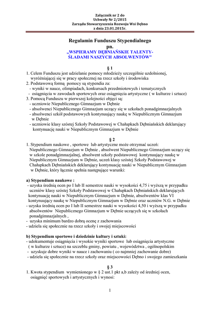 Załącznik nr 2 do Uchwały Nr 2/2015 Zarządu Stowarzyszenia Rozwoju Wsi Dębno z dnia 23.01.2015r. Regulamin Funduszu Stypendialnego pn. ,,WSPIERAMY DĘBNIAŃSKIE TALENTYŚLADAMI NASZYCH ABSOLWENTÓW” §1 1. Celem Funduszu jest udzielanie pomocy młodzieży szczególnie uzdolnionej, wyróżniającej się w pracy społecznej na rzecz szkoły i środowiska 2. Podstawową formą pomocy są stypendia za: - wyniki w nauce, olimpiadach, konkursach przedmiotowych i tematycznych - osiągnięcia w zawodach sportowych oraz osiągnięcia artystyczne ( w kulturze i sztuce) 3. Pomocą Funduszu w pierwszej kolejności objęci są: - uczniowie Niepublicznego Gimnazjum w Dębnie - absolwenci Niepublicznego Gimnazjum uczący się w szkołach ponadgimnazjalnych - absolwenci szkół podstawowych kontynuujący naukę w Niepublicznym Gimnazjum w Dębnie - uczniowie klasy szóstej Szkoły Podstawowej w Chałupkach Dębniańskich deklarujący kontynuację nauki w Niepublicznym Gimnazjum w Dębnie §2 1. Stypendium naukowe , sportowe lub artystyczne może otrzymać uczeń: Niepublicznego Gimnazjum w Dębnie , absolwent Niepublicznego Gimnazjum uczący się w szkole ponadgimnazjalnej, absolwent szkoły podstawowej kontynuujący naukę w Niepublicznym Gimnazjum w Dębnie, uczeń klasy szóstej Szkoły Podstawowej w Chałupkach Dębniańskich deklarujący kontynuację nauki w Niepublicznym Gimnazjum w Dębnie, który łącznie spełnia następujące warunki: a) Stypendium naukowe : - uzyska średnią ocen po I lub II semestrze nauki w wysokości 4,75 i wyższą w przypadku uczniów klasy szóstej Szkoły Podstawowej w Chałupkach Dębniańskich deklarujących kontynuację nauki w Niepublicznym Gimnazjum w Dębnie, absolwentów klas VI kontynuujący naukę w Niepublicznym Gimnazjum w Dębnie oraz uczniów N.G. w Dębnie - uzyska średnią ocen po I lub II semestrze nauki w wysokości 4,50 i wyższą w przypadku absolwentów Niepublicznego Gimnazjum w Dębnie uczących się w szkołach ponadgimnazjalnych , - uzyska minimum bardzo dobrą ocenę z zachowania - udziela się społecznie na rzecz szkoły i swojej miejscowości b) Stypendium sportowe i dziedzinie kultury i sztuki: - udokumentuje osiągnięcia i wysokie wyniki sportowe lub osiągnięcia artystyczne ( w kulturze i sztuce) na szczeblu gminy, powiatu , województwa , ogólnopolskim - uzyskuje dobre wyniki w nauce i zachowaniu ( co najmniej zachowanie dobre) - udziela się społecznie na rzecz szkoły oraz miejscowości Dębno i swojego zamieszkania §3 1. Kwota stypendium wymienionego w § 2 ust.1 pkt a,b zależy od średniej ocen, osiągnięć sportowych i artystycznych i wynosi: 1 Załącznik nr 2 do Uchwały Nr 2/2015 Zarządu Stowarzyszenia Rozwoju Wsi Dębno z dnia 23.01.2015r. a) dla uczniów klasy szóstej Szkoły Podstawowej w Chałupkach Dębniańskich deklarujących kontynuację nauki w Niepublicznym Gimnazjum w Dębnie, absolwentów klas VI szkoły podstawowej kontynuujących naukę w N.G. w Dębnie oraz uczniów Niepublicznego Gimnazjum w Dębnie - do 50 zł. miesięcznie przy średniej 4,75- 4,99 - do 100 zł. miesięcznie przy średniej 5,00 i wyższej - do 50 zł. miesięcznie za osiągnięcia sportowe lub artystyczne na szczeblu gminy, powiatu - do 100 zł miesięcznie za osiągnięcia sportowe lub artystyczne na szczeblu wojewódzkim i ogólnopolskim b) dla uczniów szkół ponadgimnazjalnych będących absolwentami N.G. w Dębnie. - do 100 zł. miesięcznie przy średniej 4,50 - 4,99 - do 150 zł. miesięcznie przy średniej 5,00 i wyższej - do 50 zł. miesięcznie za osiągnięcia sportowe lub artystyczne na szczeblu gminy, powiatu - do 100 zł miesięcznie za osiągnięcia sportowe lub artystyczne na szczeblu wojewódzkim i ogólnopolskim §4 1. Ustala się dwa terminy przyznania stypendium: a) po zakończeniu I semestru ( przyznaje się stypendium na okres styczeń – czerwiec) b) po zakończeniu II semestru ( przyznaje się stypendium na okres wrzesień – grudzień) §5 1. Wniosek do Zarządu Stowarzyszenia o przyznanie stypendium składają rodzice lub prawni opiekunowie dziecka przedstawiając następujące dokumenty: a) wniosek o przyznanie stypendium (zał.nr1do Regulaminu) b) potwierdzoną przez Dyrektora N.G. w Dębnie , Dyrektora Szkoły Podstawowej lub ponadgimnazjalnej informację uczniu tj. o średniej ocen za I lub II semestr danego roku szkolnego, oraz opinię Dyrektora szkoły o aktywności społecznej ucznia ( zał. nr 2) c) list motywacyjny kandydata do stypendium (zał. Nr 3 do regulaminu) d) zobowiązanie się do osobistego uczestnictwa w uroczystości wręczenia promes( zał. nr 4) e) zgodę na przetwarzanie danych osobowych(zał. nr 5 do regulaminu) f) oświadczenie, że uczeń nie uzyskuje dochodów podlegających opodatkowaniu z wyjątkiem renty rodzinnej, oraz dochodów określonych w art.29-30b i art.30e ustawy o podatku dochodowym PIT- 2C ( zał. nr 6 do regulaminu) 2. Brak któregokolwiek załącznika powoduje wezwanie do uzupełnienia ,a w przypadku niedostarczenia dokumentu skutkuje odrzuceniem wniosku na etapie oceny formalnej. §6 1. Decyzje o przyznaniu stypendium każdorazowo podejmuje Zarząd Stowarzyszenia, określając wysokość stypendiów, formę i terminy ich realizacji oraz sposób wypłaty 2. Decyzja Zarządu o przyznaniu stypendium jest ostateczna i nie podlega odwołaniu 3 Do zadań Zarządu w ramach funduszu Stypendialnego należy: -ocena wniosków stypendialnych - przyznawanie stypendiów 4.Ocena wniosków stypendialnych dokonywana jest na podstawie niniejszego Regulaminu Funduszu Stypendialnego zatwierdzonego przez Zarząd Uchwałą Nr 2/2015 z 23.01.2015r. 5.W uzasadnionych przypadkach Zarząd może zażądać od Wnioskodawców dalszych szczegółowych informacji w celu wyjaśnienia wątpliwości w przedłożonych dokumentach 6.Zarząd podejmuje decyzje o przyznaniu stypendium w formie uchwały 2 Załącznik nr 2 do Uchwały Nr 2/2015 Zarządu Stowarzyszenia Rozwoju Wsi Dębno z dnia