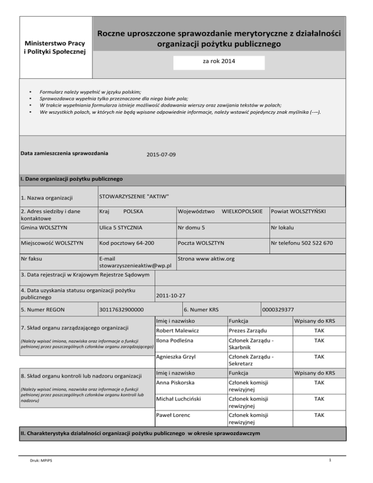 Ministerstwo Pracy ŝWŽůŝƚLJŬŝ^ƉŽųĞĐnjŶĞũ ZŽĐnjŶĞƵƉƌŽƐnjĐnjŽŶĞƐƉƌĂǁŽnjĚĂŶŝĞŵĞƌLJƚŽƌLJĐnjŶĞnjĚnjŝĂųĂůŶŽƑĐŝ ŽƌŐĂŶŝnjĂĐũŝƉŽǏLJƚŬƵƉƵďůŝĐnjŶĞŐŽ za rok 2014 • • • • &ŽƌŵƵůĂƌnjŶĂůĞǏLJǁLJƉĞųŶŝđǁũħnjLJŬƵƉŽůƐŬŝŵ͖ ^ƉƌĂǁŽnjĚĂǁĐĂǁLJƉĞųŶŝĂƚLJůŬŽƉƌnjĞnjŶĂĐnjŽŶĞĚůĂŶŝĞŐŽďŝĂųĞƉŽůĂ͖ tƚƌĂŬĐŝĞǁLJƉĞųŶŝĂŶŝĂĨŽƌŵƵůĂƌnjĂŝƐƚŶŝĞũĞŵŽǏůŝǁŽƑđĚŽĚĂǁĂŶŝĂǁŝĞƌƐnjLJŽƌĂnjnjĂǁŝũĂŶŝĂƚĞŬƐƚſǁǁƉŽůĂĐŚ͖ tĞǁƐnjLJƐƚŬŝĐŚƉŽůĂĐŚ͕ǁŬƚſƌLJĐŚŶŝĞďħĚČǁƉŝƐĂŶĞŽĚƉŽǁŝĞĚŶŝĞŝŶĨŽƌŵĂĐũĞ͕ŶĂůĞǏLJǁƐƚĂǁŝđƉŽũĞĚLJŶĐnjLJnjŶĂŬŵLJƑůŶŝŬĂ;ͲͲʹͿ͘ Data zamieszczenia sprawozdania 2015-07-09 /͘ĂŶĞŽƌŐĂŶŝnjĂĐũŝƉŽǏLJƚŬƵƉƵďůŝĐnjŶĞŐŽ 1. Nazwa organizacji STOWARZYSZENIE "AKTIW" 2. Adres siedziby i dane kontaktowe Kraj Gmina WOLSZTYN Ulica 5 STYCZNIA Nr domu 5 Nr lokalu DŝĞũƐĐŽǁŽƑđtK>^dzE Kod pocztowy 64-200 Poczta WOLSZTYN Nr telefonu 502 522 670 Nr faksu E-mail [email protected] Strona www aktiw.org POLSKA Województwo WIELKOPOLSKIE WŽǁŝĂƚtK>^dzF^</ ϯ͘ĂƚĂƌĞũĞƐƚƌĂĐũŝǁ<ƌĂũŽǁLJŵZĞũĞƐƚƌnjĞ^ČĚŽǁLJŵ ϰ͘ĂƚĂƵnjLJƐŬĂŶŝĂƐƚĂƚƵƐƵŽƌŐĂŶŝnjĂĐũŝƉŽǏLJƚŬƵ publicznego 5. Numer REGON 30117632900000 ϳ͘^ŬųĂĚŽƌŐĂŶƵnjĂƌnjČĚnjĂũČĐĞŐŽŽƌŐĂŶŝnjĂĐũŝ ;EĂůĞǏLJǁƉŝƐĂđŝŵŝŽŶĂ͕ŶĂnjǁŝƐŬĂŽƌĂnjŝŶĨŽƌŵĂĐũĞŽĨƵŶŬĐũŝ ƉĞųŶŝŽŶĞũƉƌnjĞnjƉŽƐnjĐnjĞŐſůŶLJĐŚĐnjųŽŶŬſǁŽƌŐĂŶƵnjĂƌnjČĚnjĂũČĐĞŐŽͿ ϴ͘^ŬųĂĚŽƌŐĂŶƵŬŽŶƚƌŽůŝůƵďŶĂĚnjŽƌƵŽƌŐĂŶŝnjĂĐũŝ ;EĂůĞǏLJǁƉŝƐĂđŝŵŝŽŶĂ͕ŶĂnjǁŝƐŬĂŽƌĂnjŝŶĨŽƌŵĂĐũĞŽĨƵŶŬĐũŝ ƉĞųŶŝŽŶĞũƉƌnjĞnjƉŽƐnjĐnjĞŐſůŶLJĐŚĐnjųŽŶŬſǁŽƌŐĂŶƵŬŽŶƚƌŽůŝůƵď nadzoru) 2011-10-27 6. Numer KRS 0000329377 /ŵŝħŝŶĂnjǁŝƐŬŽ Funkcja Wpisany do KRS Robert Malewicz WƌĞnjĞƐĂƌnjČĚƵ TAK /ůŽŶĂWŽĚůĞƑŶĂ njųŽŶĞŬĂƌnjČĚƵͲ Skarbnik TAK Agnieszka Grzyl njųŽŶĞŬĂƌnjČĚƵͲ Sekretarz TAK /ŵŝħŝŶĂnjǁŝƐŬŽ Funkcja Anna Piskorska njųŽŶĞŬŬŽŵŝƐũŝ rewizyjnej TAK DŝĐŚĂų>ƵĐŚĐŝŷƐŬŝ njųŽŶĞŬŬŽŵŝƐũŝ rewizyjnej TAK WĂǁĞų>ŽƌĞŶĐ njųŽŶĞŬŬŽŵŝƐũŝ rewizyjnej TAK Wpisany do KRS //͘ŚĂƌĂŬƚĞƌLJƐƚLJŬĂĚnjŝĂųĂůŶŽƑĐŝŽƌŐĂŶŝnjĂĐũŝƉŽǏLJƚŬƵƉƵďůŝĐnjŶĞŐŽǁŽŬƌĞƐŝĞƐƉƌĂǁŽnjĚĂǁĐnjLJŵ Druk: MPiPS 1 ϭ͘KƉŝƐĚnjŝĂųĂůŶŽƑĐŝƉŽǏLJƚŬƵƉƵďůŝĐnjŶĞŐŽ ϭ͘ϭ͘KƉŝƐŐųſǁŶLJĐŚ ĚnjŝĂųĂŷƉŽĚũħƚLJĐŚ ƉƌnjĞnjŽƌŐĂŶŝnjĂĐũħ 09.01.2014ƌ͘ĂũħĐŝĂŶĂďĂƐĞŶŝĞ͕ 16.01.2014ƌ͘ĂũħĐŝĂŶĂďĂƐĞŶŝĞ͕ 30.01.2014r. Spotkanie Stowarzyszenia, 06.02.2014ƌ͘ĂũħĐŝĂŶĂďĂƐĞŶŝĞ͕ 20.02.2014ƌ͘ĂũħĐŝĂŶĂďĂƐĞŶŝĞ͕ 27.02.2014ƌ͘DŝƐƚƌnjŽƐƚǁĂ<d/tǁŬƌħŐůĞ͕ 20.03.2014ƌ͘ĂũħĐŝĂŶĂďĂƐĞŶŝĞ͕ 06.03.2014ƌ͘ĂũħĐŝĂŶĂďĂƐĞŶŝĞ͕ 27.03.2014r. Spotkanie Stowarzyszenia, 03.04.2014ƌ͘ĂũħĐŝĂŶĂďĂƐĞŶŝĞ͕ 17.04.2014ƌ͘ĂũħĐŝĂŶĂďĂƐĞŶŝĞ͕ 24.04.2014r. Spotkanie Stowarzyszenia, 26.04.2014ƌ͘tLJĐŝĞĐnjŬĂƌŽǁĞƌŽǁĂĚŽWĂŷƐƚǁĂZĂĚĂũĞǁƐŬŝĐŚĚŽZŽƐƚĂƌnjĞǁĂ͕ 08.05.2014ƌ͘ĂũħĐŝĂŶĂďĂƐĞŶŝĞ͕ 15.05.2015ƌ͘ĂũħĐŝĂŶĂďĂƐĞŶŝĞ͕ 19.05.2014r. Muzyczna Majówka AKTIWA, 29.05.2014r. Spotkanie Stowarzyszenia, 05.06.2014ƌ͘ĂũħĐŝĂŶĂďĂƐĞŶŝĞ͕ 19.06.2014ƌ͘ĂũħĐŝĂŶĂďĂƐĞŶŝĞ͕ 27-29.06.2014ƌ͘tĞĞŬĞŶĚŶĂZĂŶĐnjƵtĂůŬŽǁŝĂŬſǁǁ'ƌƵũĐƵDĂųLJŵ͕ 03.07.2014ƌ͘ĂũħĐŝĂŶĂďĂƐĞŶŝĞ͕ 17.07.2014ƌ͘ĂũħĐŝĂŶĂďĂƐĞŶŝĞ͕ 19.07.2014ƌ͘^ƉųLJǁŬĂũĂŬŽǁLJƌnjĞŬČŽũĐČ͕ 31.07.2014r. Spotkanie Stowarzyszenia, 07.08.2014ƌ͘ĂũħĐŝĂŶĂďĂƐĞŶŝĞ͕ 15.08.2014ƌ͘ĂũħĐŝĂŶĂďĂƐĞŶŝĞ͕ 22-24.08.2014ƌ͘KďſnjƐƉŽƌƚŽǁLJǁKƑƌŽĚŬƵtŝĞůŬŽƉŽůƐŬĂǁZƵĚŶŝĞ͕ 28.08.2014r. Spotkanie Stowarzyszenia, 04.09.2014ƌ͘ĂũħĐŝĂŶĂďĂƐĞŶŝĞ͕ 18.09.2014ƌ͘ĂũħĐŝĂŶĂďĂƐĞŶŝĞ͕ 25.09.2014r. Spotkanie u Ireny w ogrodzie, 02.10.2014ƌ͘ĂũħĐŝĂŶĂďĂƐĞŶŝĞ͕ 28.10.2014r. Wyjazd do Teatru Wielkiego w Poznaniu, 16.10.2014ƌ͘ĂũħĐŝĂŶĂďĂƐĞŶŝĞ͕ 30.10.2014r. Spotkanie Stowarzyszenia, 06.11.2014ƌ͘ĂũħĐŝĂŶĂďĂƐĞŶŝĞ͕ 16.11.2014r. Wyjazd do Kinepolis w Poznaniu, 20.11.2014ƌ͘ĂũħĐŝĂŶĂďĂƐĞŶŝĞ͕ 27.11.2014r. Spotkanie Stowarzyszenia, 04.12.2014ƌ͘ĂũħĐŝĂŶĂďĂƐĞŶŝĞ͕ 18.12.2014r. Spotkanie wigilijne Stowarzyszenia AKTIW. ŶĂũďůŝǏƐnjĞƐČƐŝĞĚnjƚǁŽ;ŽƐŝĞĚůĞ͕ĚnjŝĞůŶŝĐĂ͕ƐŽųĞĐƚǁŽ͕ǁŝĞƑ͕ƉƌnjLJƐŝſųĞŬͿ ϭ͘Ϯ͘ĂƐŝħŐƚĞƌLJƚŽƌŝĂůŶLJĨĂŬƚLJĐnjŶŝĞƉƌŽǁĂĚnjŽŶĞũ ƉƌnjĞnjŽƌŐĂŶŝnjĂĐũħĚnjŝĂųĂůŶŽƑĐŝƉŽǏLJƚŬƵ publicznego ;EĂůĞǏLJǁƐŬĂnjĂđũĞĚŶČůƵďǁŝħĐĞũƉŽnjLJĐũŝͿ gmina województwo kilka gmin kilka województw powiat ĐĂųLJŬƌĂũ kilka powiatów poza granicami kraju Ϯ͘/ŶĨŽƌŵĂĐũĂĚŽƚLJĐnjČĐĂůŝĐnjďLJŽĚďŝŽƌĐſǁĚnjŝĂųĂŷŽƌŐĂŶŝnjĂĐũŝƉŽǏLJƚŬƵƉƵďůŝĐnjŶĞŐŽw okresie sprawozdawczym Ϯ͘ϭ͘>ŝĐnjďĂŽĚďŝŽƌĐſǁĚnjŝĂųĂŷŽƌŐĂŶŝnjĂĐũŝ Osoby fizyczne 500 ;EĂůĞǏLJŽƐnjĂĐŽǁĂđůŝĐnjďħŽĚďŝŽƌĐſǁĚnjŝĂųĂŷŽƌŐĂŶŝnjĂĐũŝǁŽŬƌĞƐŝĞ sprawozdawczym, w podziale na osoby fizyczne i osoby prawne) Osoby prawne 0 Druk: MPiPS 2 2.2. Informacje na temat ŝŶŶLJĐŚ;ŶŝǏǁLJŵŝĞŶŝŽŶLJĐŚǁ pkt 2.1) odbiorców, na rzecz ŬƚſƌLJĐŚŽƌŐ