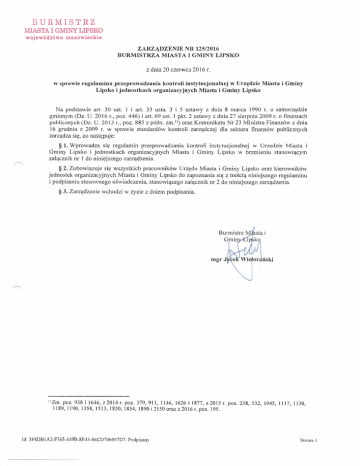 BURMISTRZ MIASTA I GMINY LIPSKO w ojewództw o m azow ieckie ZARZĄDZENIE NR 125/2016 BURM ISTRZA MIASTA I GMINY LIPSKO z dnia 20 czerwca 2016 r. w sprawie regulaminu przeprowadzania kontroli instytucjonalnej w Urzędzie Miasta i Gminy Lipsko i jednostkach organizacyjnych Miasta i Gminy Lipsko Na podstawie art. 30 ust. 1 i art. 33 usta. 3 i 5 ustawy z dnia 8 marca 1990 r. o samorządzie gminnym (Dz. U. 2016 r., poz. 446) i art. 69 ust. 1 pkt. 2 ustawy z dnia 27 sierpnia 2009 r. o finansach publicznych (Dz. U. 2013 r., poz. 885 z późn. zm.')) oraz Komunikatu Nr 23 M inistra Finansów z dnia 16 grudnia z 2009 r. w sprawie standardów kontroli zarządczej dla sektora finansów publicznych zarządza się, co następuje: § 1. W prowadza się regulamin przeprowadzania kontroli instytucjonalnej w Urzędzie M iasta i Gminy Lipsko i jednostkach organizacyjnych M iasta i Gminy Lipsko w brzmieniu stanowiącym załącznik nr 1 do niniejszego zarządzenia. § 2. Zobowiązuje się wszystkich pracowników Urzędu M iasta i Gminy Lipsko oraz kierowników jednostek organizacyjnych M iasta i Gminy Lipsko do zapoznania się z treścią niniejszego regulaminu i podpisaniu stosownego oświadczenia, stanowiącego załącznik nr 2 do niniejszego zarządzenia. § 3. Zarządzenie wchodzi w życie z dniem podpisania. Bui ii C mgr J ński °Zm. poz. 938 i 1646, z2014r. poz. 379, 911, 1146, 1626 i 1877, z2015 r. poz. 238, 532, 1045, 1117, 1130, 1189, 1190, 1358, 1513, 1830, 1854, 1890 i 2150 orazz2016 r. poz. 195. Id: 3F8D B1A2-F365-449B-8E43-86CD706087D 7. Podpisany Strona 1 BURMISTRZ MIASTA I GMINY LIPSKO w ojewództw o m azow ieckie Załącznik N r 1 do Zarządzenia Nr 125/2016 Burmistrza M iasta i Gminy Lipsko z dnia 20 czerwca 2016 r. Regulamin kontroli instytucjonalnej przeprowadzanej w Urzędzie Miasta i Gminy Lipsko i jednostkach organizacyjnych Miasta i Gminy Lipsko Rozdział 1. Uregulowania ogólne § 1. Kontrola instytucjonalna stanowi wsparcie dla Burmistrza M iasta i Gminy Lipsko w realizacji wymogów art. 247 ust. 2 ustawy z dnia 27 sierpnia 2009 r. o finansach publicznych w zakresie sprawowanego nadzoru nad realizacją określonych uchwalą budżetową, dochodów i wydatków budżetu Miasta i Gminy Lipsko. Rozdział 2. Cele i zadania kontroli instytucjonalnej. Rodzaje kontroli instytucjonalnej. § 2 .1 . Celem kontroli instytucjonalnej jest pomoc kierownictwu w doskonaleniu metod zarządzania jednostkam i kontrolowanymi poprzez ustalanie i eliminowanie w toku kontroli nieprawidłowości oraz wykonanie czynności sprawdzających realizację zaleceń pokontrolnych zawartych w zaleceniach pokontrolnych Burmistrza M iasta i Gminy Lipsko oraz wniosków i uwag w przedstawionych protokołach kontroli. 2. Kontrola instytucjonalna jest jednym z elementów kontroli zarządczej, o której mowa w art. 68 ustawy z dnia 27 sierpnia 2009 r. o finansach publicznych, realizowanej przez ogól działań podejmowanych dla zapewnienia realizacji celów i zadań w sposób zgodny z prawem, efektywny, oszczędny i terminowy. Prowadzona kontrola instytucjonalna poprzez inicjowanie działań korygujących i naprawczych bazujących na wynikach postępowań kontrolnych wspomaga kierowników jednostek kontrolowanych oraz Burmistrza Miasta i Gminy Lipsko w realizacji obowiązków dotyczących zapewnienia funkcjonowania kontroli zarządczej. § 3 . 1. Kontrola instytucjonalna ma głównie charakter kontroli następczej i na ogól polega na badaniu przedsięwzięć i operacji już zrealizowanych. Jest analizą sprawności działania operacyjnego, sprawdzeniem czy dany zakres czynności został wykonany zgodnie z założeniami i w ustalonej kolejności oraz czy podczas jego realizacji zostały wyeliminowane wcześniej zauważone negatywne odstępstwa od przyjętych norm. 2. Do zadań kontroli instytucjonalnej zaliczyć należy m.in.: 1) badanie zgodności wewnętrznymi; działania z obowiązującymi przepisami prawa i uregulowaniami 2) ocenianie kontroli zarządczej, której celem jest zapewnienie w szczególności: a) zgodności działalności z przepisami prawa oraz procedurami wewnętrznymi, b) skuteczności i efektowności działania, c) wiarygodności sprawozdań, d) ochrony zasobów, e) przestrzegania i promowania zasad etycznego postępowania, f) efektywności i skuteczności przepływu informacji, g) zarządzania ryzykiem, Id: 3F8D B 1A2-F365-449B-8E43-86CD 706087D 7. Podpisany Strona 1 3) prawidłowości realizacji przyjętych kierunków działania, 4) ocenianie kontrolowanych zadań pod względem legalności, gospodarności, celowości, rzetelności i zasadności podejmowanych działań, 5) ustalanie przyczyn odpowiedzialnych, i skutków stwierdzonych nieprawidłowości, a także osób za nie 6) wskazanie sposobów umożliwiających uniknięcie w przyszłości stwierdzonych nieprawidłowości (min. niegospodarności, m arnotrawstwa zasobów, nadużyć itp.). § 4. W ykonanie zadań kontroli instytucjonalnej następuje w w yniku przeprow adzenia: 1. Kontroli planowanych: 1) kompleksowych - polegających na badaniu całokształtu działalności jednostki kontrolowanej, ogółu operacji gospodarczych i odpowiadających im czynności, dokumentów i zapisów ewidencyjnych, 2) problemowych - polegających na badaniu wybranego odcinka działalności lub wybranego zagadnienia, 3) sprawdzających - polegających na sprawdzeniu wykonania zaleceń pokontrolnych wydanych przez Burmistrza Miasta i Gminy Lipsko w wyniku stwierdzonych nieprawidłowości; 2. Kontroli nieplanowanych mających formę kontroli doraźnych polegających na badaniu wybranych operacji, czynności i odpowiadających im dokumentów. Kontrole doraźne wykonywane są na polecenie Burmistrza M iasta i Gminy Lipsko, mają charakter interwencyjny, wynikający z potrzeby pilnego zbadania wskazanego zakresu. § 5. Postępowanie kontrolne odbywa się według zasad: 1) legalności- stanowiącej, że sama kontrola, jak i zakres przedmiotowy i podmiotowy muszą być umoco