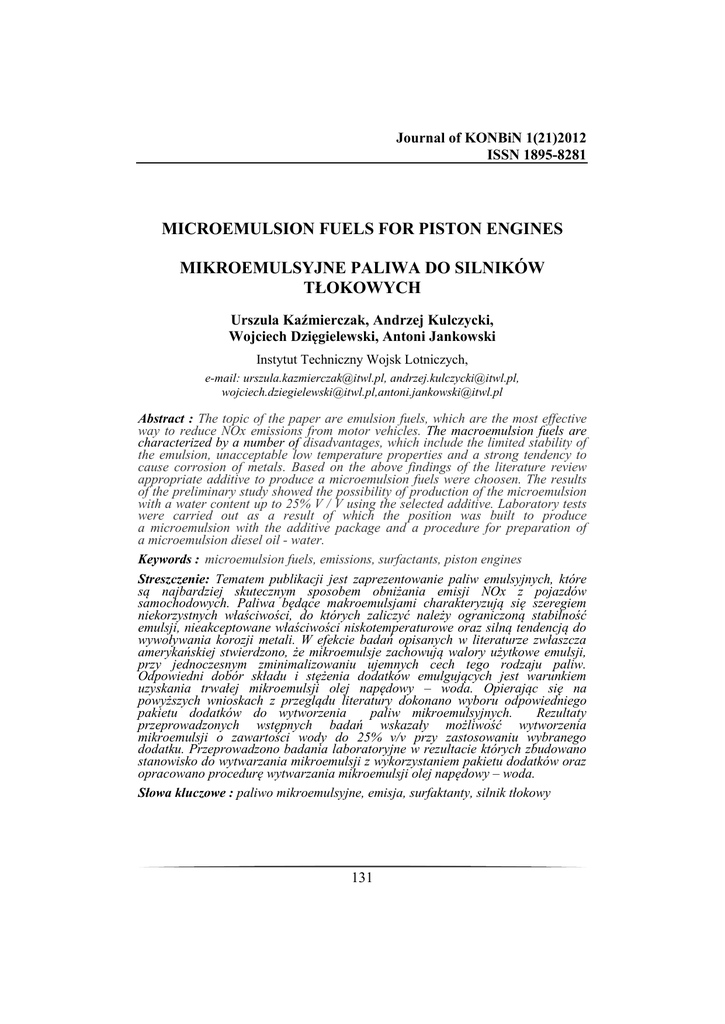 microemulsion fuels for piston engines mikroemulsyjne paliwa do