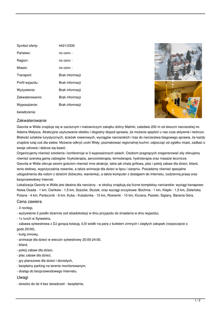 Symbol oferty: 4421/2330 Państwo: no conv : Region: no conv : Miasto: no conv : Transport: Brak informacji Profil wyjazdu: Brak informacji Wyżywienie: Brak informacji Zakwaterowanie: Brak informacji Wyposażenie: Brak informacji świadczenia: Zakwaterowanie Geovita w Wiśle znajduje się w zacisznym i malowniczym zakątku doliny Malinki, zaledwie 200 m od skoczni narciarskiej im. Adama Małysza. Atrakcyjne usytuowanie obiektu i dogodny dojazd sprawia, że możecie spędzić u nas czas aktywnie i twórczo. Bliskość szlaków turystycznych, ścieżek rowerowych, wyciągów narciarskich i tras do narciarstwa biegowego sprawia, że każdy znajdzie tutaj coś dla siebie. Możecie odkryć uroki Wisły, posmakować regionalnej kuchni, odpocząć od zgiełku miast, zadbać o swoje zdrowie i dobrze się bawić. Organizujemy również szkolenia i konferencje w 3 wyposażonych salach. Osobom pragnących zregenerować siły oferujemy również szeroką gamę zabiegów: fizykoterapia, aerozoloterapia, termoterapia, hydroterapia oraz masaże lecznicze. Geovita w Wiśle oferuje swoim gościom również inne atrakcje, takie jak chata grillowa, plac i pokój zabaw dla dzieci, bilard, tenis stołowy, wypożyczalnię rowerów, a także animacje dla dzieci w lipcu i sierpniu. Posiadamy również specjalne udogodnienia dla rodzin z dziećmi (łóżeczko, wanienka), a także komputer z dostępem do Internetu, codzienną prasę oraz bezprzewodowy Internet. Lokalizacja Geovity w Wiśle jest idealna dla narciarzy - w okolicy znajdują się liczne kompleksy narciarskie: wyciągi kanapowe: Nowa Osada - 1 km, Cieńków - 1,5 km, Soszów, Stożek, oraz wyciągi orczykowe: Bochnia - 1 km, Klepki - 1,5 km, Zieleńska Polana - 4 km, Partecznik - 6 km, Kuba - Kubalonka - 15 km, Rowienki - 10 km, Kiczera, Pasieki, Siglany, Barania Góra. Cena zawiera - 3 noclegi, - wyżywienie 2 posiłki dziennie (od obiadokolacji w dniu przyjazdu do śniadania w dniu wyjazdu), - 1x lunch w Sylwestra, - zabawa sylwestrowa z DJ gorącą kolacją, 0,5l wódki na parę z bufetem zimnych i ciepłych zakąsek (rozpoczęcie o godz.20:00), - kulig zimowy, - animacje dla dzieci w wieczór sylwestrowy 20:00-24:00, - bilard, - pokój zabaw dla dzieci, - plac zabaw dla dzieci, - gry planszowe dla dzieci i dorosłych, - bezpłatny parking na terenie monitorowanym, - dostęp do bezprzewodowego Internetu. Uwagi - dziecko do lat 4 bez świadczeń - bezpłatnie, 1/2 - opłata miejscowa dodatkowa płatna według lokalnego taryfikatora, - doba hotelowa od godz. 14.00 do godz. 12.00, - ośrodek nie przyjmuje Gości ze zwierzętami, - parking monitorowany, - bliskość kompleksów narciarskich. Atrakcje: - Skocznia narciarska im. A.Małysza w Wiśle, - Galeria trofeów Adama Małysza,(prywatne muzeum), - Muzeum narciarstwa, - Zamek Prezydenta Rzeczypospolitej Polskiej w Wiśle, - Muzeum Beskidzkie, - Pętla Cieńkowska (szlak), - Kolej krzesełkowa, - Do źródeł turysycznych (szlak), - Chata Jana Kawuloka w Istebnej, - Stary Zamek w Żywcu, - Park Zamkowy w Żywcu, - Kolej krzesełkowa Czantoria, - Park linowy, - Tor saneczkowy, - Wieża widokowa znajdująca się po czeskiej stronie Czantorii, - Leśny Park Niespodzianek, - Góra Zamkowa - Wieża Piastowska, - Rotunda Św. Mikołaja. TERMINY: CENNIK: Długość pobytu: dni Grupa cenowa: Waluta: PLN Aktualne ceny z systemu S.A.R.T. (-) - cena usługi, podatku kalkulowana przy osobie lub gratis (*) - kwota wliczona w cenę standardową 2/2