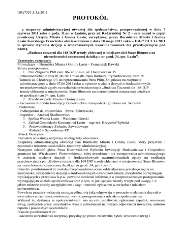IBG.7331.3.5.ś.2011 PROTOKÓŁ z rozprawy administracyjnej otwartej dla społeczeństwa, przeprowadzonej w dniu 7 czerwca 2011 roku o godz. 11.oo w Łasinie, przy ul. Radzyńskiej Nr 2 – sala narad w części piwnicznej Urzędu Miasta i Gminy Łasin, zarządzonej przez Burmistrza Miasta i Gminy Łasin Kawskiego Franciszka obwieszczeniem z dnia 10 maja 2011 roku – IBG.7331.3.3.ś.2011 w sprawie wydania decyzji o środowiskowych uwarunkowaniach dla przedsięwzięcia pod nazwą „Budowa tuczarni dla 168 DJP trzody chlewnej w miejscowości Stare Błonowo na nieruchomości oznaczonej działką o nr geod. 34, gm. Łasin”. Uczestnicy rozprawy: Prowadzący - Burmistrz Miasta i Gminy Łasin – Franciszek Kawski Strony postępowania: 1. Pan Zbigniew Plitt zam. 86-320 Łasin, ul. Dworcowa nr 35 - Pełnomocnictwo z dnia 01.06.2011 roku dla Pana Bartosza Frymarkiewicza, zam. w Toruniu ul. Chrobrego 3/3 do reprezentowania Pana Plitta Zbigniewa na rozprawie administracyjnej w dniu 07.06.2011 roku w sprawie wydania decyzji o środowiskowych uwarunkowaniach zgody na realizacje przedsięwzięcia „Budowa Tuczarni dla 168 DJP trzody chlewnej w miejscowości Stare Błonowo na nieruchomości oznaczonej działką o nr geodezyjnym 34, gm. Łasin 2. Przedstawiciele Miasta i Gminy Łasin: - Kierownik Referatu Inwestycji Budownictwa i Gospodarki gruntami inż. Wiesław Piotrowski, - Podinspektor ds. środowiska – Paweł Zakrzewski, - Inspektor - Andrzej Stachnowicz, 3. Spółka Wodna Łasin – Waldemar Górski 4. Zakład Gospodarki Komunalnej Łasin – mgr inż. Krzysztof Rybicki 5. Przewodniczący Związku Zawodowego Rolników Samoobrony RP Marek Duszyński Pozostali uczestnicy rozprawy według listy obecności. Rozprawę administracyjną otworzył Pan Burmistrz Miasta i Gminy Łasin, który przywitał i zapoznał z tematem uczestników rozprawy administracyjnej. Następnie udzielił głosu Panu Kierownikowi Referatu Inwestycji Budownictwa i Gospodarki gruntami inż. Wiesławowi Piotrowskiemu, który przedstawił tok postępowania administracyjnego w zakresie wydania decyzji o środowiskowych uwarunkowaniach zgody na realizację przedsięwzięcia pn.:„Budowa tuczarni dla 168 DJP trzody chlewnej w miejscowości Stare Błonowo na nieruchomości oznaczonej działką o nr geod. 34, gm. Łasin”. Ponadto poinformował że została przeprowadzona ocena oddziaływania przedsięwzięcia na środowisko, uzasadnienie decyzji o środowiskowych uwarunkowaniach, niezależnie od wymagań wynikających z przepisów k.p.a., powinno zawierać informacje o przeprowadzonym postępowaniu wymagającym udziału społeczeństwa oraz o tym, w jaki sposób zostały wzięte pod uwagę, i w jakim zakresie zostały uwzględnione uwagi i wnioski zgłoszone w związku z udziałem społeczeństwa. Powyższe przepisy wskazują na szczególną rolę jaką odgrywają w procesie wydawania decyzji o uwarunkowaniach środowiskowych wyniki postępowania z udziałem społeczeństwa. Wskazał że, dyskusja ze społeczeństwem ma na celu możliwość zgłaszania zapytań, wnoszenia uwag, zastrzeżeń przez uczestników wraz z udzielaniem na bieżąco odpowiedzi inwestora, autorów raportu i pozostałych uczestników. Ponadto poinformował że: - każdemu uczestnikowi rozprawy przysługuje prawo zadawania pytań, wnoszenia uwag i zastrzeżeń, co należy robić za pośrednictwem prowadzącego rozprawę, z jednoczesnym podaniem imienia i nazwiska w celu zapisania zadającego pytanie i treści pytania do -2protokołu, - rozprawa nie rozstrzyga realizacji inwestycji, jest elementem postępowania administracyjnego i służy zagwarantowaniu dobrej komunikacji społeczeństwa z organami administracji publicznej i inwestorem, - stronom rozprawy przysługuje prawo do wniesienia sprostowań, zmian lub uzupełnień co do treści protokołu, lub zgłosić odmowę podpisania protokołu, - przebieg rozprawy oraz prowadzona w jej trakcie dyskusja ze społeczeństwem zostanie ujęta w uzasadnieniu decyzji administracyjnej, - protokół rozprawy zostanie opublikowany na stronie Biuletynu Informacji Publicznej Urzędu Miasta i Gminy Łasin. Prowadzący rozprawę udzielił głosu Panu Pełnomocnikowi Bartoszowi Frymarkiewiczowi, który przedstawił charakterystykę przedsięwzięcia i warunki użytkowania terenu w fazie budowy i eksploatacji. Poinformował że, funkcjonowanie obiektu nie pogorszy stanu środowiska w analizowanym terenie. Analiza rozwiązań i obliczenia wykazały, że uciążliwości chlewni będą się mieściły wyłącznie w granicach terenu, do którego Inwestor posiada tytuł prawny. Najbliższe zabudowania zagrodowe znajdują się w odległości 153 m w kierunku północnym. W skutek zastosowanych rozwiązań technologicznych - podziemne szczelne zbiorniki na gnojowicę stabilizowana absorbentami mineralnymi i biologicznymi, wentylacja podkorytarzowa) gwarantująca minimalne oddziaływanie na środowisko, zwierzęta w tym pszczoły i ludzi. Prowadzący poprosił o zadawanie pytań. Pytanie - Zientarska Anna Jakie gwarancie Pan daje, że ten zapach nie pójdzie dalej ? Odpowiada -Frymarkiewicz Bartosz Powołam się na doświadczenia praktyczne wynikające z wybudowanych wcześniej obiektów tego typu że zapach – uciążliwości będą w granicach działki nr 34 w Starym Błonowie. W nowej chlewni planuje się bezściołowy (rusztowy) system chowu. Przy zaproponowanym systemie technologicznym możliwość wystąpienia substancji złowonnych zostanie w dużej części mocno ograniczona z powodu stałego przekazywania gnojówki do szczelnego zbiornika . Emisja dotyczyć ma krótkiego okresu czasu, kiedy to gnojowica będzie wywożona na pole. W skutek zastosowanych rozwiązań technologicznych (podziemne szczelne zbiorniki na gnojowicę stabilizowaną absorbentami mineralnymi i biologicznymi, wentylacja podkorytarzowa - gwarantują minimalne oddziaływanie na środowisko, zwierzęta w tym pszczoły i ludzi. Powyższe informacje zost