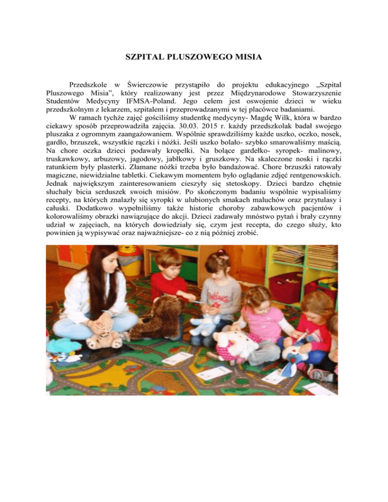 SZPITAL PLUSZOWEGO MISIA Przedszkole w Świerczowie przystąpiło do projektu edukacyjnego „Szpital Pluszowego Misia”, który realizowany jest przez Międzynarodowe Stowarzyszenie Studentów Medycyny IFMSA-Poland. Jego celem jest oswojenie dzieci w wieku przedszkolnym z lekarzem, szpitalem i przeprowadzanymi w tej placówce badaniami. W ramach tychże zajęć gościliśmy studentkę medycyny- Magdę Wilk, która w bardzo ciekawy sposób przeprowadziła zajęcia. 30.03. 2015 r. każdy przedszkolak badał swojego pluszaka z ogromnym zaangażowaniem. Wspólnie sprawdziliśmy każde uszko, oczko, nosek, gardło, brzuszek, wszystkie rączki i nóżki. Jeśli uszko bolało- szybko smarowaliśmy maścią. Na chore oczka dzieci podawały kropelki. Na bolące gardełko- syropek- malinowy, truskawkowy, arbuzowy, jagodowy, jabłkowy i gruszkowy. Na skaleczone noski i rączki ratunkiem były plasterki. Złamane nóżki trzeba było bandażować. Chore brzuszki ratowały magiczne, niewidzialne tabletki. Ciekawym momentem było oglądanie zdjęć rentgenowskich. Jednak największym zainteresowaniem cieszyły się stetoskopy. Dzieci bardzo chętnie słuchały bicia serduszek swoich misiów. Po skończonym badaniu wspólnie wypisaliśmy recepty, na których znalazły się syropki w ulubionych smakach maluchów oraz przytulasy i całuski. Dodatkowo wypełniliśmy także historie choroby zabawkowych pacjentów i kolorowaliśmy obrazki nawiązujące do akcji. Dzieci zadawały mnóstwo pytań i brały czynny udział w zajęciach, na których dowiedziały się, czym jest recepta, do czego służy, kto powinien ją wypisywać oraz najważniejsze- co z nią później zrobić.