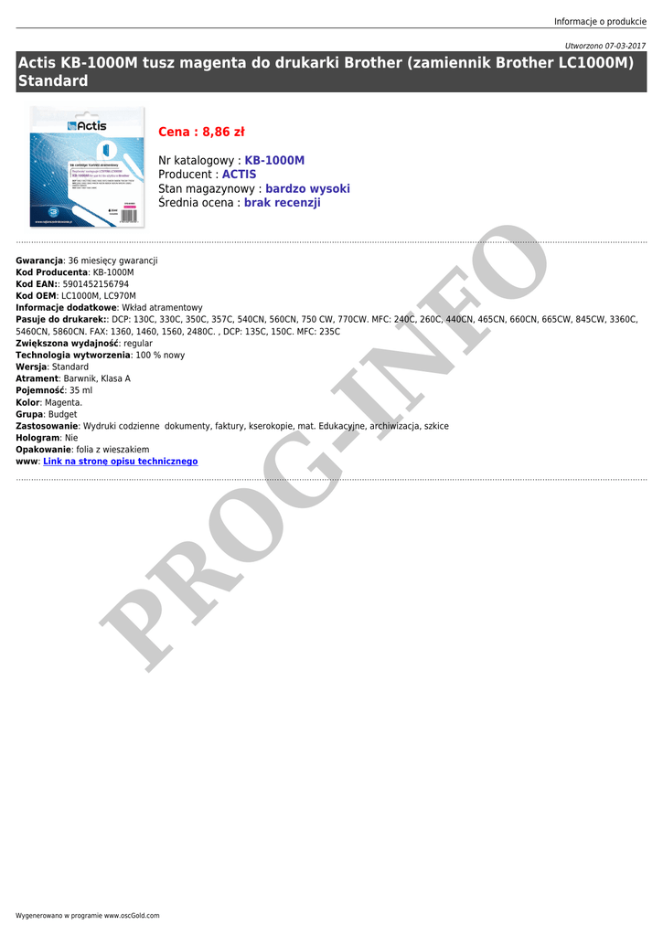 Informacje o produkcie Utworzono 07-03-2017 Actis KB-1000M tusz magenta do drukarki Brother (zamiennik Brother LC1000M) Standard Cena : 8,86 zł Nr katalogowy : KB-1000M Producent : ACTIS Stan magazynowy : bardzo wysoki Średnia ocena : brak recenzji PR O G -I N FO Gwarancja: 36 miesięcy gwarancji Kod Producenta: KB-1000M Kod EAN:: 5901452156794 Kod OEM: LC1000M, LC970M Informacje dodatkowe: Wkład atramentowy Pasuje do drukarek:: DCP: 130C, 330C, 350C, 357C, 540CN, 560CN, 750 CW, 770CW. MFC: 240C, 260C, 440CN, 465CN, 660CN, 665CW, 845CW, 3360C, 5460CN, 5860CN. FAX: 1360, 1460, 1560, 2480C. , DCP: 135C, 150C. MFC: 235C Zwiększona wydajność: regular Technologia wytworzenia: 100 % nowy Wersja: Standard Atrament: Barwnik, Klasa A Pojemność: 35 ml Kolor: Magenta. Grupa: Budget Zastosowanie: Wydruki codzienne dokumenty, faktury, kserokopie, mat. Edukacyjne, archiwizacja, szkice Hologram: Nie Opakowanie: folia z wieszakiem www: Link na stronę opisu technicznego Wygenerowano w programie www.oscGold.com