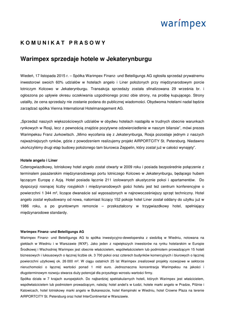 KOMUNIKAT PRASOWY Warimpex sprzedaje hotele w Jekaterynburgu Wiedeń, 17 listopada 2015 r. – Spółka Warimpex Finanz- und Beteiligungs AG ogłosiła sprzedaż prywatnemu inwestorowi swoich 60% udziałów w hotelach angelo i Liner położonych przy międzynarodowym porcie lotniczym Kolcowo w Jekaterynburgu. Transakcja sprzedaży została sfinalizowana 29 września br. i ogłoszona po upływie okresu oczekiwania uzgodnionego przez obie strony, na prośbę kupującego. Strony ustaliły, że cena sprzedaży nie zostanie podana do publicznej wiadomości. Obydwoma hotelami nadal będzie zarządzać spółka Vienna International Hotelmanagement AG. „Sprzedaż naszych większościowych udziałów w obydwu hotelach nastąpiła w trudnych obecnie warunkach rynkowych w Rosji, lecz z pewnością znajdzie pozytywne odzwierciedlenie w naszym bilansie”, mówi prezes Warimpeksu Franz Jurkowitsch. „Mimo wycofania się z Jekaterynburga, Rosja pozostaje jednym z naszych najważniejszych rynków, gdzie z powodzeniem realizujemy projekt AIRPORTCITY St. Petersburg. Niedawno ukończyliśmy drugi etap budowy położonego tam biurowca Zeppelin, który został już w całości wynajęty”. Hotele angelo i Liner Czterogwiazdkowy, lotniskowy hotel angelo został otwarty w 2009 roku i posiada bezpośrednie połączenie z terminalem pasażerskim międzynarodowego portu lotniczego Kolcowo w Jekaterynburgu, będącego hubem łączącym Europę z Azją. Hotel posiada łącznie 211 izolowanych akustycznie pokoi i apartamentów. Do dyspozycji rosnącej liczby rosyjskich i międzynarodowych gości hotelu jest też centrum konferencyjne o powierzchni 1 344 m², liczące dwanaście sal wyposażonych w najnowocześniejszy sprzęt techniczny. Hotel angelo został wybudowany od nowa, natomiast liczący 152 pokoje hotel Liner został oddany do użytku już w 1986 roku, a po gruntownym remoncie – przekształcony w trzygwiazdkowy hotel, spełniający międzynarodowe standardy. Warimpex Finanz- und Beteiligungs AG Warimpex Finanz- und Beteiligungs AG to spółka inwestycyjno-deweloperska z siedzibą w Wiedniu, notowana na giełdach w Wiedniu i w Warszawie (WXF). Jako jeden z największych inwestorów na rynku hotelarskim w Europie Środkowej i Wschodniej Warimpex jest obecnie właścicielem, współwłaścicielem lub podmiotem prowadzącym 15 hoteli biznesowych i luksusowych o łącznej liczbie ok. 3 700 pokoi oraz czterech budynków komercyjnych i biurowych o łącznej powierzchni użytkowej ok. 26 000 m². W ciągu ostatnich 25 lat Warimpex zrealizował projekty rozwojowe w sektorze nieruchomości o łącznej wartości ponad 1 mld euro. Jednoznaczna koncentracja Warimpeksu na jakości i długoterminowym rozwoju stwarza duży potencjał dla przyszłego wzrostu wartości firmy. Spółka działa w 7 krajach europejskich. Do najbardziej spektakularnych hoteli, których Warimpex jest właścicielem, współwłaścicielem lub podmiotem prowadzącym, należą: hotel andel’s w Łodzi, hotele marki angelo w Pradze, Pilźnie i Katowicach, hotel lotniskowy marki angelo w Bukareszcie, hotel Kempinski w Wiedniu, hotel Crowne Plaza na terenie AIRPORTCITY St. Petersburg oraz hotel InterContinental w Warszawie. Kontakt: Warimpex Finanz- und Beteiligungs AG Agencja Solski Burson-Marsteller Christoph Salzer, [email protected] Michał Miłowski, Tel. +48 696 834 641 Daniel Folian, [email protected] Monika Leszczyńska, Tel. +48 (22) 242 86 48 Tel. +43 1 310 55 00 [email protected] www.warimpex.com