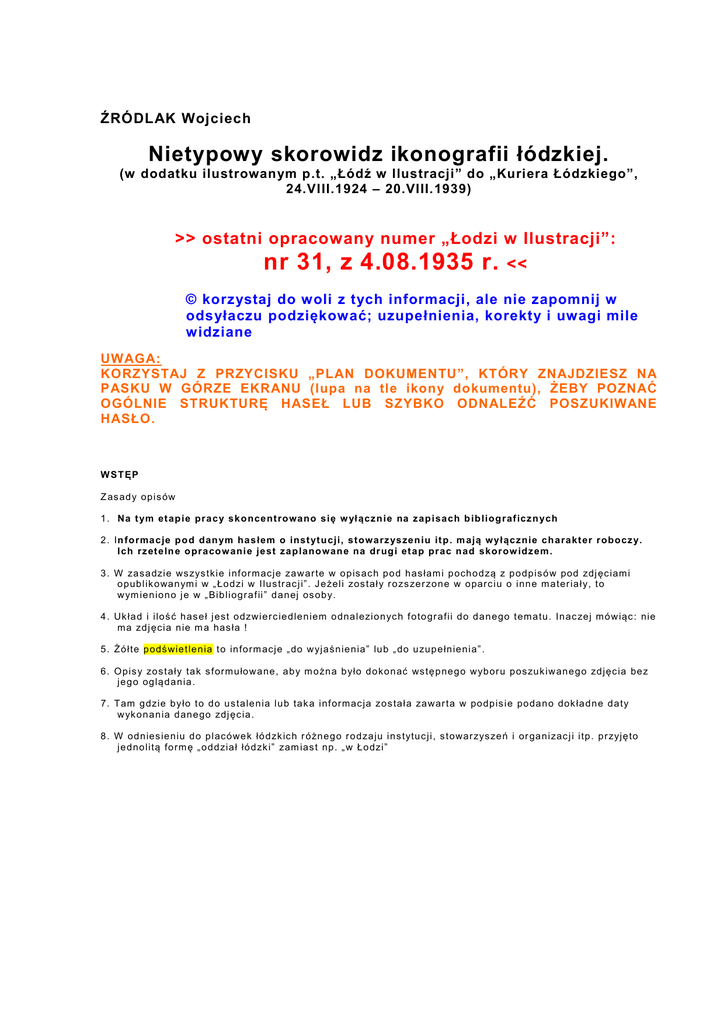 ŹRÓDLAK Wojciech Nietypowy skorowidz ikonografii łódzkiej. (w dodatku ilustrowanym p.t. „Łódź w Ilustracji” do „Kuriera Łódzkiego”, 24.VIII.1924 – 20.VIII.1939) >> ostatni opracowany numer „Łodzi w Ilustracji”: nr 31, z 4.08.1935 r. << © korzystaj do woli z tych informacji, ale nie zapomnij w odsyłaczu podziękować; uzupełnienia, korekty i uwagi mile widziane UWAGA: KORZYSTAJ Z PRZYCISKU „PLAN DOKUMENTU”, KTÓRY ZNAJDZIESZ NA PASKU W GÓRZE EKRANU (lupa na tle ikony dokumentu), ŻEBY POZNAĆ OGÓLNIE STRUKTURĘ HASEŁ LUB SZYBKO ODNALEŹĆ POSZUKIWANE HASŁO. WS T ĘP Z as ad y op is ów 1 . N a t ym et ap ie pr a c y s k o nce nt ro wa no s ię w ył ą cz n ie na z ap is a ch b ib liog r af icz n ych 2 . In fo rma c je p od dan ym ha s łem o inst yt u cji, s t owa rz ys ze n iu it p . m ają wył ąc znie c h a ra kt er r obocz y. Ic h rz et e ln e o pr a cow ani e je st za p lano wan e na dr ug i et a p pr ac n ad s kor ow idz em . 3 . W za sa dzie ws zys t kie inf or m acj e za w ar te w o p is ac h p o d h as łam i p och o d zą z p o d p is ó w pod zdj ęc iam i o p ub lik o wa n ym i w „ Ło d zi w I lu s tr ac j i” . J e żeli zos t ały r o zs ze r zo n e w o parc iu o inn e m a ter ia ły, t o w ym ie n io n o j e w „ Bib liog r a f ii” d a n ej os ob y. 4 . Uk ła d i ilo ś ć h as e ł j est o dzwie r c ie d le n iem o dna l ezio n yc h f o to gr a fii d o d a n e go t em a tu . In ac zej m ó w iąc : n ie m a zd j ęcia n ie m a has ła ! 5 . Żó łte p o dś wie t le n ia t o in fo rm acj e „ do w yj a śn ie n ia” lu b „ do u zu p e łn ie n ia” . 6 . Op is y zo s t ały ta k s f orm u ło w a ne , a b y m o żn a b yło d o ko n ać ws tę p ne g o wyb or u p oszu k iw an e g o zd j ęc ia be z j e g o og lą d a n ia . 7 . Tam g dzie b yło t o d o u s ta le n ia lu b ta k a inf orm ac ja zo s ta ła za war t a w po dp is ie po da n o dok ła d n e d a ty w yk o n a n ia d an e go zdj ęc ia . 8 . W od n ies ie n iu d o p lacó we k łó d zk ic h r óżn e g o r o d za ju in s tytu c j i, s t owar zys ze ń i or ga n izac j i itp . p r zyj ę to j e d no litą fo rm ę „ o d d zia ł łó d zk i” zam ias t np . „ w Ło dzi” LITERA „Ż” 1. ŻANDARMERIA WOJSKOWA 2. ŻŁOBKI p or ó w naj : D OM Y – s ier o t – ogólne – żłobki = Miejski Żłobek dla Niemowląt A d r es : u l. Tr am wa j owa 13 . = Żłobek Nr 3 przy Państwowej Wytwórni Wódek w Łodzi A d r es : u l. .. ... ... .. . ... 3. ŻYDZI w „Łodzi w Ilustracji” GM I NA Ż YD OWSK A w Ł O DZ I KO ŚC IO ŁY , CE RK WIE , SY N AGO GI – j ud a is t yc zne (s yna g o g i) M NI EJ SZ OŚ CI NAR OD OWE – Ż yd zi OR GANIZ ACJ E I ST O WAR Z YS Z EN I A – .. . .. ... ... ... . – S to w ar zys zen ia Gim n a zj um Ż eńsk ie g o im . E . Or zes zk o wej – OS OB Y – BARC IŃ S KI @ @@@ .. ( pr zem ys łow ie c) , B ERM AN @ @ @ . (r ad n y m . Ło d zi) , F IJ AŁ KO Izr a e l (r zem ieśłn ik) , F UC HS L a za r ( dzie nn ik ar z) , FU KS L e o n ard E le a zar ( ad wok a t) , GLAZ ER .. ... ... (r zem ieś ln ik) , GL OC ER Sr u l (r zem ieś ln ik) , HAN DE LSM AN B r o nis ła w ( lek ar z) , H ASZ K IE R . . .. ... ... ( r zem ieś ln ik) , K AB AN J óze f ( arc h .) , K AC EN BO GE N J aku b ( dr ., d yr . Izb y R zem ieś ln ic ze j w Ł o dzi) , K AN T OR @ @ . (skr zyp ek) , LI ND EN F EL DÓWN A P e la g ia (r ze źb ia r ka) , LU BE L SK I Mie c zys ła w (r ze źb iar z) , M IN C Lu d wik ( lek ar z) , M IN CB ERG J akub ( pre zes Gm in y) , ROS E NB L AT T J er zy, SZ AROG RO DE R L udw ik ( le kar z) , T RĘ BAC Z Ma u r yc y (m a lar z) – SZ K OŁ Y – g im n a zj a – pr ywa tn e – Gim n a zj um Ż eńskie i P r ywa t na S zk o łą P ow s ze c hn a im . E. Or zes zko w ej – ZW I ĄZ K I – k om ba t anck ie – Z wiąze k Ż yd ó w Uc ze s tn ik ó w W a lk o Nie po d leg łość Po ls k i p or ó w na j : – – – – „ K ur ier Łód zk i” , kt óre go doda tk iem ilus tr o w anym b yła „ Łó d ź w I lu s tr acj i” b yła g a ze t a p olsk ą , n ie a n tys em ick a , a le t em a tyk a żyd o wsk a pr ak tyc zn ie nie b yła o b ec n a na j ej łam ach . 1929 – nr 48, z 24 XI, s. 7: pogrzeb na cmentarzu żydowskim w Łodzi Marcelego Barcińskiego, który zginął w wypadku samochodowym w Warszawie 1935 – nr 1, z 6 I, s. 7: nowo wybrany (w X 1935 r.) Zarząd Izby Rzemieślniczej w Łodzi; w jego składzie m.in. dwaj członkowie pochodzenia żydowskiego – Izrael Fijałko i dr Jakub Kacenbogen c.d. w przygotowaniu