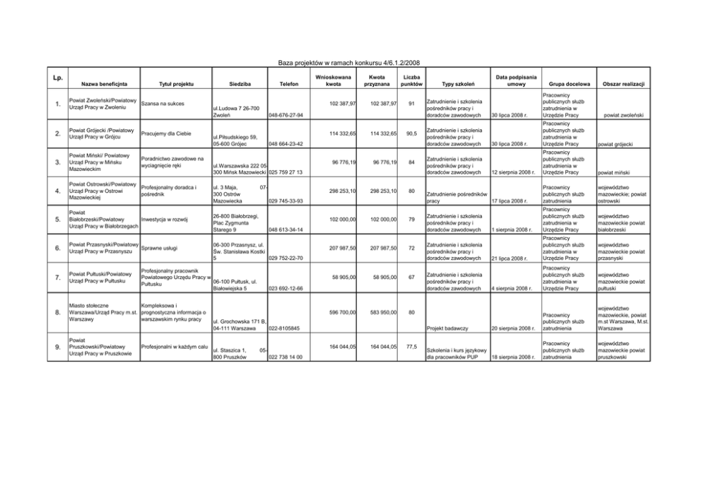 Baza projektów w ramach konkursu 4/6.1.2/2008 Lp. Nazwa beneficjnta 1. 2. Tytuł projektu Powiat Zwoleński/Powiatowy Szansa na sukces Urząd Pracy w Zwoleniu Powiat Grójecki /Powiatowy Urząd Pracy w Grójcu Pracujemy dla Ciebie 3. Powiat Miński/ Powiatowy Urząd Pracy w Mińsku Mazowieckim 4. Powiat Ostrowski/Powiatowy Profesjonalny doradca i Urząd Pracy w Ostrowi pośrednik Mazowieckiej 5. Powiat Białobrzeski/Powiatowy Inwestycja w rozwój Urząd Pracy w Białobrzegach 6. 7. 8. 9. Poradnictwo zawodowe na wyciagnięcie ręki Powiat Przasnyski/Powiatowy Sprawne usługi Urząd Pracy w Przasnyszu Powiat Pułtuski/Powiatowy Urząd Pracy w Pułtusku Telefon ul.Ludowa 7 26-700 Zwoleń Profesjonalni w każdym calu Kwota przyznana 102 387,97 Liczba punktów 91 048-676-27-94 114 332,65 ul.Piłsudskiego 59, 05-600 Grójec 114 332,65 90,5 048 664-23-42 ul.Warszawska 222 05300 Mińsk Mazowiecki 025 759 27 13 ul. 3 Maja, 300 Ostrów Mazowiecka Wnioskowana kwota 102 387,97 07- 96 776,19 96 776,19 84 298 253,10 298 253,10 80 102 000,00 102 000,00 79 029 745-33-93 26-800 Białobrzegi, Plac Zygmunta Starego 9 048 613-34-14 06-300 Przasnysz, ul. Św. Stanisława Kostki 5 029 752-22-70 Profesjonalny pracownik Powiatowego Urzędu Pracy w 06-100 Pułtusk, ul. Pułtusku Białowiejska 5 Miasto stołeczne Kompleksowa i Warszawa/Urząd Pracy m.st. prognostyczna informacja o Warszawy warszawskim rynku pracy Powiat Pruszkowski/Powiatowy Urząd Pracy w Pruszkowie Siedziba 207 987,50 58 905,00 207 987,50 58 905,00 72 67 023 692-12-66 596 700,00 583 950,00 022 738 14 00 164 044,05 77,5 Grupa docelowa Obszar realizacji 30 lipca 2008 r. Pracownicy publicznych służb zatrudnienia w Urzędzie Pracy 30 lipca 2008 r. Pracownicy publicznych służb zatrudnienia w Urzędzie Pracy powiat grójecki 12 sierpnia 2008 r. Pracownicy publicznych służb zatrudnienia w Urzędzie Pracy powiat miński Zatrudnienie pośredników pracy 17 lipca 2008 r. Pracownicy publicznych służb zatrudnienia województwo mazowieckie; powiat ostrowski Zatrudnienie i szkolenia pośredników pracy i doradców zawodowych 1 sierpnia 2008 r. Pracownicy publicznych służb zatrudnienia w Urzędzie Pracy województwo mazowieckie powiat białobrzeski 21 lipca 2008 r. Pracownicy publicznych służb zatrudnienia w Urzędzie Pracy województwo mazowieckie powiat przasnyski 4 sierpnia 2008 r. Pracownicy publicznych służb zatrudnienia w Urzędzie Pracy województwo mazowieckie powiat pułtuski 20 sierpnia 2008 r. Pracownicy publicznych służb zatrudnienia województwo mazowieckie, powiat m.st Warszawa, M.st. Warszawa Szkolenia i kurs językowy dla pracowników PUP 18 sierpnia 2008 r. Pracownicy publicznych służb zatrudnienia województwo mazowieckie powiat pruszkowski Zatrudnienie i szkolenia pośredników pracy i doradców zawodowych Zatrudnienie i szkolenia pośredników pracy i doradców zawodowych Zatrudnienie i szkolenia pośredników pracy i doradców zawodowych Zatrudnienie i szkolenia pośredników pracy i doradców zawodowych Zatrudnienie i szkolenia pośredników pracy i doradców zawodowych Projekt badawczy 164 044,05 05- Data podpisania umowy 80 ul. Grochowska 171 B, 04-111 Warszawa 022-8105845 ul. Staszica 1, 800 Pruszków Typy szkoleń powiat zwoleński