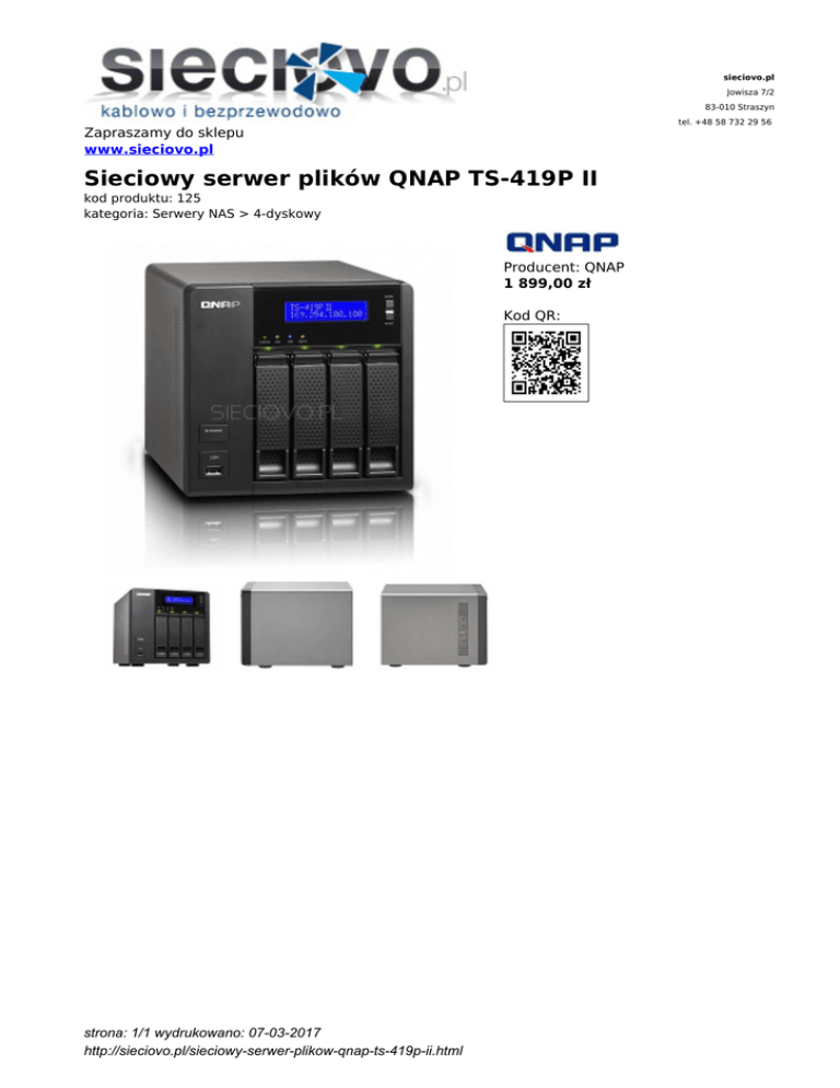 sieciovo.pl Jowisza 7/2 83-010 Straszyn tel. +48 58 732 29 56 Zapraszamy do sklepu www.sieciovo.pl Sieciowy serwer plików QNAP TS-419P II kod produktu: 125 kategoria: Serwery NAS > 4-dyskowy Producent: QNAP 1 899,00 zł Kod QR: strona: 1/1 wydrukowano: 07-03-2017 http://sieciovo.pl/sieciowy-serwer-plikow-qnap-ts-419p-ii.html