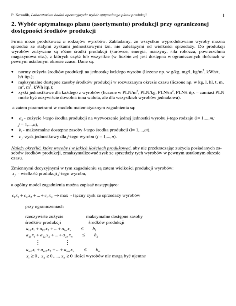 2. Wybór optymalnego planu (asortymentu) produkcji przy