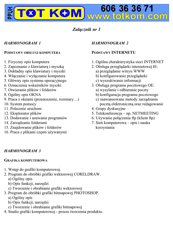 Załącznik nr 1 HARMONOGRAM 1 HARMONOGRAM 2 PODSTAWY OBSŁUGI KOMPUTERA PODSTAWY INTERNETU 1. Fizyczny opis komputera 2. Zapoznanie z klawiaturą i myszką 3. Dokładny opis klawiatury i myszki 4. Włączanie i wyłączanie komputera 5. Główny opis systemu operacyjnego 6. Oznaczenia wskaźników myszki 7. Otwieranie plików i folderów 8. Ogólny opis OKNA 9. Praca z oknami (przenoszenie, rozmiary…) 10. System pomocy 11. Polecenie uruchom 12. Eksplorator plików 13. Dodawanie i usuwanie programów 14. Zarządzanie folderami 15. Znajdowanie plików i folderów 16. Praca z plikami często używanymi 1. Ogólna charakterystyka sieci INTERNET 2. Obsługa przeglądarki internetowej IE: a) przeglądanie witryn WWW b) konfigurowanie przeglądarki c) wyszukiwanie informacji 3. Obsługa programu pocztowego OE: a) wysyłanie i odbieranie poczty b) konfiguracja programu pocztowego c) zaawansowane metody zarządzania pocztą elektroniczną oraz redagowanie 4. Grupy dyskusyjne 5. Telekonferencja – np. NETMEETING 6. Używanie połączenia ftp (klient ftp) 7. Sień komputerowa – opis i nauka korzystania HARMONOGRAM 3 GRAFIKA KOMPUTEROWA 1. Wstęp do grafiki komputerowej. 2. Program do obróbki grafiki wektorowej CORELDRAW. a) Ogólny opis b) Opis funkcji, narzędzi c) Tworzenie i obrabianie grafiki wektorowej 3. Program do obróbki grafiki bitmapowej PHOTOSHOP. a) Ogólny opis b) Opis funkcji, narzędzi c) Tworzenie i obrabianie grafiki bitmapowej 4. Studio grafiki komputerowej - proces tworzenia produktu. Załącznik nr 2 HARMONOGRAM 1 HARMONOGRAM 2 EDYTOR TEKSTU WORD EDYTOR TEKSTU WORD Stopień podstawowy Stopień średni 1. 2. 3. 4. 5. 6. 7. 8. 9. 10. 11. 12. 13. 14. 15. 16. 17. 18. 19. 20. 21. 1. 2. Poznawanie klawiatury i sprawne pisanie Uruchamianie WORDA Korzystanie z pomocy Co znajduje się na ekranie Worda Używanie myszy i wybieranie poleceń Używanie pól dialogów Różne sposoby wyświetlania dokumentu Tworzenie nowego dokumentu Ustalenie układu strony Pisanie i poprawianie Cofanie i ponawianie czynności Zaznaczanie części lub całego tekstu Formatowanie znaków, akapitów, tekstu Wyrównywanie tekstu Wycinanie, kopiowanie, i wklejanie tekstu Przejście do określonego miejsca w dokumencie Szukanie i zastępowanie Zachowanie dokumentu i otwieranie Podgląd i drukowanie dokumentu Zamykanie dokumentu i kończenie pracy Używanie klawiszy skrótów 3. 4. 5. 6. 7. 8. 9. 10. 11. 12. 13. 14. 15. Polecenie Zapisz jako... i polecenie Wersje... Ustawienia strony: Na oprawę, nagłówek i stopka, rozmiar papieru Widok: pełny ekran, nagłówek i stopka Wstaw: znak podziału, numer strony, data i godzina, symbol, przypis Wstaw rysunek: ClipArt, z pliku, Autokształty Wstaw: Pole tekstowe – robienie diagramów… Wstaw wzór: Microsoft Equation Format: wypunktowanie i numerowanie Kolumny Zmień wielkość liter Język: Określ język, Tezaurus, dzielenie wyrazów Statystyka wyrazów Tabele – rysuj tabelę, wstaw tabelę, scal i podziel komórki, zaznaczanie wierszy, kolumn, całej tabeli, usuwanie komórek, wysokość i szerokość komórki, ukryj i pokaż linie siatki Obramowanie i cieniowanie Pasek MENU - okno HARMONOGRAM 3 EDYTOR TEKSTU WORD Stopień wysoki Program zależy od słuchacza lub słuchaczy. Poruszane są zagadnie skomplikowane, z którymi kursant ma problem. Uczymy między innymi tworzenia profesjonalnych formularzy z wykorzystaniem formuł i okien dialogowych. Załącznik nr 3 HARMONOGRAM 1 HARMONOGRAM 2 ARKUSZ KALKULACYJNY EXCEL Stopień podstawowy ARKUSZ KALKULACYJNY EXCEL 1. 2. 3. 1. Polecenie Zapisz jako... 2. Ustawienia strony: a) strona b) marginesy c) nagłówek i stopka 3. Obszar wydruku – ustaw obszar wydruku 4. Podgląd wydruku 5. Wklej specjalnie .... 6. Pełny ekran 7. Polecenie wstaw: komórki, wiersze, kolumny, arkusz 8. Kreator wykresów 9. Wstaw: Funkcję 10. Liczenie, analizowanie, statystyka 11. Blokowanie okien, zarządzanie widokami 12. Wstaw rysunek: ClipArt, z pliku, Autokształty, WordArt 13. Format komórki – głęboki 14. Dane: a) sortuj b) filtruj c) formularz… Uzyskiwanie pomocy Tworzenie, otwieranie i zapisywanie plików Praca ze skoroszytami i arkuszami: - zmiana nazwy, wstawianie, usuwanie, wybieranie i przemieszczanie arkusza 4. Wprowadzanie danych i zaznaczanie komórek: - zmiana rozmiaru wierszy i kolumn - zaznaczanie komórek, wierszy, kolumn, arkusza - automatyczne wypełnianie danych na podstawie sąsiednich komórek - anulowanie lub cofanie wpisu - zaznaczanie i poruszanie się w skoroszycie 5. Edycja zawartości komórek: - czyszczenie z komórek zawartości, formuł - cofanie pomyłek - skalowanie komórek 6. Znajdowanie lub zamiana danych 7. Kopiowanie i przenoszenie komórek oraz danych 8. Sprawdzanie pisowni 9. Formatowanie skoroszytów – komórek 10. Drukowanie 11. Tworzenie formuł Stopień średni HARMONOGRAM 3 ARKUSZ KALKULACYJNY EXCEL Stopień wysoki Program zależy od słuchacza lub słuchaczy. Poruszane są zagadnie skomplikowane, z którymi kursant ma problem. Uczymy między innymi tworzenia profesjonalnych formularzy z wykorzystaniem formuł i okien dialogowych. Załącznik nr 4 HARMONOGRAM PAKIET PEŁNE WYKORZYSTANIE KOMPUTERA I. PODSTAWY OBSŁUGI KOMPUTERA 1. Fizyczny opis komputera 2. Zapoznanie z klawiaturą i myszką 4. Włączanie i wyłączanie komputera 5. Główny opis systemu operacyjnego 6. Oznaczenia wskaźników myszki 8. Ogólny opis OKNA, praca z nimi 10. System pomocy, polecenie uruchom 12. Eksplorator plików 13. Dodawanie i usuwanie programów 14. Zarządzanie plikami i folderami 15. Znajdowanie plików i folderów 6. Tworzenie nowego dokumentu 7. Ustalenie układu strony 8. Pisanie, poprawianie, zaznaczanie tekstów 9. Formatowanie znaków, akapitów, tekstu 10. Wycinanie, kopiowanie, i wklejanie tekstu. 11. Szukanie i zastępowanie 12. Zachowanie dokumentu i otwieranie 13. Podgląd i drukowanie dokumentu 14. Wstawianie grafiki 15. Tworzenie tabel, zestawień 16. Kreator wykresów 17. Używa
