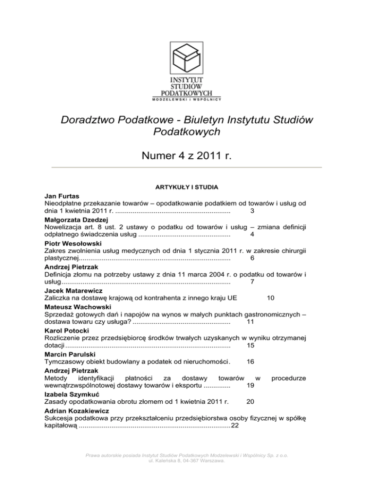 Doradztwo Podatkowe - Biuletyn Instytutu Studiów Podatkowych Numer 4 z 2011 r. ARTYKUŁY I STUDIA Jan Furtas Nieodpłatne przekazanie towarów – opodatkowanie podatkiem od towarów i usług od dnia 1 kwietnia 2011 r. ............................................................ 3 Małgorzata Dzedzej Nowelizacja art. 8 ust. 2 ustawy o podatku od towarów i usług – zmiana definicji odpłatnego świadczenia usług ................................................ 4 Piotr Wesołowski Zakres zwolnienia usług medycznych od dnia 1 stycznia 2011 r. w zakresie chirurgii plastycznej............................................................................... 6 Andrzej Pietrzak Definicja złomu na potrzeby ustawy z dnia 11 marca 2004 r. o podatku od towarów i usług........................................................................................ 7 Jacek Matarewicz Zaliczka na dostawę krajową od kontrahenta z innego kraju UE 10 Mateusz Wachowski Sprzedaż gotowych dań i napojów na wynos w małych punktach gastronomicznych – dostawa towaru czy usługa? ................................................... 11 Karol Potocki Rozliczenie przez przedsiębiorcę środków trwałych uzyskanych w wyniku otrzymanej dotacji ...................................................................................... 15 Marcin Parulski Tymczasowy obiekt budowlany a podatek od nieruchomości. 16 Andrzej Pietrzak Metody identyfikacji płatności za dostawy towarów w procedurze wewnątrzwspólnotowej dostawy towarów i eksportu .............. 19 Izabela Szymkuć Zasady opodatkowania obrotu złomem od 1 kwietnia 2011 r. 20 Adrian Kozakiewicz Sukcesja podatkowa przy przekształceniu przedsiębiorstwa osoby fizycznej w spółkę kapitałową ...............................................................................22 Prawa autorskie posiada Instytut Studiów Podatkowych Modzelewski i Wspólnicy Sp. z o.o. ul. Kaleńska 8, 04-367 Warszawa. ANALIZY I OPINIE Anna Kiersnowska-Drzewiecka Zryczałtowany podatek od należności licencyjnych za oprogramowanie komputerowe ................................................................................................ 24 Radosław Pazik Czy sprzedaż działek budowlanych lub przeznaczonych pod zabudowę przez rolnika ryczałtowego rodzi obowiązek podatkowy w podatku od towarów i usług? ................................................................................................27 Jacek Matarewicz Nieprawidłowe przedstawienie zarzutów przez urząd skarbowy naruszeniem przepisów postępowania mającym istotny wpływ na wynik sprawy 31 PODATKI DLA KSIĘGOWYCH Jacek Budziszewski Podatki w praktyce .................................................................. 35 Beata Pytkowska Różnice i podobieństwa pomiędzy Międzynarodowymi Standardami Rachunkowości (MSR 38) a ustawą z dnia 29 września 1994 r. o rachunkowości w zakresie wartości niematerialnych i prawnych ..................................................... 39 Renata Łabędź Rozliczenia między centralą a oddziałem zagranicznym – wybrane aspekty bilansowe i podatkowe (część I)............................................................... 45 JUDYKATURA I INTERPRETACJE Orzecznictwo podatkowe TSUE – marzec 2011 r................... 49 Karol Szelągowski Wniesienie aportu w postaci udziałów bądź akcji w spółce kapitałowej do spółki osobowej w świetle podatku dochodowego od osób fizycznych – uchwała NSA z dnia 14 marca 2011 r. ..................................................................... 53 LEGISLACJA PODATKOWA Ustawa z dnia 11 marca 2004 r. o podatku od towarów i usług 59 Ustawa z dnia 21 kwietnia 2005 r. o zmianie ustawy o podatku od towarów i usług oraz o zmianie niektórych innych ustaw (wyciąg) ................... 137 Ustawa z dnia 19 września 2007 r. o zmianie ustawy o podatku od towarów i usług oraz ustawy o zwrocie osobom fizycznym niektórych wydatków związanych z budownictwem mieszkaniowym (wyciąg) ............................... 138 Ustawa z dnia 11 kwietnia 2008 r. o zmianie ustawy o podatku od towarów i usług (wyciąg) ................................................................................... 139 Ustawa z dnia 7 listopada 2008 r. o zmianie ustawy o podatku od towarów i usług oraz niektórych innych ustaw .................................................. 141 Ustawa z dnia 23 października 2009 r. o zmianie ustawy o podatku od towarów i usług (wyciąg) ......................................................................... 142 Ustawa z dnia 2 grudnia 2009 r. o zmianie ustawy o podatku od towarów i usług (wyciąg) .................................................................................. 143 Ustawa z dnia 29 października 2010 r. o zmianie ustawy o podatku od towarów i usług (wyciąg) ........................................................................ 144 Prawa autorskie posiada Instytut Studiów Podatkowych Modzelewski i Wspólnicy Sp. z o.o. ul. Kaleńska 8, 04-367 Warszawa. Ustawa z dnia 16 grudnia 2010 r. o zmianie ustawy o podatku od towarów i usług oraz ustawy o transporcie drogowym (wyciąg) ....................... 144 Ustawa z dnia 18 marca 2011 r. o zmianie ustawy o podatku od towarów i usług oraz ustawy – Prawo o miarach (wyciąg) ....................................... 146 Rozporządzenie Ministra Finansów z dnia 4 kwietnia 2011 r. w sprawie wykonania niektórych przepisów ustawy o podatku od towarów i usług ... 147 Rozporządzenie Ministra Finansów z dnia 28 marca 2011 r. w sprawie zwrotu podatku niektórym podatnikom, wystawiania faktur, sposobu ich przechowywania oraz listy towarów i usług, do których nie mają zastosowania zwolnienia od podatku od towarów i usług................................................................... 160 Rozporządzenie Ministra Finansów z dnia 28 marca 2011 r. w sprawie przedstawiciela podatkowego ..............................................