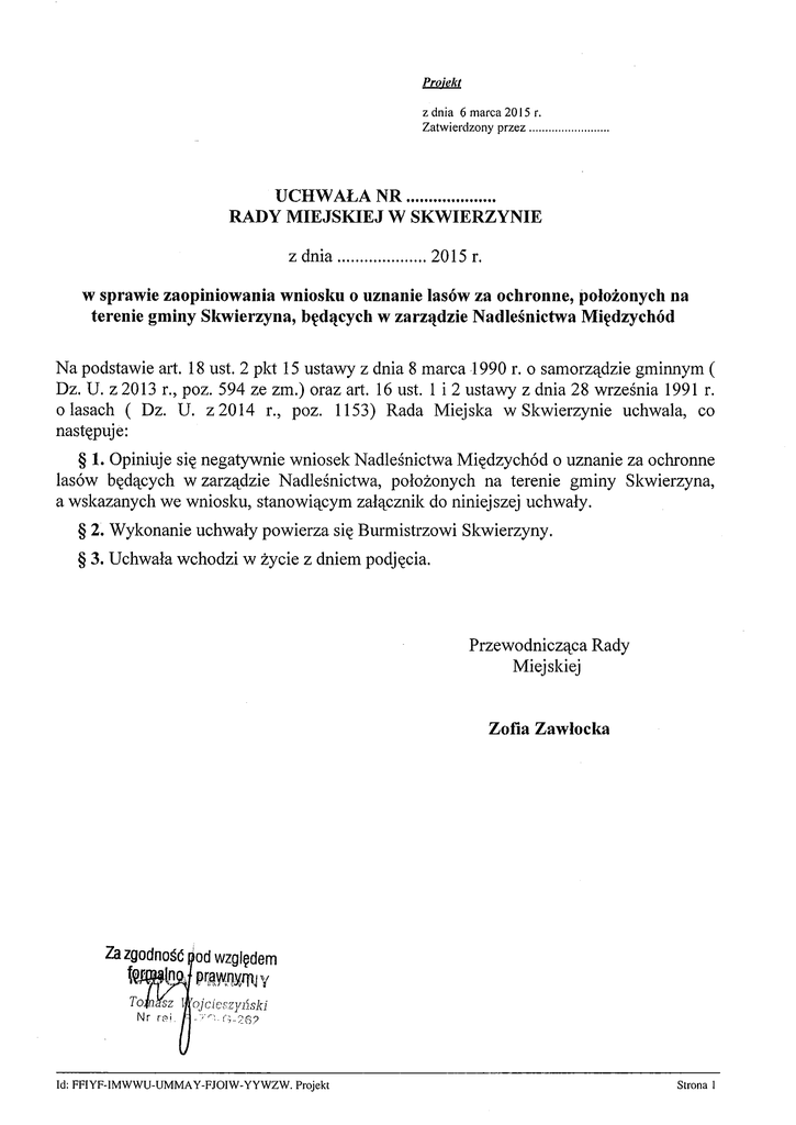 z dnia 6 marca 2015 r. Zatwierdzony przez . UCHWAŁA NR . RADY MIEJSKIEJ WSKWIERZYNIE z dnia 2015 r. w sprawie zaopiniowania wniosku o uznanie lasów za ochronne, położonych na terenie gminy Skwierzyna, będących w zarządzie Nadleśnictwa Międzychód Na podstawie mi. 18 ust. 2 pkt 15 ustawy Z dnia 8 marca 1990 r. o samorządzie gminnym ( Dz. U. z 2013 r., poz. 594 ze zm.) oraz art. 16 ust. 1 i 2 ustawy z dnia 28 września 1991 r. o lasach ( Dz. U. z 2014 r., poz. 1153) Rada Miejska w Skwierzynie uchwala, co następuje: § 1. Opiniuje się negatywnie wniosek Nadleśnictwa Międzychód o uznanie za ochronne lasów będących w zarządzie Nadleśnictwa, położonych na terenie gminy Skwierzyna, a wskazanych we wniosku, stanowiącym załącznik do niniejszej uchwały. § 2. Wykonanie uchwały powierza się Burmistrzowi Skwierzyny. § 3. Uchwała wchodzi w życie z dniem podjęcia. Przewodnicząca Rady Miejskiej Zofia Id: FFIYF-IMWWU-UMMAY-FJOIW-YYWZW. Projekt Zawłocka Strona l Uzasadnienie Wnioskiem z dnia 15 stycznia 2015 r. (wpłynęło do tut. Urzędu 19.01.2015 r.), powołując się na art. 16 ustawy z dnia 28 września 1991 r. o lasach, Nadleśniczy Nadleśnictwa Międzychód zwrócił się do Rady Miejskiej w Skwierzynie z prośbą o wyrażenie opinii w formie uchwały dotyczącej wniosku o uznanie wytypowanych obszarów Nadleśnictwa Międzychód położonych w obrębie Gminy Skwierzyna za ochronne o łącznej powierzchni 8237/95 ha. Zgodnie z § 2 Rozporządzenia Ministra Ochrony Środowiska, Zasobów Naturalnych i Leśnictwa z dnia 25 sierpnia 1992 r. w sprawie szczegółowych zasad i trybu uznawania lasów za ochronne, wniosek powinien zawierać szczegółowe uzasadnienie celów uznania lasu za ochronny. Tymczasem wniosek Nadleśnictwa nie zawiera takiego uzasadnienia. Wymienione obszary, na których proponuje się uznanie lasów za ochronne ze względu na zachowanie biologicznej różnorodności, zlokalizowane na obszarach NATURA 2000 - są już objęte formą ochrony wynikającą z innej podstawy prawnej, która to ochrona zapewnia już w wystarczającym stopniu zachowanie biologicznej różnorodności chronionych obszarów. Uznanie lasów za ochronne spowoduje zmniejszenie stawki podatku leśnego o 50% / co wynika z art. 4 ust. 3 ustawy z dnia 30 października 2002r. o podatku leśnym tj. o kwotę 171131,06 zł. Stawka podatku leśnego za 1 ha lasów wynosi obecnie 41/547 zł czyli 8237/95 ha x 41/547 zł = 342 262/11 zł. Po uznaniu lasów za ochronne, mogą pojawić się inne skutki dla mieszkańców tj. brak możliwości budowy i rozbudowy infrastruktury, zmniejszenia dochodów mieszkańców z powodu braku pracy, gdyż wystąpią ograniczenia pozyskania drewna lub płodów runa leśnego. W związku z tym podjęcie uchwały wyrażającej negatywną opinię jest zasadne. '.~ Zn.spr.: ZG.720A.2015 Rada Miejska wSkwierzynie ul. Rynek 1 66-440 Skwierzyna Na podstawie art.16 Ustawy o lasach z dnia 28 września 1991 r. (Dz.U.1991 nr 101 poz. 444 z późno zm.) oraz Rozporządzenia Ministra Ochrony Środowiska, Za- sobów Naturalnych i Leśnictwa z dnia 25 sierpnia 1992 r. w sprawie szczegółowych zasad i trybu uznawania lasów za ochronne oraz szczegółowych zasad prowadzenia w nich gospodarki leśnej (Dz. U.1992 nr 67 poz. 337), Nadleśnictwo Międzych6d prosi o zaopiniowanie projektu wniosku o uznanie lasów za ochronne wg załączonego wykazu. W"przypadku niejasności, Nadleśnictwo Międzych6d udzieli dodatkowych informacji. W załączeniu: 1. Wykaz lasów wnioskowanych o uznanie za ochronne na terenie Nadleśnictwa Międzychód w zasięgu gminy Skwierzyna. 2. Mapa obrębu leśnego Międzychód z lokalizacją lasów wnioskowanych o uznanie za ochronne. :::::')"'i'~ - . '~~ L, Załącznik nr 1 Wykaz lasów wnioskowanych o uznanie za ochronne na terenie gminy Skwierzyna - obszar wiejski Nadleśnictwo: Międzychód ~ Obręb leśny: Międzychód Określenie Uzasadnienie wniosku: a) cel uznania, powierzchni i opis lasu b} skutki społeczne, Wiodąca kategoria ochronności (inne kategorie) 1 lasy stanowiące cenne fragmenty rodzimej przyrody Obręb leśny. odziały, pododdziały 2 Obr. Miedzvchód: 13j, 14cJ, 15-17, 19-26, 32& 33h-j, 34b, 35-38, 40-56, 62d,f, 63b,c, 64dg, 65d,& 66b-h, 67-72, 74-90,111-153,179, 185-190, 191c-f,j-I,n,o, 192-215,241-244,247, 248, 253-277,302-304, 309,310, 314-337, 366ad, 367a,b, 368a-c,h, 370394, 395a-f, 396a-d,g-i, 397,398,433455, 456a,f-i, 457c-h, 458, 459, 486s, 487i,j, 488504, 505a-f, 506, 507ad.g-i, 509d-j, 510, 511a, 5121,543 Powierzchnia wha 3 7238,49 c) skutki przyrodnicze, d) skutki ekonomiczne. Opis lasu 4 s lasy położone w granicach obszarów Natura 2000: obszaru specjalnej ochrony ptaków Puszcza Notecka PlB300015 oraz specjalnego obszaru ochrony siedlisk Bory Chrobotkowe Puszczy Noteckiej PlH080032. a) zachowanie trwałości lasów, zapewnienie specjalnej ochrony obszarów Natura 2000, b) udostępnienie lasów o urozmaiconym charakterze, c} zachowanie biologicznej różno rodności, d) zwiększenie nakładów na prowadzenie gospodarki wartości ""; 1 leśnej, wzrost pozaprodukcyjnych lasu. Wnioskowane szczególne sposoby prowadzenia gospodarki leśnej: a) ograniczenie pozyskania, b) nakazy ograniczenia określo nych zabiegów, c) konieczność założenia i utrzymania urządzeń ochronnych, d) ograniczenie udostępniania lasu. 6 Prowadzenie gospodarki leśnej w sposób zapewniający utrzymanie lub odtworzenie właściwego stanu ochrony siedlisk i gatunków będą cych przedmiotem ochrony obszarów Natura 2000. Prowadzenie działań ochronnych zgodnie z zatwierdzonymi planami zadań ochronnych dla obszarów Natura 2000. ~ Lasy stanowiące cenne fragmenty rodzimej przyrody (lasy stanowiące ostoje zwierząt Obr. Miedzychód: 395g-i, 396f, 456b-d,j, 457a,b aj zachowanie trwałości lasów, za- Prowadzenie gospodarki leśnej w pewnienie specjalnej ochrony sposób zapewniający utrzymanie obszaru Natura 2000 i ostoi bie- lub odtworzenie