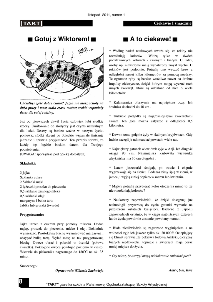 listopad 2011, numer 1 Ciekawie I smacznie Gotuj z Wiktorem! A to ciekawe! * Według badań naukowych uważa się, że rekiny nie rozróżniają kolorów! Widzą tylko w dwóch podstawowych kolorach - czarnym i białym. U ludzi, osoby np. niewidome mają wyostrzony zmysł węchu. U rekinów jest podobnie. Potrafią one wyczuć krew z odległości nawet kilku kilometrów za pomocą nozdrzy. Te ogromne ryby są bardzo wrażliwe nawet na drobne impulsy elektryczne, dzięki którym mogą wyczuć ruch innych zwierząt, które są oddalone od nich o wiele kilometrów. Chciałbyś zjeść dobre ciasto? Jeżeli nie masz ochoty na dużo pracy i masz mało czasu możesz zrobić wspaniały deser dla całej rodziny. Już od pierwszych chwil życia człowiek lubi słodkie rzeczy. Umiłowanie do słodyczy jest czymś naturalnym dla ludzi. Desery są bardzo ważne w naszym życiu, ponieważ słodki akcent po obiedzie wspaniale finiszuje jedzenie i sprawia przyjemność. Ten przepis sprawi, że każdy kęs będzie boskim darem dla Twojego podniebienia. (UWAGA! sporządzać pod opieką dorosłych) * Kałamarnica olbrzymia ma największe oczy. Ich średnica dochodzi do 40 cm . * Turkucie podjadki są najgłośniejszymi zwierzętami świata. Ich głos można usłyszeć z odległości 0,5 kilometra. * Dawno temu gołębie żyły w skalnych kryjówkach. Gdy ludzie zaczęli je udomawiać powstało wiele ras. * Największy gatunek wiewiórek żyje w Azji. Ich długość osiąga 90 cm. Najmniejsza karłowata wiewiórka afrykańska ma 10 cm długości . Składniki: 3 jajka Szklanka cukru 2 Szklanki mąki 2 łyżeczki proszku do pieczenia 0,5 szklanki zimnego mleka 0,5 szklanki oleju margaryna i bułka tarta Jabłka lub gruszki (twarde) Przygotowanie: Jajka utrzeć z cukrem przy pomocy miksera. Dodać mąkę, proszek do pieczenia, mleko i olej. Dokładnie wymieszać. Prostokątną blachę wysmarować margaryną i obsypać bułką tartą. Wylać masę na tak przygotowaną blachę. Owoce obrać i pokroić w ósemki (połowa ćwiartki). Pokrojone owoce powbijać poziomo w ciasto. Wstawić do piekarnika nagrzanego do 180˚C na ok. 35 minut. * Latem jaszczurki śmigają po trawie i chętnie wygrzewają się na słońcu. Podczas zimy śpią w ziemi, w jamce, i wyjdą z niej dopiero w marcu lub kwietniu. * Mątwy potrafią przybierać kolor otoczenia mimo to, że nie rozróżniają kolorów? * Naukowcy zapowiedzieli, że dzięki dostępnej już technologii przywrócą do życia gatunki wymarłe na przestrzeni ostatnich tysiącleci. Badacze z Japonii zapowiedzieli ostatnio, że w ciągu najbliższych czterech lat do życia powtórnie zostanie powołany mamut! * Białe niedźwiedzie są zagrożone wyginięciem a na wolności żyje ich jeszcze tylko ok. 20 000?! Ocieplający się klimat sprawia, że pokrywa lodowa Arktyki, ojczyzny białych niedźwiedzi, topnieje i zwierzęta mają coraz mniej miejsca do życia. * Czy wiesz, że ostrygi mogą wielokrotnie zmieniać płeć? Smacznego! Opracowała Wiktoria Zachwieja 8 “TAKT” gazetka szkolna Państwowej Ogólnokształcącej Szkoły Artystycznej AktiV, Ola, Ktoś