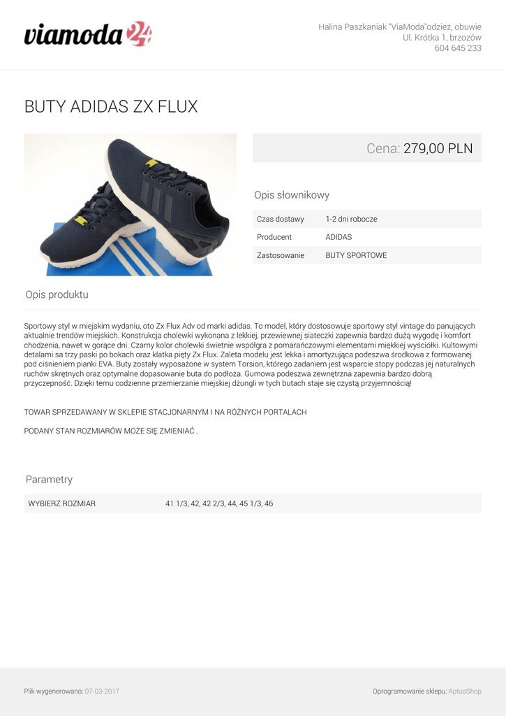 Halina Paszkaniak "ViaModa"odzież, obuwie Ul. Krótka 1, brzozów 604 645 233 BUTY ADIDAS ZX FLUX Cena: 279,00 PLN Opis słownikowy Czas dostawy 1-2 dni robocze Producent ADIDAS Zastosowanie BUTY SPORTOWE Opis produktu Sportowy styl w miejskim wydaniu, oto Zx Flux Adv od marki adidas. To model, który dostosowuje sportowy styl vintage do panujących aktualnie trendów miejskich. Konstrukcja cholewki wykonana z lekkiej, przewiewnej siateczki zapewnia bardzo dużą wygodę i komfort chodzenia, nawet w gorące dni. Czarny kolor cholewki świetnie współgra z pomarańczowymi elementami miękkiej wyściółki. Kultowymi detalami sa trzy paski po bokach oraz klatka pięty Zx Flux. Zaleta modelu jest lekka i amortyzująca podeszwa środkowa z formowanej pod ciśnieniem pianki EVA. Buty zostały wyposażone w system Torsion, którego zadaniem jest wsparcie stopy podczas jej naturalnych ruchów skrętnych oraz optymalne dopasowanie buta do podłoża. Gumowa podeszwa zewnętrzna zapewnia bardzo dobrą przyczepność. Dzięki temu codzienne przemierzanie miejskiej dżungli w tych butach staje się czystą przyjemnością! TOWAR SPRZEDAWANY W SKLEPIE STACJONARNYM I NA RÓŻNYCH PORTALACH PODANY STAN ROZMIARÓW MOŻE SIĘ ZMIENIAĆ . Parametry WYBIERZ ROZMIAR Plik wygenerowano: 07-03-2017 41 1/3, 42, 42 2/3, 44, 45 1/3, 46 Oprogramowanie sklepu: AptusShop Halina Paszkaniak "ViaModa"odzież, obuwie Ul. Krótka 1, brzozów 604 645 233 Galeria Plik wygenerowano: 07-03-2017 Powered by TCPDF (www.tcpdf.org) Oprogramowanie sklepu: AptusShop