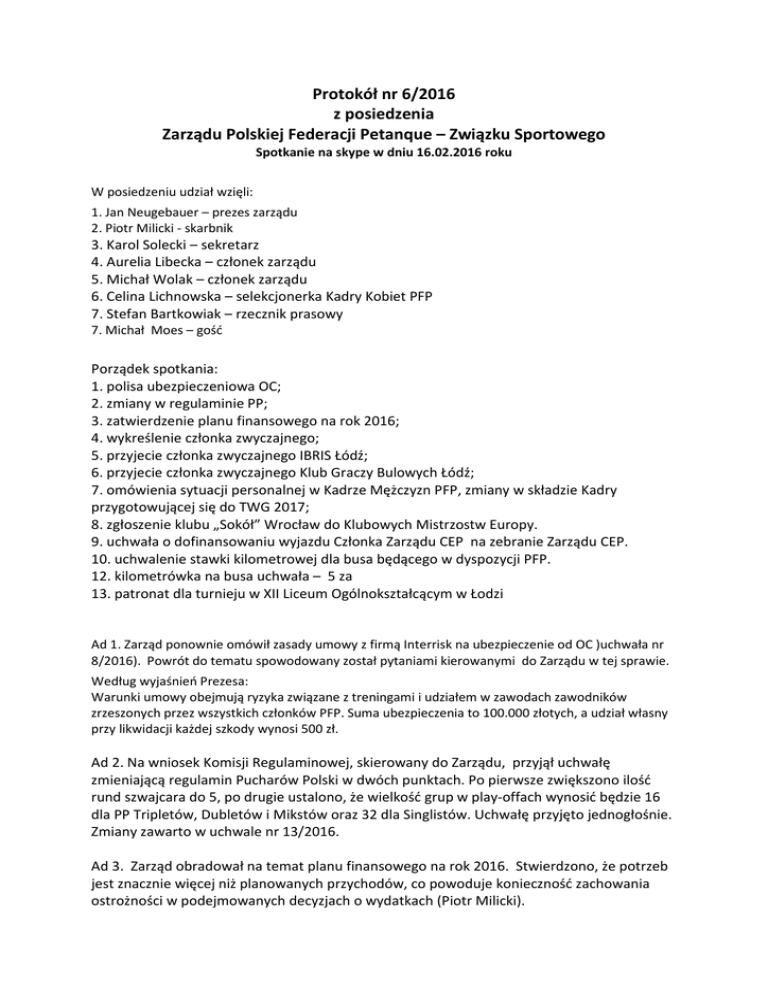 Protokół nr 6/2016 z posiedzenia Zarządu Polskiej Federacji Petanque – Związku Sportowego Spotkanie na skype w dniu 16.02.2016 roku W posiedzeniu udział wzięli: 1. Jan Neugebauer – prezes zarządu 2. Piotr Milicki - skarbnik 3. Karol Solecki – sekretarz 4. Aurelia Libecka – członek zarządu 5. Michał Wolak – członek zarządu 6. Celina Lichnowska – selekcjonerka Kadry Kobiet PFP 7. Stefan Bartkowiak – rzecznik prasowy 7. Michał Moes – gość Porządek spotkania: 1. polisa ubezpieczeniowa OC; 2. zmiany w regulaminie PP; 3. zatwierdzenie planu finansowego na rok 2016; 4. wykreślenie członka zwyczajnego; 5. przyjecie członka zwyczajnego IBRIS Łódź; 6. przyjecie członka zwyczajnego Klub Graczy Bulowych Łódź; 7. omówienia sytuacji personalnej w Kadrze Mężczyzn PFP, zmiany w składzie Kadry przygotowującej się do TWG 2017; 8. zgłoszenie klubu „Sokół” Wrocław do Klubowych Mistrzostw Europy. 9. uchwała o dofinansowaniu wyjazdu Członka Zarządu CEP na zebranie Zarządu CEP. 10. uchwalenie stawki kilometrowej dla busa będącego w dyspozycji PFP. 12. kilometrówka na busa uchwała – 5 za 13. patronat dla turnieju w XII Liceum Ogólnokształcącym w Łodzi Ad 1. Zarząd ponownie omówił zasady umowy z firmą Interrisk na ubezpieczenie od OC )uchwała nr 8/2016). Powrót do tematu spowodowany został pytaniami kierowanymi do Zarządu w tej sprawie. Według wyjaśnień Prezesa: Warunki umowy obejmują ryzyka związane z treningami i udziałem w zawodach zawodników zrzeszonych przez wszystkich członków PFP. Suma ubezpieczenia to 100.000 złotych, a udział własny przy likwidacji każdej szkody wynosi 500 zł. Ad 2. Na wniosek Komisji Regulaminowej, skierowany do Zarządu, przyjął uchwałę zmieniającą regulamin Pucharów Polski w dwóch punktach. Po pierwsze zwiększono ilość rund szwajcara do 5, po drugie ustalono, że wielkość grup w play-offach wynosić będzie 16 dla PP Tripletów, Dubletów i Mikstów oraz 32 dla Singlistów. Uchwałę przyjęto jednogłośnie. Zmiany zawarto w uchwale nr 13/2016. Ad 3. Zarząd obradował na temat planu finansowego na rok 2016. Stwierdzono, że potrzeb jest znacznie więcej niż planowanych przychodów, co powoduje konieczność zachowania ostrożności w podejmowanych decyzjach o wydatkach (Piotr Milicki). Jan Neugebauer przedstawił plan wydatków, który starano się dopasować do realiów. Poza schematycznymi zapisami uznano, że należy przygotować środki na wsparcie organizacji letniego obozu dla dzieci (2000 zł). Znacząco zwiększono środki na pracę pionu sędziowskiego, przewidziano też zakupy sprzętu do obsługi turniejów (kółka, tabliczki, zegar). Zarząd nie zaakceptował pomysłu prezesa na zakup kul silikonowych z przeznaczeniem do sprzedaży. Plan finansowy przyjęto jako uchwałę nr 14/2016 przy założeniu, że wydatki w roku 2016 wyniosą 35.900 zł, a przychody 35.350 zł. Ad 4. Zarząd jednogłośnie przyjął uchwałę o wykreśleniu z listy członków PFP warszawskiego klubu „Trois Boules”, na prośbę działaczy rozwiązanego klubu przesłana przez Cezarego Zaniewskiego (uchwała nr 15/2016). Ad 5. Zarząd jednogłośnie zaakceptował przyjęcie członka zwyczajnego, noszącego nazwę IRBIS Ł Ó DŹ PETANQUE zgłoszonego w piśmie z dnia 18 stycznia 2016 roku. Zainteresowani przedstawili dokument rejestracyjny oraz uchwałę o przystąpieniu do PFP. Zgłoszono też 11 wniosków licencyjnych. Akceptację przyjęcia Zarząd PFP wyraził w uchwale nr 16/2016. Ad 6. Zarząd jednogłośnie wyraził aprobatę dla przyjęcia członka zwyczajnego KLUBU GRACZY BULOWYCH z Łodzi. Zainteresowani podjęli decyzje o przystąpieniu do PFP oraz dokonali odpowiednich wpłat. Decyzję, podjętą jednogłośnie wyrażono w uchwale nr 17/2016. Ad 7. Na wniosek Prezesa dokonano zmiany personalnej w składzie Kadry Mężczyzn PFP, objętej programem przygotowań do TWG 2017. Ze względu na powtarzające się absencje w spotkaniach szkoleniowych ze składu wycofano Jędrzeja Śliża z ŻKB, a w jego miejsce powołano Kamila Ladaczka z „Sokoła” Wrocław. Zmiany dokonano po pobycie Prezesa w Myślenicach w czasie przeprowadzanych konsultacji Kadr Mężczyzn. Absencje jednego zawodnika zakłócają program szkoleniowy oraz uniemożliwiają właściwą ocenę możliwości zawodnika uczestniczącego w programie szkoleniowym. Dokonana zmiana nie wyklucza Jędrzej Śliża z Kadry PFP, jednak kieruje finansowanie do osoby, która bez zastrzeżeń będzie je wykorzystywać do własnego rozwoju. Podjęta decyzja pozwoli w znacznie większym stopniu uczestniczyć Kamilowi Ladaczkowi, Indywidualnemu Mistrzowi Polski 2015, w programie szkoleniowym PFP, realizowanym w największej mierze ze środków budżetowych. Pozostali kadrowicze uczestniczą w szkoleniu wykazując pełne zaangażowanie. Sprawa została omówiona w Myślenicach, podczas zgrupowania Kadry Mężczyzn PFP, w trakcie spotkania poświęconemu wręczeniu powołań na rok 2016. Decyzję zawarto w uchwale Zarządu nr 18/2016 czterema głosami za, przy 1 wstrzymującym się Aurelii Libeckiej. Ad 8. Zarząd upoważnił Prezesa do zgłoszenia klubu OKS „Sokół” z Wrocławia, jako Klubowego Mistrza Polski 2015, do rozgrywek o Klubowe Mistrzostwo Europy 2016. Rozgrywki organizuje Europejska Konfederacja Petanque. Wpisowe, wynoszące 250 € pokryje z własnych środków klub, który jest również zobowiązany do wpłaty kaucji na konto PFP (wniosek P. Milickiego), w wysokości 2000 zł. Konieczność wpłaty kaucji podyktowana jest faktem wprowadzenia przez CEP kar za absencje drużyn zgłoszonych i uczestniczących w rywalizacji. Kara za wycofanie sie z rywalizacji może wynosić od 500 € do 2000 €. W prowadzenie kar wprowadzono w związku z odstąpieniem od udziału w turnieju finałowym w roku 2015 Żywieckiego Klubu Boules. Decyzja o zgłoszeniu znalazła się w uchwale Zarządu nr 19/2016. Ad 9. Zarząd PFP podjął j