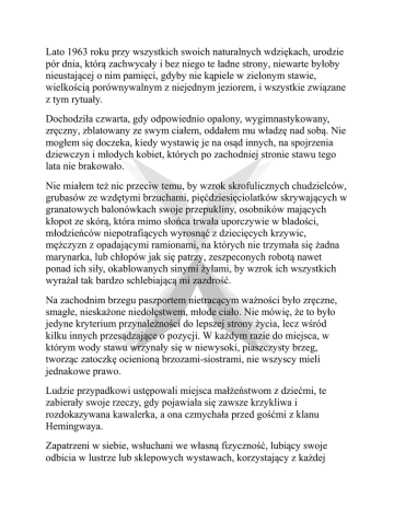 Lato 1963 roku przy wszystkich swoich naturalnych wdziękach, urodzie pór dnia, którą zachwycały i bez niego te ładne strony, niewarte byłoby nieustającej o nim pamięci, gdyby nie kąpiele w zielonym stawie, wielkością porównywalnym z niejednym jeziorem, i wszystkie związane z tym rytuały. Dochodziła czwarta, gdy odpowiednio opalony, wygimnastykowany, zręczny, zblatowany ze swym ciałem, oddałem mu władzę nad sobą. Nie mogłem się doczeka, kiedy wystawię je na osąd innych, na spojrzenia dziewczyn i młodych kobiet, których po zachodniej stronie stawu tego lata nie brakowało. Nie miałem też nic przeciw temu, by wzrok skrofulicznych chudzielców, grubasów ze wzdętymi brzuchami, pięćdziesięciolatków skrywających w granatowych balonówkach swoje przepukliny, osobników mających kłopot ze skórą, która mimo słońca trwała uporczywie w bladości, młodzieńców niepotrafiących wyrosnąć z dziecięcych krzywic, mężczyzn z opadającymi ramionami, na których nie trzymała się żadna marynarka, lub chłopów jak się patrzy, zeszpeconych robotą nawet ponad ich siły, okablowanych sinymi żyłami, by wzrok ich wszystkich wyrażał tak bardzo schlebiającą mi zazdrość. Na zachodnim brzegu paszportem nietracącym ważności było zręczne, smagłe, nieskażone niedołęstwem, młode ciało. Nie mówię, że to było jedyne kryterium przynależności do lepszej strony życia, lecz wśród kilku innych przesądzające o pozycji. W każdym razie do miejsca, w którym wody stawu wrzynały się w niewysoki, piaszczysty brzeg, tworząc zatoczkę ocienioną brzozami-siostrami, nie wszyscy mieli jednakowe prawo. Ludzie przypadkowi ustępowali miejsca małżeństwom z dziećmi, te zabierały swoje rzeczy, gdy pojawiała się zawsze krzykliwa i rozdokazywana kawalerka, a ona czmychała przed gośćmi z klanu Hemingwaya. Zapatrzeni w siebie, wsłuchani we własną fizyczność, lubiący swoje odbicia w lustrze lub sklepowych wystawach, korzystający z każdej chwili, by rzucić na siebie okiem, nie gustowali w bójkach, jak na przykład mężczyźni z placu i bazy, za to wzbudzali respekt swoją atletycznością i poglądem narzuconym innym, że jakby co, to sprawy są przesądzone na ich rzecz. Nie mieli poczucia humoru na swój temat i prawo do wybranych przez siebie miejsc, ulic, ławek, stolików w kawiarniach, prawo do sposobu przechadzania się po parku zdrojowym w C. i wyławiania z niego co atrakcyjniejszych kuracjuszek, krótko mówiąc, prawo do blasku w coraz bardziej szarzejącej rzeczywistości traktowali serio. Kiedy oparłem rower o jedną z brzóz nad zatoczką, rozgościli się tam już Hugon Trener i Tosiek Buchalter, a to znaczyło, że nikt inny nie mógł w zatoczce przebywa. Przywitaliśmy się niewylewnie, zapalili z Tośkiem po sporcie i zaraz Hugon wymógł na nas konkurs trójskoku z miejsca. Jak zawsze wygrał. Był niewysokim, krępym osiłkiem o niespotykanie mocnych nogach, wyciskał stuosiemdziesięciokilogramową sztangę z przysiadu pięć razy z rzędu. Gdyby żył w górach poważniejszych niż zachodnie Sudety, byłby jak Schramm, Toni Sailer, Jean-Claude Killy. Na nartach jeździł brawurowo i elegancko, często szusem, tam gdzie inni asekurowali się slalomami. Rzemieniem spinał but z nartą zjazdową nawet bez centymetrowej tolerancji. Trenerem był niecierpliwym. Irytowała go nieporadność, szydził z safandułów, nie akceptował tchórzostwa, a moim zdaniem nawet zdrowego rozsądku, jeżeli dotyczyło to nart. W rewanżu zaproponowałem mu wyścig do dwóch skalnych wysepek na środku stawu. Odmówił, bo w tej konkurencji nie wygrywał ze mną nikt, kogo znałem. To była jedna z przyczyn, dla których odwiedzałem to miejsce nawet wtedy, gdy kąpiel nie była przyjemnością. Wskoczyłem do wody z brzegu, wybijając się odpowiednio, by nie wyrżnąć głową w dno – powolne oswajanie się z wodą nie było w cenie – i przepłynąłem motylkiem sto dwadzieścia metrów do skałek, a wróciłem leniwym, nonszalanckim kraulem. Rad z uznania dla mych umiejętności – pochlebstw nie miałem nigdy dość – wyciągnąłem się na trawie. Wraz z sennością na łagodniejącym słońcu wrócił spokój, miara rzeczy, niczym niezakłócona przyjemność pierwszej młodości.