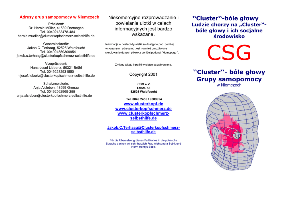 Adresy grup samopomocy w Niemczech Präsident: Dr. Harald Müller, 41539 Dormagen Tel. 00492133478-484 [email protected] Generalsekretär: Jakob C. Terhaag, 52525 Waldfeucht Tel. 004924559309954 [email protected] Vizepräsident: Hans-Josef Liebertz, 50321 Brühl Tel. 00492232931550 [email protected] Schatzmeisterin: Anja Alsleben, 48599 Gronau Tel. 00492562965-255 [email protected] Niekomercyjne rozprowadzanie i powielanie ulotki w celach informacyjnych jest bardzo wskazane . Informacje w postaci dyskietki sa dostępne pod poniżej wskazanymi adresami, jest rownież umożliwione skopiowanie danych plikow z poniżej podanej "Homepage ". Zmiany tekstu i grafiki w ulotce sa zabronione. Copyright 2001 CSG e.V. Talstr. 53 52525 Waldfeucht Tel. 0049 2455 / 9309954 www.clusterkopf.de www.clusterkopfschmerz.de www.clusterkopfschmerzselbsthilfe.de [email protected] Für die Übersetzung dieses Faltblattes in die polnische Sprache danken wir sehr herzlich Frau Aleksandra Sobik und Herrn Henryk Sobik ‘‘Cluster‘‘-bóle głowy Ludzie chorzy na „Cluster“bóle głowy i ich socjalne środowisko CSG ‘‘Cluster‘‘- bóle głowy Grupy samopomocy w Niemczech Wskazówki znajomych. dla przyjacioł i Drodzy państwo wasz znajomy / znajoma cierpi na bardzo żatką , bolesną i nieuleczalną chorobe zwaną „Clusterkopfschmerz“ lub BingHorton-Neuralgi . Rozchodzi się tutaj o zapalenie nerwu w okolicach mózgu. Osoby chore cierpią na bardzo silne bóle głowy , które nie można porównać z innym bólem . W czasie ataku należy osobom tym zapewnić spokój i ciszę. Inaczej nie można im pomoc. Po jakimś czasie ( pare minut do kilku godzin) ból powoli ustępuje . Jeżeli atak jest bardzo bolesny może choremu pomóc zastrzyk lub inhalacja tlenu , która łagodzi ból . Po ataku potrzebny jest jeszcze czas na odpoczynek. Dlatego proszę umożliwić osobom tym ten czas na regenerację . Może się zdarzyć że osoba chora , przez dłuższy czas jest rozdrażniona i przeczulona. W jednym z referatów na ten temat wypowiadają się osoby chore. - to nie jest łatwe życ z osbą chorą. Przeżycie własnego ciała i osobowości , zawodowe i prywatne życie wszystko to uzależnione jest od choroby.Te ograniczenia są bardzo znaczne. Jest się przygnębiony, spotyka się z niezrozumieniem nawet u przyjaciół. Tzw. przyjaciele odsuwają się („on ma i tak bóle głowy“) i nagle jest się osamotniony z pytaniem „ po co żyję na tym świecie ?„. Rzeczywistość ta nie powinna być jednak powodem do wycofania sie z aktywnego życia i przerwania kontaktów. Ważne jest właśnie w tym czasie brać udział w codziennym życiu , by udowodnić sobie i innym , że pomimo choroby można na nich liczyć . Zrozumienie takiego zachowania jest bardzo ważne . Jeśli parę razy dziennie ( do ośmiu razy ) cierpi się na niesamowity ból głowy , i to czasami przez parę tygodni to jest to zachowanie usprawiedliwione . Aby nasze socjalne i psychiczne problemy rozwiązac i nowych przyjaciól poznać zorganizowaliśmy grupy samopomocy . Grupy te są bardzo rozpowszechnione i uznane przez fachowców. Cieżko byłoby dla tych osób z powodu choroby stracić kontakt z rodziną i ze znajomymi .Okażcie proszę zrozumienie jeśli przyjdą spóźnieni na spotkanie, albo spotkanie odłożą. Pomyślcie proszę o tym że dla tych osób to też nie jest łatwe. Na podsumowanie tego tematu można wiec powiedzieć : - by z chronicznym bólem dobrze żyć nie możana mu się poddać i z wszystkiego zrezygnować. - tylko ciągła walka z bólem nie da nic, jeśli się zapomni o normalnym życiu. Pomóżcie proszę waszemu znajomemu / przyjacielowi, - nie zostawcie go samego, tylko z powodu choroby!!! Jak powinna wyglądać znajomych i przyjaciół. pomoc od Najważniejsze jest utrzymać znajomość i nie przerwać aktywnego kontaktu. Jeśli jesteście państwo razem z osobą chorą członkami jakiegoś klubu ,to zrozumcie jeśli osoba ta nie zawsze będzie brała udziału w spotkaniach. Jeśli z powodu ataku nocny sen zredukowany został do jednej albo dwóch godzin , a w ciagu dnia nastąpiło jeszcze kilka bolesnych ataków – to można sobie wyobrazić że osoba ta nie ma ochoty na spotkanie . Musimy zawsze o tym pamiętać, że faza ta minie i nastąpią znowu lepsze czasy. Każdy może zachorować na tą chorobę – okażcie wiec wyrozumienie.