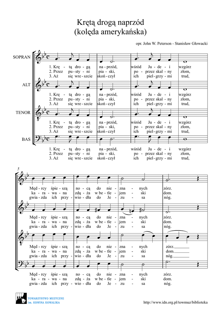 Krętą drogą naprzód (kolęda amerykańska) SOPRAN ° b &b c œ™ j œ œ œ b &b c œ™ j œ œ œ b &b c œ™ ‹ 1. Krę j œ œ œ 1. Krę - tą dro - gą 2. Przez pu - sty - ni 3. Aż się wre - szcie ALT 1. Krę - tą dro - gą 2. Przez pu - sty - ni 3. Aż się wre - szcie TENOR œ ˙™ na - przód, pia - ski, skoń - czył œ™ j œ œ œ œ™ j œ œ œ œ™ j œ œ œ œ™ œ œ œ J wśród Ju - de - i po - przez skal - ny ich piel - grzy - mi œ ˙™ na - przód, pia - ski, skoń - czył wśród Ju - de - i po - przez skal - ny ich piel - grzy - mi œ ˙™ w wzgórz złom, trud, w wzgórz złom, trud, w - tą dro - gą pu - sty - ni się wre - szcie na - przód, pia - ski, skoń - czył wśród Ju - de - i po - przez skal - ny ich piel - grzy - mi wzgórz złom, trud, 1. Krę - tą dro - gą 2. Przez pu - sty - ni 3. Aż się wre - szcie na - przód, pia - ski, skoń - czył wśród Ju - de - i po - przez skal - ny ich piel - grzy - mi wzgórz złom, trud, 2. Przez 3. Aż BAS opr. John W. Peterson - Stanisław Głowacki ? bc œ™ ¢ b œ œ œ J œ ˙™ ° b &b œ œ œ œ œ œ œ œ b &b œ œ œ œ œ œ #œ œ œ nœ #˙ bœ œ œ œ &b ‹ Męd - rcy śpie - szą œ œ œ œ ˙ ?b ¢ b œ œ œ œ œ œ œ œ 5 ˙ Męd - rcy śpie - szą no - cą do nie - zna ka - ra - wa - na zdą - ża w be - tle - jem gwia - zda ich przy - wio - dła do Je - zu ˙ - nych ski sa Męd - rcy śpie - szą no - cą do nie - zna ka - ra - wa - na zdą - ża w be - tle - jem gwia - zda ich przy - wio - dła do Je - zu - nych ski sa no - cą do nie - zna ka - ra - wa - na zdą - ża w be - tle - jem gwia - zda ich przy - wio - dła do Je - zu - nych ski sa Męd - rcy śpie - szą no - cą do nie - zna ka - ra - wa - na zdą - ża w be - tle - jem gwia - zda ich przy - wio - dła do Je - zu - nych ski sa ˙ œ œ ˙ ˙™ zórz. dom. nóg. ˙™ w Œ Œ zórz. dom. nóg. œ œ œ Œ zórz. dom. nóg. ˙™ Œ zórz. dom. nóg. http://www.idn.org.pl/towmuz/biblioteka ° b ™ &b ™ œ œ b & b ™™ œ œ 2 9 œ Na - przód, na - przód œ Na - przód, 12 wciąż œ J za œ - przód œ œ Na - przód, ° b œ &b J œ na - przód b ™ b & ™œ œ œ ‹ Na - przód, na ? b ™™ œ ¢ b œ œ J œ na - przód œ J wciąż ?b ˙ ¢ b wciąż w ślad, œ œ ˙ w ślad, ˙ w ślad, na - przód, ˙ ˙ świat, na - ˙ ˙ œ œ przez świat, ˙ ˙ ˙ przez świat, na œ J bez #œ ˙˙ po ˙ po ˙ po œ J œ J wy - tchnie - nia - - - przód, œ na - przód, œ J - - - œ na - przód, b#˙˙ przez œ œ n˙˙ ˙ œ̇ œ przez sze - ro - ki świat, gwia - zdą w ślad, b &b ˙ b &b œ ‹ wciąż j œ œ œ œj ˙ J J œ na - przód, ˙ - œ J przód, œ J śpie - szą œ J œ J po - śród ˙˙ śród ˙ śród ˙ śród http://www.idn.org.pl/towmuz/biblioteka ° b &b œ 14 krę - b &b œ krę - œ œ ˙ tych dróg, œ #˙ tych bœ œ &b ‹ krę - tych ? b œ #œ ¢ b krę - tych dróg, ˙ dróg, œ ˙ œ œ œ œ œ œ w bet - le - jem- skim żło - bie cze - ka dróg, œ j j j j j j j j œ œ œ œ œ œ œ œ œ cze œ - ˙ cze ˙ cze ˙ ka ˙ - ka ˙ - ka dzie - cię dzie - cię dzie - cię dzie - cię U ˙ Bóg. 3 ™™ U ˙ ™™ Bóg. ™™ Bóg. U ˙ U ˙ Bóg. ™™ http://www.idn.org.pl/towmuz/biblioteka