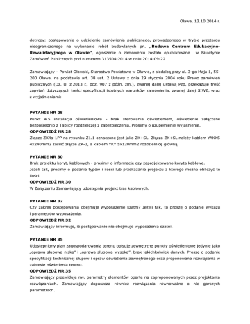 awa, 13.10.2014 r. dotyczy: post powania o udzielenie zamówienia publicznego, prowadzonego w trybie przetargu nieograniczonego na wykonanie robót budowlanych pn. „Budowa Centrum EdukacyjnoRewalidacyjnego w O awie”, og oszenie o zamóweniu zosta o opublikowane w Biuletynie Zamówie Publicznych pod numerem 313504-2014 w dniu 2014-09-22 Zamawiaj cy – Powiat O awski, Starostwo Powiatowe w O awie, z siedzib przy ul. 3-go Maja 1, 55200 O awa, na podstawie art. 38 ust. 2 Ustawy z dnia 29 stycznia 2004 roku Prawo zamówie publicznych (Dz. U. z 2013 r., poz. 907 z pó n. zm.), zwanej dalej ustaw zapyta Pzp, przekazuje tre dotycz cych tre ci specyfikacji istotnych warunków zamówienia, zwanej dalej SIWZ, wraz z wyja nieniami: PYTANIE NR 28 Punkt 4.5 instalacja o wietleniowa - brak sterowania o wietleniem, o wietlenie za czane bezpo rednio z Tablicy rozdzielczej z zabezpieczenia. Prosimy o uzupe nienie wyja nienie. ODPOWIED NR 28 cze ZK4a-1PP na rysunku Z1.1 oznaczone jest jako ZK+SL. Z cza ZK+SL nale y kablem YAKXS 4x240mm2 zasili z cze ZK-3, a kablem YKY 5x120mm2 rozdzielnic g ówn PYTANIE NR 30 Brak projektu koryt, kablowych - prosimy o informacj ozy zaprojektowano koryta kablowe. Je eli tak, prosimy o podanie typów i ilo ci lub przekazanie projektu z którego mo na obliczy te ilo ci. ODPOWIED NR 30 W Za czeniu Zamawiaj cy udost pnia projekt tras kablowych. PYTANIE NR 32 Czy zakres post powania obejmuje wyposa enie szatni? Je eli tak, to prosz o podanie wykazu i parametrów wyposa enia. ODPOWIED NR 32 Zamawiaj cy informuje, i post powanie nie obejmuje wyposa enia szatni. PYTANIE NR 35 Udost pniony plan zagospodarowania terenu opisuje zewn trzne punkty o wietleniowe jedynie jako „oprawa s upowa niska” i „oprawa s upowa wysoka”, brak jakichkolwiek danych. Prosz o podanie specyfikacji technicznej s upów i opraw o wietlenia zewn trznego oraz proponowane rozwi zania w zakresie o wietlenia terenu. ODPOWIED NR 35 Zamawiaj cy przewiduje nw. parametry elementów oparte na zaproponowanych przez projektanta rozwi zaniach. parametrach. Zamawiaj cy dopuszcza równie rozwi zania równowa ne o nie gorszych - oprawa s upowa niska Parametry: • Wysoko • :1,2 m rednica s upa przy podstawie/gruncie:Ø150 mm • Typ stosowanego betonu/kosza:B-0A / Z-0A • Stopie ochrony IP:IP 65 • Moc:21 W • Typ wiat a:CREE XT-E • Liczba/moc diod:8 / 16 W • Klasa izolacji:II • Wymiary podstawy :Ø150 mm Dane techniczne: Kod 45230/6/C… 45230/3/C… Temperatura barwowa wiat a [K] 5000 3500 Stopie ochrony IP IP 65 Klasa izolacji II Moc diod LED [W] 16 Liczba diod 8 Typ zastosowanych diod CREE XT-E Wspó czynnik oddawania barw CRI >75 Czas pracy diod L70 [h] >50 000 Napi cie zasilania [V] 100 - 240 AC Cz stotliwo napi cia zasilania [Hz] 50/60 Efektywno wietlna [lm/W] 50 48 Moc ca kowita [W] 21 Strumie wietlny* [lm] 1050 1000 Pr d zasilania [mA] 700 Wysoko s upka L [mm] 1200 rednica s upka D [mm] 150 Fundament / kosz zbrojeniowy B-0A / Z-0A Materia s upka aluminiowa rura cylindryczna Materia klosza PMMA Kolor klosza mro ony Dyrektywa niskonapi ciowa LVD 2006/95/WE, norma PN-EN 60598-1 • Dyrektywa EMC 2004/108/WE, normy: PN-EN 55015, PN-EN 61547, PN-EN 61000-3-2, PN-EN 61000-3-3 powierzchnia: aluminium szlifowane Przyk ad: http://rosa.pl/Oferta,category,1690,product,1685/oswietlenie_parkowe/kolumny_i_slupki_sa/kolu mny_i_slupki_karin_led/kolumny_i_slupki_karin_led/KARIN_1200_LED - oprawa s upowa wysoka SAL DECO-1 LED Parametry: • Wysoko • :4,36 m rednica s upa przy podstawie/gruncie:Ø132 mm • Typ stosowanego betonu/kosza:B-51A / Z-51A • Stopie ochrony IP:IP 65 • Moc:118 W • Typ wiat a:CREE MC-E NW • Waga:43,5 kg • Liczba/moc diod:12 / 106 W • Klasa izolacji:II Kod 42928 Klasa izolacji II stopie ochrony IP65 ród o wiat a diody CREE MC-E NW Temperatura barwowa wiat a [K] 4000-4500 Moc diod LED [W] 106 Liczba diod 12 Napi cie zasilania [V] 220-240 AC Cz stotliwo napi cia zasilania [Hz] 50/60 Moc ca kowita [W] 118 Strumie wietlny [lm] 7200 Pr d zasilania [A] 0,7 Wysoko kolumny [mm] 4350 rednica kolumny przy podstawie [mm] 132 Budowa osprz t elektryczny wbudowany w górnej cz ci s upa i zamkni ty szk em aroodpornym; daszek wraz z reflektorem zewn trznym w postaci wypuk ych, lustrzanych kwadratów; 3 ramiona cz ce s up z okr ym dachem Waga netto [kg] 43,5 Orientacyjna obj to jednostkowa [m3 ] 0,35 Typ fundamentu/kosza zbrojeniowego B-51A / Z-51A Kod fundamentu/kosza zbrojeniowego 311151A / 311251A Komplet elementów z cznych 4008, Dyrektywa niskonapi ciowa LVD 2006/95/WE, norma PN-EN 60598-1 • Dyrektywa EMC 2004/108/WE, normy: PN-EN 55015, PN-EN 61547, PN-EN 61000-3-2, PN-EN 61000-3-3 • powierzchnia: aluminium szlifowane • anodowanie w 12 kolorach • opcja malowania proszkowego wg RAL (inne farby na yczenie klienta) • opcja zabezpieczenia elastomerem w kolorze s upa do wysoko ci 350 mm (inna wysoko na yczenie klienta) • wn ka standard ROSA Przyk ad: http://rosa.pl/Oferta,category,1675,product,1677/oswietlenie_parkowe/kolumny_i_slupki_sa/kolu mny_sal_deco/kolumny_sal_deco/SAL_DECO_1_LED PYTANIE NR 36 Prosz o informacje czy w zakresie zadania nale y wykona zewn trzn iluminacj budynku. ODPOWIED NR 36 Zamawiaj cy informuje, i w zakresie zadania nale y wykona zewn trzn iluminacj budynku Zamawiaj cy jednocze nie informuje, i przedmiotowe zmiany nie prowadz do zmiany tre ci og oszenia o zamówieniu oraz, e przedmiotowe zmiany nale y traktowa jako jedyne obowi zuj ce natomiast pozosta e zapisy SIWZ pozostaj bez zmian. W za czeniu: 1. Projekt tras kablowych