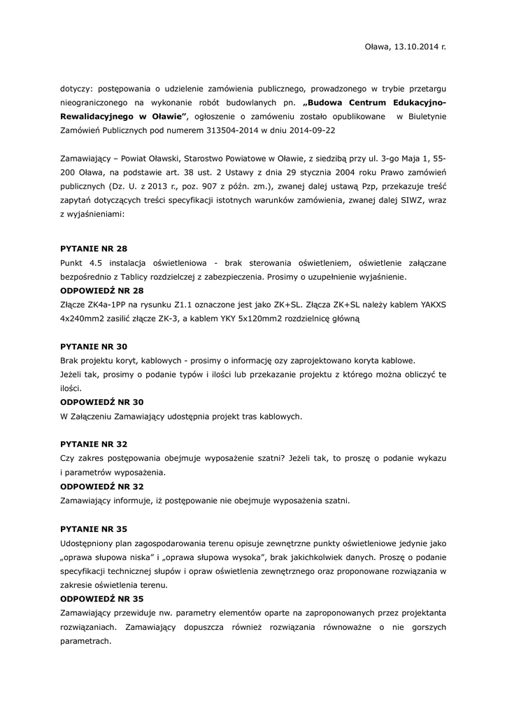 Oława, 13.10.2014 r. dotyczy: postępowania o udzielenie