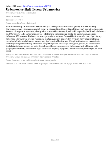 Adres URL strony http://www.emiasto.org/18759 Urbanowicz-Haft Teresa Urbanowicz Wrocław, 50-075, woj. dolnośląskie Ulica: Krupnicza 10 Telefon: 713417434 Strona www: http://www.haft.iaw.pl Haftowane obrusy ołtarzowe ok 200 wzorów (do każdego obrusu serwetka gratis), koronki, serwety liturgiczne, ornaty - (super promocje), ornaty z wizerunkiem (fotografia sublimacyjna) nowość!, chorągwie żałobne, chorągwie z papieżem, chorągwie z wizerunkiem świętych, sukienki na puszkę, bielizna kielichowa ok. 50 wzorów, palki haftowane nowość! z fotografią sublimacyjną, hostie do naszywania, aplikacje haftowane 350 wzorów. Poduszki na procesję, ozdoby, welony, fartuszki haftowane dla gospodyń, obrusy haftowane (do wystroju wnętrz świeckich - plebanie, domy) na dowolny wymiar, hafty okazjonalne na ręcznikach (imiona, dedykacje, monogramy itp. ), pościel haftowana. Usługi hafciarskie na zamówienie, konfekcja liturgiczna: obrusy ołtarzowe, szaty liturgiczne, sztandary, chorągwie gotowe, na zamówienie, konfekcja stołowa: obrusy, serwety, bieżniki, emblematy, proporczyki haftowane, haft reklamowy dla pielgrzymów (chusty, koszulki) z logo. Wszystkie artykuły wysyłamy za zaliczeniem pocztowym, na nasz koszt. Kategorie: Odzież i tkaniny Wrocław, Flagi, sztandary Wrocław, Usługi dla biznesu Wrocław, Flagi, sztandary Wrocław, Usługi dla każdego Wrocław, Dewocjonalia Wrocław Słowa kluczowe: hafty, emblematy haftowane, dewocjonalia Numer ID: 18759, liczba odsłon: 1099, aktywacja: 13/12/2007 12:17:36, edycja: 13/12/2007 12:17:36 Strona 1 / 1