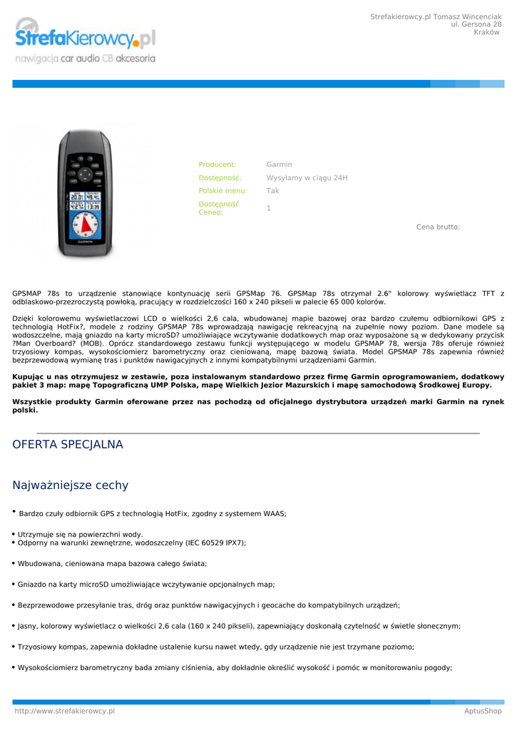 Strefakierowcy.pl Tomasz Wincenciak ul. Gersona 28 Kraków Producent: Garmin Dostępność: Wysyłamy w ciągu 24H Polskie menu: Tak Dostępność Ceneo: 1 Cena brutto: GPSMAP 78s to urządzenie stanowiące kontynuację serii GPSMap 76. GPSMap 78s otrzymał 2.6" kolorowy wyświetlacz TFT z odblaskowo-przezroczystą powłoką, pracujący w rozdzielczości 160 x 240 pikseli w palecie 65 000 kolorów. Dzięki kolorowemu wyświetlaczowi LCD o wielkości 2,6 cala, wbudowanej mapie bazowej oraz bardzo czułemu odbiornikowi GPS z technologią HotFix?, modele z rodziny GPSMAP 78s wprowadzają nawigację rekreacyjną na zupełnie nowy poziom. Dane modele są wodoszczelne, mają gniazdo na karty microSD? umożliwiające wczytywanie dodatkowych map oraz wyposażone są w dedykowany przycisk ?Man Overboard? (MOB). Oprócz standardowego zestawu funkcji występującego w modelu GPSMAP 78, wersja 78s oferuje również trzyosiowy kompas, wysokościomierz barometryczny oraz cieniowaną, mapę bazową świata. Model GPSMAP 78s zapewnia również bezprzewodową wymianę tras i punktów nawigacyjnych z innymi kompatybilnymi urządzeniami Garmin. Kupując u nas otrzymujesz w zestawie, poza instalowanym standardowo przez firmę Garmin oprogramowaniem, dodatkowy pakiet 3 map: mapę Topograficzną UMP Polska, mapę Wielkich Jezior Mazurskich i mapę samochodową Środkowej Europy. Wszystkie produkty Garmin oferowane przez nas pochodzą od oficjalnego dystrybutora urządzeń marki Garmin na rynek polski. OFERTA SPECJALNA Najważniejsze cechy Bardzo czuły odbiornik GPS z technologią HotFix, zgodny z systemem WAAS; Utrzymuje się na powierzchni wody. Odporny na warunki zewnętrzne, wodoszczelny (IEC 60529 IPX7); Wbudowana, cieniowana mapa bazowa całego świata; Gniazdo na karty microSD umożliwiające wczytywanie opcjonalnych map; Bezprzewodowe przesyłanie tras, dróg oraz punktów nawigacyjnych i geocache do kompatybilnych urządzeń; Jasny, kolorowy wyświetlacz o wielkości 2,6 cala (160 x 240 pikseli), zapewniający doskonałą czytelność w świetle słonecznym; Trzyosiowy kompas, zapewnia dokładne ustalenie kursu nawet wtedy, gdy urządzenie nie jest trzymane poziomo; Wysokościomierz barometryczny bada zmiany ciśnienia, aby dokładnie określić wysokość i pomóc w monitorowaniu pogody; http://www.strefakierowcy.pl AptusShop Strefakierowcy.pl Tomasz Wincenciak ul. Gersona 28 Kraków Interfejs USB 2.0 oraz obsługa protokołu NMEA 0183 Czas pracy: do 20 godzin; typ akumulatora: 2 sztuki, AA, zalecane NiMH lub litowe (nie są dołączone do urządzenia); Masa: 218,3 g (z akumulatorami). Eksploruj Urządzenie GPSMAP 78s posiada wbudowaną mapę bazową całego świata, więc można bez trudu podróżować w dowolne wybrane miejsce. Podobnie jak pozostałe urządzenia z serii 78, urządzenie 78s jest wodoszczelny (IPX7) i nawet unosi się na wodzie. Zorientuj się Urządzenie GPSMAP 78s posiada wbudowany 3-osiowy kompas elektroniczny z kompensacją nachylenia, który wskazuje kierunek nawet wtedy, gdy się nie przemieszczasz i nie trzymasz urządzenia poziomo. Natomiast wysokościomierz barometryczny monitoruje zmiany ciśnienia, aby precyzyjnie określić wysokość, na jakiej się znajdujesz. Można go również użyć do stworzenia wykresu rozkładu ciśnienia barometrycznego w czasie, co może ułatwić prognozowanie zmieniających się warunków pogodowych. Przesyłanie bezprzewodowe Za pomocą urządzenia GPSMAP 78s można bezprzewodowo udostępniać waypointy, trasy i geocache użytkownikom innych zgodnych urządzeń. Można w ten sposób przesłać znajomemu lokalizację swojego ulubionego miejsca połowów. Udostępnianie danych jest proste. Wystarczy nacisnąć ?Wyślij?, aby przesłać informacje do podobnych urządzeń. Ręczne urządzenie o dużej wydajności Z myślą o entuzjastach żeglarstwa i innych sportów wodnych, którzy poszukują najlepszych rozwiązań, wytrzymały ploter nawigacyjny GPSMAP 78s wyposażono w 3-osiowy kompas, wysokościomierz barometryczny, wyraźne, kolorowe mapy, odbiornik o wysokiej czułości, nowe gumowe uchwyty boczne oraz gniazdo kart microSD?, umożliwiające ładowanie dodatkowych map. Co więcej, unosi się na wodzie! Poznaj swoją pozycję Dzięki bardzo czułemu modułowi GPS z systemem WAAS i funkcją wstępnego ustalania pozycji HotFix? w oparciu o sygnał satelitarny urządzenie GPSMAP 78s szybko i precyzyjnie ustala pozycję użytkownika oraz nie traci pozycji GPS nawet w osłoniętych miejscach i głębokich kanionach. Korzyści są oczywiste ? bez względu na to, czy znajdujesz się w gęstym lesie, czy w pobliżu wysokich budynków lub drzew, system nawigacyjny GPSMAP 78s pomoże Ci odnaleźć drogę zawsze wtedy, gdy tego najbardziej potrzebujesz. Dodawaj mapy Dodawanie nowych map jest proste dzięki dużemu wyborowi szczegółowych map morskich, topograficznych i drogowych firmy Garmin, które są dostępne na karcie microSD. W prosty sposób włóż karty z fabrycznie załadowanymi mapami BlueChart? g2, aby wspaniale spędzić czas na wodzie, mapami TOPO aby odkrywać nieznane tereny lub z mapami City Navigator NT?, aby wyznaczać szczegółowe trasy samochodowe. Gniazdo kart znajduje się wewnątrz wodoszczelnej komory baterii, więc jest bezpieczne w razie zamoczenia urządzenia. Urządzenie GPSMAP 78s umożliwia także korzystanie z usługi BirdsEye? Satellite Imagery (wymagana subskrypcja), co pozwala na pobieranie obrazów satelitarnych do urządzenia i ich integrację z istniejącymi mapami. Ponadto urządzenie 78s jest zgodne z darmowym oprogramowaniem Custom Maps, które przekształca mapy tradycyjne i elektroniczne do postaci, w której można je pobrać do urządzenia. Bądź na bieżąco Po eksploracji nadchodzi czas na zapisanie i analizę aktywności. Dzięki prostemu połączeniu z komputerem oraz Internetem możesz uzyskać szczegółową analizę swoich aktywności oraz wysłać ślady do urządzenia outdoor za pomocą serwi