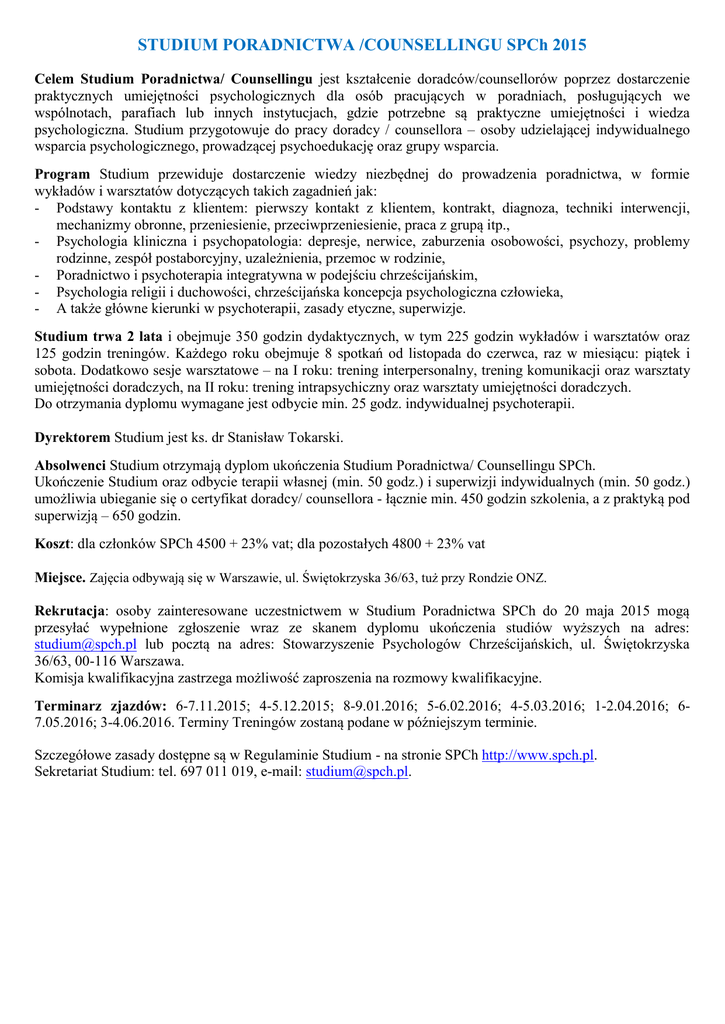 STUDIUM PORADNICTWA /COUNSELLINGU SPCh 2015 Celem Studium Poradnictwa/ Counsellingu jest kształcenie doradców/counsellorów poprzez dostarczenie praktycznych umiejętności psychologicznych dla osób pracujących w poradniach, posługujących we wspólnotach, parafiach lub innych instytucjach, gdzie potrzebne są praktyczne umiejętności i wiedza psychologiczna. Studium przygotowuje do pracy doradcy / counsellora – osoby udzielającej indywidualnego wsparcia psychologicznego, prowadzącej psychoedukację oraz grupy wsparcia. Program Studium przewiduje dostarczenie wiedzy niezbędnej do prowadzenia poradnictwa, w formie wykładów i warsztatów dotyczących takich zagadnień jak: - Podstawy kontaktu z klientem: pierwszy kontakt z klientem, kontrakt, diagnoza, techniki interwencji, mechanizmy obronne, przeniesienie, przeciwprzeniesienie, praca z grupą itp., - Psychologia kliniczna i psychopatologia: depresje, nerwice, zaburzenia osobowości, psychozy, problemy rodzinne, zespół postaborcyjny, uzależnienia, przemoc w rodzinie, - Poradnictwo i psychoterapia integratywna w podejściu chrześcijańskim, - Psychologia religii i duchowości, chrześcijańska koncepcja psychologiczna człowieka, - A także główne kierunki w psychoterapii, zasady etyczne, superwizje. Studium trwa 2 lata i obejmuje 350 godzin dydaktycznych, w tym 225 godzin wykładów i warsztatów oraz 125 godzin treningów. Każdego roku obejmuje 8 spotkań od listopada do czerwca, raz w miesiącu: piątek i sobota. Dodatkowo sesje warsztatowe – na I roku: trening interpersonalny, trening komunikacji oraz warsztaty umiejętności doradczych, na II roku: trening intrapsychiczny oraz warsztaty umiejętności doradczych. Do otrzymania dyplomu wymagane jest odbycie min. 25 godz. indywidualnej psychoterapii. Dyrektorem Studium jest ks. dr Stanisław Tokarski. Absolwenci Studium otrzymają dyplom ukończenia Studium Poradnictwa/ Counsellingu SPCh. Ukończenie Studium oraz odbycie terapii własnej (min. 50 godz.) i superwizji indywidualnych (min. 50 godz.) umożliwia ubieganie się o certyfikat doradcy/ counsellora - łącznie min. 450 godzin szkolenia, a z praktyką pod superwizją – 650 godzin. Koszt: dla członków SPCh 4500 + 23% vat; dla pozostałych 4800 + 23% vat Miejsce. Zajęcia odbywają się w Warszawie, ul. Świętokrzyska 36/63, tuż przy Rondzie ONZ. Rekrutacja: osoby zainteresowane uczestnictwem w Studium Poradnictwa SPCh do 20 maja 2015 mogą przesyłać wypełnione zgłoszenie wraz ze skanem dyplomu ukończenia studiów wyższych na adres: [email protected] lub pocztą na adres: Stowarzyszenie Psychologów Chrześcijańskich, ul. Świętokrzyska 36/63, 00-116 Warszawa. Komisja kwalifikacyjna zastrzega możliwość zaproszenia na rozmowy kwalifikacyjne. Terminarz zjazdów: 6-7.11.2015; 4-5.12.2015; 8-9.01.2016; 5-6.02.2016; 4-5.03.2016; 1-2.04.2016; 67.05.2016; 3-4.06.2016. Terminy Treningów zostaną podane w późniejszym terminie. Szczegółowe zasady dostępne są w Regulaminie Studium - na stronie SPCh http://www.spch.pl. Sekretariat Studium: tel. 697 011 019, e-mail: [email protected]. STUDIUM PORADNICTWA /COUNSELLINGU SPCh 2015 Program ramowy Bloki Tematyczne Treningi – self experience Wprowadzenie. Zagadnienia etyczne Psychologia kliniczna, psychopatologia Podstawy kontaktu z klientem Główne kierunki w psychoterapii Psychologia religii i duchowości Superwizje Treningi – self experience WUD - Warsztaty Umiejętności Doradczych Rok I Trening Interpersonalny 25 6 24 30 Rok II Trening Intrapsychiczny 25 18 8 14 8 Trening Komunikacji 25 WUD 25 14 8 WUD 25 Prowadzący zajęcia: 1. Baczewski Grzegorz – lekarz, pastor, counsellour, prowadzi poradnię chrześcijańską, wykładowca poradnictwa chrześcijańskiego w Wyższej Szkole Teologiczno-Społecznej 2. Giblewska Anna – psycholog, psychoterapeuta, Ośrodek Rodziny Warszawa-Bemowo, praktyka prywatna 3. Ks. prof. UKSW dr hab. Jaworski Romuald - psycholog, psychoterapeuta, superwizor, wykładowca UKSW, 4. Kaiser Katarzyna - Counsellor, terapeuta, Postgraduate Diploma in Counselling (Wielka Brytania). Prowadzi w Poznaniu Centrum Wsparcia Psychologicznego Agape oferując terapię indywidualną, terapię par, warsztaty rozwojowe oraz szkoleniowe 5. Karaś Aneta – psycholog, psychoterapeuta Instytutu Analizy Egzystencjalnej i Logoterapii 6. Kukier Agnieszka - mgr filozofii chrześcijańskiej, counsellour, absolwentka kursu DeIgnis, prowadzi poradnię rodzinną w parafii oraz praktykę prywatną 7. Maciocha Ewa - psycholog, seksuolog, Instytut Psychiatrii i Neurologii, SPCh 8. Małecka Hanna – psycholog, psychoterapeuta, specjalista interwencji kryzysowej, Ośrodek Pomocy Psychologicznej SPCh 9. Dr Próchniewicz Jolanta - psycholog, wykładowca UAM, SPCh, Poznań 10. Rusak Agata – psycholog, psychoterapeuta, superwizor, europejski certyfikat psychoterapeuty-ECP, SPCh 11. Stelmaszczyk Anna - terapeuta rodzinny i małżeński, specjalista terapii zespołu postaborcyjnego, europejski certyfikat psychoterapeuty - ECP, Polskie Towarzystwo Psychiatryczne, SPCh Łódź 12. Talmont Katarzyna - psychoterapeuta, superwizor, Centrum Psychologiczne SPCh 13. Tkaczuk Iwona – psychiatra, specjalista psychiatrii dzieci i młodzieży, Mazowieckie Centrum Neurorehabilitacji i Psychiatrii w Zagórzu k. Warszawy 14. Ks. dr Tokarski Stanisław - psycholog, psychoterapeuta, superwizor, Ośrodek Pomocy Psychologicznej SPCh, wiceprzewodniczący ZG SPCh 15. Zimna-Rycerz Ewa - psycholog, psychoterapeuta, Ośrodek Pomocy Psychologicznej SPCh ZGŁOSZENIE Proszę o zakwalifikowanie mnie na Studium Poradnictwa/ Counsellingu SPCh w edycji 2015 Imię i nazwisko ............................................................…….PESEL:………………................................ Data urodzenia:........................................................Miejsce urodzenia:….……………………….………… Adres:......................................................