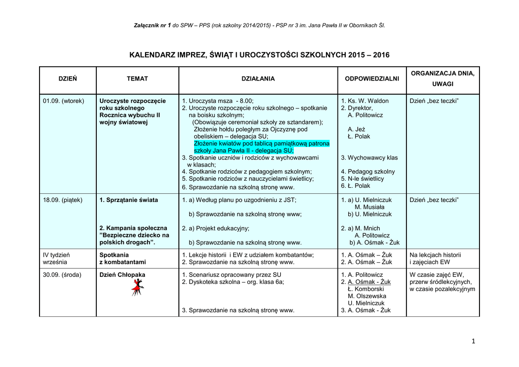 Załącznik nr 1 do SPW – PPS (rok szkolny 2014/2015) - PSP nr 3 im. Jana Pawła II w Obornikach Śl. KALENDARZ IMPREZ, ŚWIĄT I UROCZYSTOŚCI SZKOLNYCH 2015 – 2016 DZIEŃ 01.09. (wtorek) 18.09. (piątek) TEMAT Uroczyste rozpoczęcie roku szkolnego Rocznica wybuchu II wojny światowej 1. Sprzątanie świata DZIAŁANIA ODPOWIEDZIALNI 1. Uroczysta msza - 8.00; 2. Uroczyste rozpoczęcie roku szkolnego – spotkanie na boisku szkolnym; (Obowiązuje ceremoniał szkoły ze sztandarem); Złożenie hołdu poległym za Ojczyznę pod obeliskiem – delegacja SU; Złożenie kwiatów pod tablicą pamiątkową patrona szkoły Jana Pawła II - delegacja SU; 3. Spotkanie uczniów i rodziców z wychowawcami w klasach; 4. Spotkanie rodziców z pedagogiem szkolnym; 5. Spotkanie rodziców z nauczycielami świetlicy; 6. Sprawozdanie na szkolną stronę www. 1. Ks. W. Waldon 2. Dyrektor, A. Politowicz 1. a) Według planu po uzgodnieniu z JST; 1. a) U. Mielniczuk M. Musiała b) U. Mielniczuk b) Sprawozdanie na szkolną stronę www; ORGANIZACJA DNIA, UWAGI Dzień „bez teczki” A. Jeż Ł. Polak 3. Wychowawcy klas 4. Pedagog szkolny 5. N-le świetlicy 6. Ł. Polak Dzień „bez teczki” 2. Kampania społeczna ”Bezpieczne dziecko na polskich drogach”. 2. a) Projekt edukacyjny; IV tydzień września Spotkania z kombatantami 1. Lekcje historii i EW z udziałem kombatantów; 2. Sprawozdanie na szkolną stronę www. 1. A. Ośmak – Żuk 2. A. Ośmak – Żuk Na lekcjach historii i zajęciach EW 30.09. (środa) Dzień Chłopaka 1. Scenariusz opracowany przez SU 2. Dyskoteka szkolna – org. klasa 6a; 1. A. Politowicz 2. A. Ośmak - Żuk Ł. Komborski M. Olszewska U. Mielniczuk 3. A. Ośmak - Żuk W czasie zajęć EW, przerw śródlekcyjnych, w czasie pozalekcyjnym b) Sprawozdanie na szkolną stronę www. 3. Sprawozdanie na szkolną stronę www. 2. a) M. Mnich A. Politowicz b) A. Ośmak - Żuk 1 Załącznik nr 1 do SPW – PPS (rok szkolny 2014/2015) - PSP nr 3 im. Jana Pawła II w Obornikach Śl. 01.10. (czwartek) Wycieczki po regionie (z uwzględnieniem osoby Jana Pawła II) 1. Według programu wycieczek szkolnych; 2. Sprawozdanie na szkolną stronę www. 1. Wychowawcy klas 2. Wychowawcy klas Dzień „bez teczki” 07.10.(środa) Dzień Papieski – „Jan Paweł II – Patron Rodziny” 1. Montaż słowno – muzyczny – apel szkolny; 2. Gazetka tematyczna w holu szkoły; 3. Ogłoszenie konkursu na logo szkoły; W czasie zajęć EW i ZZW oraz religii 4. Sprawozdanie na szkolną stronę www. 1. A. Politowicz 2. ks. W. Waldon 3. J. Marcinkowska A. Politowicz 4. ks. W. Waldon 08.10. (czwartek) XV Pielgrzymka na Jasną Górę 1. Udział przedstawicieli SU w pielgrzymce na Jasną Górę. 2. Sprawozdanie na szkolna stronę www. 1. A. Politowicz Ł. Polak 2. Ł. Polak Wg programu pielgrzymki II tydzień października Dzień Edukacji Narodowej 1. Wystawa prac plastycznych i literackich uczniów z klas 0 - 3: „Moja szkoła, mój nauczyciel”; 1. B. Pałka M. Wolska W czasie zajęć EW i ZZW 16.10. (piątek) Pasowanie na Ucznia 1. Uroczyste pasowanie uczniów klas pierwszych; (Obowiązuje ceremoniał szkoły ze sztandarem); 1. M. Zachar, M. Wolska, Z. Zając, R. Kaczmarek 2. Z. Zając Dzień „bez teczki” dla klas 1 1. M. Mnich A. Jeż Ł. Polak 2. D. Kurpiewska Dzień „bez teczki” 1. Zajęcia tematyczne na lekcjach religii i zajęciach EW; 2. Tablica informacyjna związana ze świętem zmarłych, pamięcią o tych, którzy odeszli; 3. Zapalenie znicza pod Tablicą Patrona 4. Sprawozdanie na szkolną stronę www. 1. N-le religii i EW Prezentacja w holu, zajęcia EW, religii 1. Złożenie hołdu pod obeliskiem poległych za wolność naszej Ojczyzny – udział w uroczystościach gminnych; 1. wychowawcy klas, A. Politowicz 2. Sprawozdanie na szkolną stronę www. 27.10. (wtorek) Warsztaty profilaktyczne 1. Projekt edukacyjny; 2. Sprawozdanie na szkolną stronę www. 26 – 30.10. 11.11. (środa) „Pamiętamy o tych, którzy odeszli”. „Wspominamy Jana Pawła II – patrona szkoły” Narodowe Święto Niepodległości 2. ks. W. Waldon, 3. M. Wolska 4. M. Wolska Udział w gminnych obchodach 2 Załącznik nr 1 do SPW – PPS (rok szkolny 2014/2015) - PSP nr 3 im. Jana Pawła II w Obornikach Śl. 18.11. (środa) Narodowe Święto Niepodległości w szkole 1. Uroczysty apel z okazji Narodowego Święta Niepodległości; Obowiązuje ceremoniał szkoły ze sztandarem; 2. Dekoracja sali gimnastycznej; 1. J. Luty J. Marcinkowska 3. Tablice w holu; 4. Sprawozdanie na szkolną stronę www. 2. A. Ośmak - Żuk D. Przespolewska 3. M. Krupska 4. M. Mnich W czasie ZZW i zajęć EW oraz poza zajęciami lekcyjnymi 19.11. (czwartek) Wyjazdy edukacyjne – klasy 4 – 6 1. Według programów nauczania i wychowawczych. 2. Sprawozdanie na szkolną stronę www. 1 - 2. Wychowawcy klas Dzień „bez teczki” dla uczniów kl. 4 – 6 20.11. (piątek) Wyjazdy edukacyjne – klasy 1 – 3 1. Według programów nauczania i wychowawczych. 2. Sprawozdanie na szkolną stronę www. 1 - 2. Wychowawcy klas Dzień „bez teczki” dla uczniów kl. 1 – 3 26.11. (czwartek) Andrzejki – zwyczaje i obrzędy 1. Zabawy i wróżby andrzejkowe w klasach 1 – 3; 2. Dyskoteka – org. klasa 6b; 1. N-le kl. EW 2. Ł. Komborski M. Krupska A. Politowicz J. Domerecka M. Jastrzębska 3. kl. 1-3 – K. Bosak kl. 4-6 Ł. Komborski kl. 1-3 w czasie zajęć EW, kl. 4-6 po zajęciach lekcyjnych 1. Apel szkolny - Deklaracja prawa dziecka Informacje o wolontariacie – zapowiedź akcji: Góra grosza, Mikołajki (Caritas), WOŚP; 2. Sprawozdanie na szkolną stronę www. 1. M. Mnich A. Politowicz W czasie zajęć EW i ZZW 3. Sprawozdanie na szkolną stronę www. 02.12. (środa) Apel informacyjny 2. M. Mnich 07.12. (poniedziałek) Mikołajki na sportowo 1. Projekt edukacyjny – Sportowy Turniej Mikołajkowy 2. Rozdanie paczek przez św. Mikołaja – uczniowie z kl. 6c 3. Sprawozdanie na szkolną stronę www. 1. A. Jeż Ł. Polak 2. A. Politowicz 3