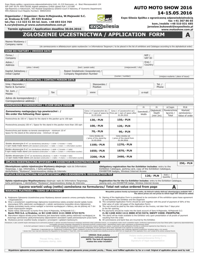 Expo Silesia spółka z ograniczoną odpowiedzialnością (Ltd), 41-219 Sosnowiec, ul. Braci Mieroszewskich 124 NIP (VAT ID) PL 9591726258, Kapitał zakładowy (Initial capital) PLN 1.227.000 Sąd Rejonowy w Katowicach, VIII Wydział Gospodarczy (District Court in Katowice, 8th Economic Department) KRS (National Court Registry Number) 0000252032 AUTO MOTO SHOW 2016 14-15.05.2016 Organizator / Organizer: Sens H.Majewska, W.Majewski S.C. ul. Krakusa 8/105 , 30-535 Kraków tel./fax +12 423 51 84 tel. kom. +48 693 024 769 [email protected] www.automotoshow.com.pl Expo Silesia Spółka z ograniczoną odpowiedzialnością fax +41 367 86 65 kom./mobile +48 510 031 685 [email protected] www.motoshow.com.pl Termin zgłoszeń / Application deadline 30.04.2016 A ZGŁOSZENIE UCZESTNICTWA / APPLICATION FORM Nazwa Wystawcy / Company name (do zamieszczenia w alfabetycznym spisie wystawców i w Informatorze Targowym / to be placed in the list of exhibitors and Catalogue according to the alphabetical order) DANE DO FAKTURY / INVOICE DATA Firma / Company NIP / VAT ID Adres / Address Kraj / Country (ulica / street) (kod / postal code) Kapitał Zakładowy / Initial Capital (miejscowość / city) Rejest Działalności Gospodarczej / Company Registration Number (numer / number) (miejsce wydania / place of issue) DANE OSOBY DO KONTAKTU / CONTACT PERSON DATA Imię i Nazwisko / Name & Surname Stanowisko / Position Tel. kom. / Mobile Tel. / Phone www fax e-mail Adres do korespondencji / Correspondence address ZAMÓWIENIE POWIERZCHNI / FLOOR SPACE ORDER m2/sqm PLN Wartość Głębokość / Powierzchnia Cena 1 m powierzchni do / Cena 1 m powierzchni od / Szerokość / łącznie / Price per 1 sqm of space by Price per 1 sqm of space after zamówienia / Depth Width 01.04.2016 31.03.2016 Total Value of order (min 2m) m Zamawiamy następujący typ powierzchni : / We order the following floor space : m 2 2 2 Powierzchnia do 150 m / Space for the stand in the pavilon up to 150 sqm 130,- PLN 150,- PLN 100,- PLN 120,- PLN 2 Powierzchnia powyżej 150 m / Space for the stand in the pavilon more than 150 sqm Powierzchnia pod stoisko na terenie zewnętrznym - minimum 10 m2 Space for the stand at the external area - minimum 10 sqm 70,- PLN 90,- PLN Cena stoiska do / price of the stand by 31.03.2016 2 Stoisko akcesoryjne 6 m (ze standardową zabudową + 1 stolik + 2 krzesła + 1 lada) 6 sqm ready-made stand (with standard construction + 1 table + 2 chairs + 1 information counter) Cena stoiska od / price of the stand from 01.04.2016 1100,- PLN 1270,- PLN 1650,- PLN 1870,- PLN 2200,- PLN 2490,- PLN 2 Stoisko akcesoryjne 9 m (ze standardową zabudową + 1 stolik + 2 krzesła + 1 lada) 9 sqm ready-made stand (with standard construction + 1 table + 2 chairs + 1 information counter) 2 Stoisko akcesoryjne 12 m (ze standardową zabudową + 1 stolik + 4 krzesła + lada) 12 sqm ready-made stand (with standard construction + 1 table + 4 chairs + 1 information counter) OPŁATA REJESTRACYJNA WYSTAWCY / EXHIBITOR’S REGISTRATION FEE Obowiązkowa opłata rejestracyjna Wystawcy obejmuje: wpis do Informatora Targowego, 1 egz. Informatora, 1 karta parkingowa, identyfikatory “Wystawca”, bezprzewodowy dostęp do Internetu 250,- PLN Obligatory registration fee for Exhibitor includes: entry to the Exhibition Catalogue, parking card, copy of the Exhibition Catalogue, EXHIBITOR badges, Wireless Internet Access OPŁATA REJESTRACYJNA WSPÓŁWYSTAWCY / CO-EXHIBIOTR’S REGISTRATION FEE Opłata rejestracyjna Współwystawcy obejmuje: wpis do Informatora Targowego, karta parkingowa, 1 identyfikator “Wystawca”, bezprzewodowy dostęp do Internetu 120,- PLN Ilość / Quantity Registration fee for the Co-Exhibitor includes: entry to the Exhibition Catalogue, parking card, one EXHIBITOR badge, Wireless Internet Access Łączna wartość usług (netto) zamówiona na formularzu/ Total net value ordered from page WARUNKI PŁATNOŚCI / TERMS OF PAYMENT A Wszystkie podane kwoty są kwotami netto, do których należy doliczyć obowiązujący podatek VAT. / The above prices are net prices to which legal VAT should be added. 1. Podpisanie Zgłoszenia Uczestnictwa przez Wystawcę stanowi zawarcie umowy pomiędzy Wystawcą i Organizatorem. 2. Wraz z przesłaniem wypełnionego Zgłoszenia Uczestnictwa należy przesłać dowód wpłaty kwoty stanowiącej 50% należności wynikających z całości zamówienia (wszystkie strony Zgłoszenia). 3. Wpłata pozostałej kwoty winna nastąpić w terminie wynikającym z faktury, ale nie później niż 7 dni przed rozpoczęciem targów. 4. Wpłat należy dokonywać na konto firmy Sens H.Majewska, W.Majewski S.C.: Bank PKO S.A. o/Kraków, nr 82 1240 4432 1111 0000 4723 9274. 5. Warunkiem objęcia stoiska przez Wystawcę jest dokonanie wpłaty pełnej należności wynikającej ze złożonego zamówienia udokumentowanej odpowiednimi dowodami wpłat potwierdzonymi przez bank. 6. Wystawca ponosi wszelkie koszty związane z prowizjami i opłatami bankowymi. 1. Signing of the Application Form is considered to be conclusion of the exhibition space lease agreement by and between the Exhibitor and the Organizer. 2. The completed Application Forms should be sent together with the proof of payment of 50% of the total value of order (all pages of the Application Form). 3. The rest should be paid by the date indicated on the invoice, not later than 7 days prior to the fair opening. 4. The payments should be made into the bank account of Sens H.Majewska, W.Majewski S.C: PL 82 1240 4432 1111 0000 4723 9274; SWIFT CODE: PKOPPLPW. 5. The stand will be made available to the Exhibitor only upon presentation of all proofs of payment resulting from the order. 6. All commissions and bank fees are incurred by the Exhibitor. Oświadczam, iż jako uczestnik targów zobowiązuje się do zachowania poufności w zakresie warunków finansowych niniejszego zamówienia wobec podmiotów trzecich, a w szczególności wobec innych uczestników targów i konfer