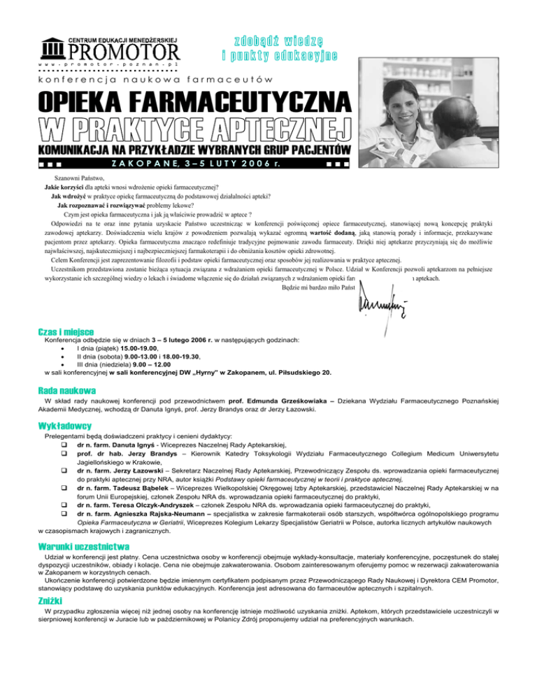 w w w . p r o m o t o r . p o z n a n . p l ▪▪▪▪▪▪▪▪▪▪▪▪▪▪▪▪▪▪▪▪▪▪▪▪▪▪▪▪▪▪▪ konferencja naukowa farmaceutów OPIEKA FARMACEUTYCZNA KOMUNIKACJA NA PRZYKŁADZIE WYBRANYCH GRUP PACJENTÓW ■■■ Z A K O P A N E, 3 – 5 L U T Y 2 0 0 6 r. ■■■ Szanowni Państwo, Jakie korzyści dla apteki wnosi wdrożenie opieki farmaceutycznej? Jak wdrożyć w praktyce opiekę farmaceutyczną do podstawowej działalności apteki? Jak rozpoznawać i rozwiązywać problemy lekowe? Czym jest opieka farmaceutyczna i jak ją właściwie prowadzić w aptece ? Odpowiedzi na te oraz inne pytania uzyskacie Państwo uczestnicząc w konferencji poświęconej opiece farmaceutycznej, stanowiącej nową koncepcję praktyki zawodowej aptekarzy. Doświadczenia wielu krajów z powodzeniem pozwalają wykazać ogromną wartość dodaną, jaką stanowią porady i informacje, przekazywane pacjentom przez aptekarzy. Opieka farmaceutyczna znacząco redefiniuje tradycyjne pojmowanie zawodu farmaceuty. Dzięki niej aptekarze przyczyniają się do możliwie najwłaściwszej, najskuteczniejszej i najbezpieczniejszej farmakoterapii i do obniżania kosztów opieki zdrowotnej. Celem Konferencji jest zaprezentowanie filozofii i podstaw opieki farmaceutycznej oraz sposobów jej realizowania w praktyce aptecznej. Uczestnikom przedstawiona zostanie bieżąca sytuacja związana z wdrażaniem opieki farmaceutycznej w Polsce. Udział w Konferencji pozwoli aptekarzom na pełniejsze wykorzystanie ich szczególnej wiedzy o lekach i świadome włączenie się do działań związanych z wdrażaniem opieki farmaceutycznej w swoich aptekach. Będzie mi bardzo miło Państwa gościć Tadeusz Gryglewicz Czas i miejsce Konferencja odbędzie się w dniach 3 – 5 lutego 2006 r. w następujących godzinach: • I dnia (piątek) 15.00-19.00, • II dnia (sobota) 9.00-13.00 i 18.00-19.30, • III dnia (niedziela) 9.00 – 12.00 w sali konferencyjnej w sali konferencyjnej DW „Hyrny” w Zakopanem, ul. Piłsudskiego 20. Rada naukowa W skład rady naukowej konferencji pod przewodnictwem prof. Edmunda Grześkowiaka – Dziekana Wydziału Farmaceutycznego Poznańskiej Akademii Medycznej, wchodzą dr Danuta Ignyś, prof. Jerzy Brandys oraz dr Jerzy Łazowski. Wykładowcy Prelegentami będą doświadczeni praktycy i cenieni dydaktycy: dr n. farm. Danuta Ignyś - Wiceprezes Naczelnej Rady Aptekarskiej, prof. dr hab. Jerzy Brandys – Kierownik Katedry Toksykologii Wydziału Farmaceutycznego Collegium Medicum Uniwersytetu Jagiellońskiego w Krakowie, dr n. farm. Jerzy Łazowski – Sekretarz Naczelnej Rady Aptekarskiej, Przewodniczący Zespołu ds. wprowadzania opieki farmaceutycznej do praktyki aptecznej przy NRA, autor książki Podstawy opieki farmaceutycznej w teorii i praktyce aptecznej, dr n. farm. Tadeusz Bąbelek – Wiceprezes Wielkopolskiej Okręgowej Izby Aptekarskiej, przedstawiciel Naczelnej Rady Aptekarskiej w na forum Unii Europejskiej, członek Zespołu NRA ds. wprowadzania opieki farmaceutycznej do praktyki, dr n. farm. Teresa Olczyk-Andryszek – członek Zespołu NRA ds. wprowadzania opieki farmaceutycznej do praktyki, dr n. farm. Agnieszka Rajska-Neumann – specjalistka w zakresie farmakoteraii osób starszych, współtwórca ogólnopolskiego programu Opieka Farmaceutyczna w Geriatrii, Wiceprezes Kolegium Lekarzy Specjalistów Geriatrii w Polsce, autorka licznych artykułów naukowych w czasopismach krajowych i zagranicznych. Warunki uczestnictwa Udział w konferencji jest płatny. Cena uczestnictwa osoby w konferencji obejmuje wykłady-konsultacje, materiały konferencyjne, poczęstunek do stałej dyspozycji uczestników, obiady i kolacje. Cena nie obejmuje zakwaterowania. Osobom zainteresowanym oferujemy pomoc w rezerwacji zakwaterowania w Zakopanem w korzystnych cenach. Ukończenie konferencji potwierdzone będzie imiennym certyfikatem podpisanym przez Przewodniczącego Rady Naukowej i Dyrektora CEM Promotor, stanowiący podstawę do uzyskania punktów edukacyjnych. Konferencja jest adresowana do farmaceutów aptecznych i szpitalnych. Zniżki W przypadku zgłoszenia więcej niż jednej osoby na konferencję istnieje możliwość uzyskania zniżki. Aptekom, których przedstawiciele uczestniczyli w sierpniowej konferencji w Juracie lub w październikowej w Polanicy Zdrój proponujemy udział na preferencyjnych warunkach. w w w . p r o m o t o r . p o z n a n . p l ▪▪▪▪▪▪▪▪▪▪▪▪▪▪▪▪▪▪▪▪▪▪▪▪▪▪▪▪▪▪▪ Zgłoszenie udziału Zgłoszenia udziału w konferencji (formularz dostępny w biurze CEM Promotor) będą przyjmowane do dnia 14 stycznia 2006 r., a opłaty do 27 stycznia. Ilość miejsc jest ograniczona do 30 uczestników, decyduje kolejność zgłoszeń. Szczegółowe informacje o programie i sposobie organizacji konferencji dostępne są w biurze Centrum, pod nr telefonu (0-61) 8552314 w godzinach 8:00 do 15:00 lub pod telefonem komórkowym 0501-474245 (bez ograniczeń czasowych). Punkty edukacyjne Uczestnicy mają możliwość uzyskania 25 „miękkich” punktów edukacyjnych w czasie w konferencji mimo teoretycznej możliwości zdobycia 26 punktów (zgodnie z rozporządzeniem Ministra Zdrowia), tj.: 6 punktów za uczestnictwo (po 2 za każdy dzień), 10 punktów za przedstawienie komunikatu naukowego w czasie panelu referatów poświęconych opiece farmaceutycznej, 10 punktów za przedstawienie posteru / plakatu promującego opiekę farmaceutyczną i zaprezentowanie go w czasie konferencji (format minimum A3), Komunikaty (maks. do 5000 znaków) w wersji elektronicznej prosimy przesyłać na adres: [email protected], w tytule umieszczając Komunikat Zakopane, do dnia 30 stycznia. Najlepsze prace zostaną nagrodzone. ■■■PROGRAM KONFERENCJI■■■ piątek 15.00 – 17.00 █ dr n. farm. Jerzy Łazowski Opieka farmaceutyczna – najważniejsze aspekty praktyczne 17.00 – 19.00 █ prof. dr hab. Jerzy Brandys