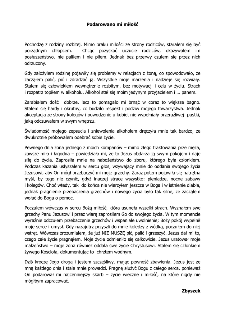 Podarowano mi miłość Pochodzę z rodziny rozbitej. Mimo braku miłości ze strony rodziców, starałem się być porządnym chłopcem. Chcąc pozyskać uczucie rodziców, okazywałem im posłuszeństwo, nie paliłem i nie piłem. Jednak bez przerwy czułem się przez nich odrzucony. Gdy założyłem rodzinę pojawiły się problemy w relacjach z żoną, co spowodowało, że zacząłem palić, pić i zdradzać ją. Wszystkie moje marzenia i nadzieje się rozwiały. Stałem się człowiekiem wewnętrznie rozbitym, bez motywacji i celu w życiu. Strach i rozpatrz topiłem w alkoholu. Alkohol stał się moim jedynym przyjacielem i … panem. Zarabiałem dość dobrze, lecz to pomagało mi brnąć w coraz to większe bagno. Stałem się hardy i okrutny, co budziło respekt i podziw mojego towarzystwa. Jednak akceptacja ze strony kolegów i powodzenie u kobiet nie wypełniały przeraźliwej pustki, jaką odczuwałem w swym wnętrzu. Świadomość mojego zepsucia i zniewolenia alkoholem dręczyła mnie tak bardzo, że dwukrotnie próbowałem odebrać sobie życie. Pewnego dnia żona jednego z moich kompanów – mimo złego traktowania prze męża, zawsze miła i łagodna – powiedziała mi, że to Jezus obdarza ją swym pokojem i daje siłę do życia. Zaprosiła mnie na nabożeństwo do zboru, którego była członkiem. Podczas kazania usłyszałem w sercu głos, wzywający mnie do oddania swojego życia Jezusowi, aby On mógł przebaczyć mi moje grzechy. Zaraz potem pojawiła się natrętna myśl, by tego nie czynić, gdyż inaczej stracę wszystko: pieniądze, nocne zabawy i kolegów. Choć wtedy, tak do końca nie wierzyłem jeszcze w Boga i w istnienie diabła, jednak pragnienie przebaczenia grzechów i nowego życia było tak silne, że zacząłem wołać do Boga o pomoc. Poczułem wówczas w sercu Bożą miłość, która usunęła wszelki strach. Wyznałem swe grzechy Panu Jezusowi i przez wiarę zaprosiłem Go do swojego życia. W tym momencie wyraźnie odczułem przebaczenie grzechów i wspaniałe uwolnienie; Boży pokój wypełnił moje serce i umysł. Gdy nazajutrz przyszli do mnie koledzy z wódką, poczułem do niej wstręt. Wówczas zrozumiałem, że już NIE MUSZĘ pić, palić i grzeszyć. Jezus dał mi to, czego całe życie pragnąłem. Moje życie odmieniło się całkowicie. Jezus uratował moje małżeństwo – moje żona również oddała swe życie Chrystusowi. Stałem się członkiem żywego Kościoła, dokumentując to chrztem wodnym. Dziś kroczę Jego drogą i jestem szczęśliwy, mając pewność zbawienia. Jezus jest ze mną każdego dnia i stale mnie prowadzi. Pragnę służyć Bogu z całego serca, ponieważ On podarował mi najcenniejszy skarb – życie wieczne i miłość, na które nigdy nie mógłbym zapracować. Zbyszek
