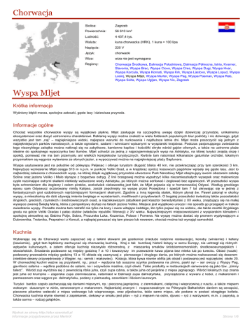 Chorwacja Stolica: Zagrzeb Powierzchnia: 56 610 km² Ludność: 4 437,4 tys. Waluta: kuna chorwacka (HRK), 1 kuna = 100 lipa Napięcie: 220 V Język: chorwacki Wiza: wiza nie jest wymagana Regiony: Chorwacja Środkowa, Dalmacja Południowa, Dalmacja Północna, Istria, Kvarner, Slavonia, Wyspa Brac, Wyspa Ciovo, Wyspa Cres, Wyspa Dugi, Wyspa Hvar, Wyspa Korcula, Wyspa Kornati, Wyspa Krk, Wyspa Lastovo, Wyspa Lopud, Wyspa Losinj, Wyspa Mljet, Wyspa Murter, Wyspa Pag, Wyspa Pasman, Wyspa Rab, Wyspa Solta, Wyspa Ugljan, Wyspa Vis, Zagrzeb Wyspa Mljet Krótka informacja Wyśniony błękit morza, spokojne zatoczki, gęste lasy i dziewicza przyroda. Informacje ogólne Chociaż wszystkie chorwackie wyspy są wyjątkowo piękne, Mljet zasługuje na szczególną uwagę dzięki dziewiczej przyrodzie, unikalnemu ekosystemowi oraz dosyć ustronnemu charakterowi. Reklamę wyspy można znaleźć w wielu folderach popularnych biur podróży i nic dziwnego, gdyż wszystko jest tam „naj” – najpiękniejsze widoki, najlepsze warunki do nurkowania i najdłuższe letnie dni. Mljet może poszczycić się jednym z najpiękniejszych parków narodowych, a także ogrodami, sadami i winnicami wpisanymi w wyspiarski krajobraz. Podczas pasjonującego zwiedzania tego niezwykłego zakątka można natknąć się na zabytkowe, kamienne kaplice i kościółki skryte wśród gajów oliwnych, a także na ustronne plaże idealne do spokojnego wypoczynku bez tłumów. Mljet uchodzi za jedną z najprzyjemniejszych wysp na Adriatyku, na której turyści znajdą ciszę i spokój, ponieważ nie ma tam przemysłu ani wielkich kompleksów turystycznych. Kwitnie tam natomiast kilkanaście gatunków orchidei, lokalnym przysmakiem są węgorze wyławiane ze słonych jezior, a wypoczywać można na najpiękniejszej plaży Saplunara. Wyspa usytuowana jest na południe od półwyspu Peljesac i oferuje turystom długość blisko 40 km, nie przekraczając przy tym szerokości 3 km. Najwyższe wzniesienie Mljet osiąga 513 m n.p.m. w punkcie Veliki Grad, a w krajobraz oprócz krasowych pagórków wpisały się gęste lasy. Jest to najbardziej zalesiona z chorwackich wysp, na której dzięki wyjątkowej przyrodzie utworzono Park Narodowy Mljet obejmujący swoim obszarem zatokę Soline oraz jeziora Veliko i Malo słynące z bogactwa ostryg. Z linii brzegowej można wypatrzyć kilka niezamieszkałych wysepek oraz malownicze cyple rozcinające ostrymi skałami niekiedy wzburzone wody Adriatyku, po których można serfować i żeglować bez ograniczeń. W przeszłości wyspa była schronieniem dla żeglarzy i celem piratów, aczkolwiek ciekawostką jest fakt, że Mljet pojawia się w homerowskiej Odysei. Według greckiego eposu sam Odyseusz oczarowany nimfą Kalipso, został zepchnięty na wyspę przez Posejdona i spędził tam 7 lat ukrywając się w jednej z fantastycznych grot ozdobionych najróżniejszymi formacjami skalnymi. Zgodnie z inną legendą statek, którym płynął św. Paweł zatonął w okolicy wyspy, a mieszkańcy do dziś używają imienia świętego w wyrażeniach, modlitwach i przysłowiach. O bogatej przeszłości świadczą także pozostałości iliryjskich, greckich, rzymskich i średniowiecznych osad, a najciekawszym zabytkiem jest klasztor benedyktyński z XII wieku, znajdujący się na małej wysepce zwanej Świętą Marią, która z perspektywy dryfuje na falach jeziora Veliko. Miejsce jest wyjątkowo urocze i nie sposób go przegapić w trakcie zwiedzania wyspy. Ponadto można tam natrafić nie tylko na kozy i owce witające każdego, kto tylko pojawi się na widoku, ale także resztki iliryjskiego grodu na górze Veliki Gradac i pałac dożów (władców republiki Wenecji) z XV wieku. Najważniejszymi miejscowościami z wyspiarskim klimatem i spokojną atmosferą są: Babino Polje, Sobra, Prozurska Luka, Kozanica, Polace i Pomena. Na wyspę można dostać się promem wypływającym z Dubrownika, Trstenika, Prapratno i z Korculi, a najlepiej poruszać się tam pieszo lub rowerem, chociaż można też wynająć samochód. Kuchnia Wybierając się do Chorwacji warto zapoznać się z takimi słowami jak gostionice (nieduże rodzinne restauracje), konoby (winiarnie) i kafany (kawiarnie), gdyż tam będziemy zachwycać się chorwacką kuchnią. Kraj o tak burzliwej historii leżący w sercu Europy, nie ustrzegł się różnych wpływów kulturowych, a zatem oferuje kuchnię niezwykle różnorodną, z mieszanką smaków śródziemnomorskich, środkowoeuropejskich i słowiańskich. Śniadania podawane są między godziną 7 a 10 i towarzyszy im przeważnie kawa pijana bez mleka lub po turecku. Obiad (rucak) podawany przeważnie między godziną 13 a 15 składa się zazwyczaj z pierwszego i drugiego dania, po których można rozkoszować się deserem (niektóre desery przywędrowały z Węgier, np.: sernik i makowiec). Kolacja, która bywa równie obfita jak obiad i podawana jest najczęściej około 20. W chorwackiej kuchni ważne są przystawki, np.: prsut – wędzona lub suszona szynka podawana na zimno, paski syr – ser owczy z Wyspy Pag, gavrilocic salama – wędlina podobna do salami, no i oczywiście masline, czyli oliwki. Takie produkty w restauracjach serwowane są jako tzw. „zimny talerz”. Wśród zup wyróżnia się z pewnością riblia juha, czyli zupa rybna, a także juha od jenjetine z mięsa jagnięcego. Wśród lokalnych zup znana jest juha od krumpira – zagorska zupa ziemniaczana, natomiast w Dalmacji zupa dalmatyńska, przyrządzona z wywaru z kości, z makaronem i parmezanem oraz węgorz po dalmatyńsku, podany z pietruszką, czosnkiem i liściem laurowym. Turyści bardzo często zachwycają się daniami mięsnymi, np.: pieczoną jagnięciną z ziemniakami, cielęciną i wieprzowiną z rusztu, a także mięsem wołowym duszonym w winie, serwowanym z makaronem. Najbardziej znanym i rozpoznawalnym na Półwyspie Bałkańskim daniem są cevapcici, pieczone pikantne wałeczki z mięsa wołowego